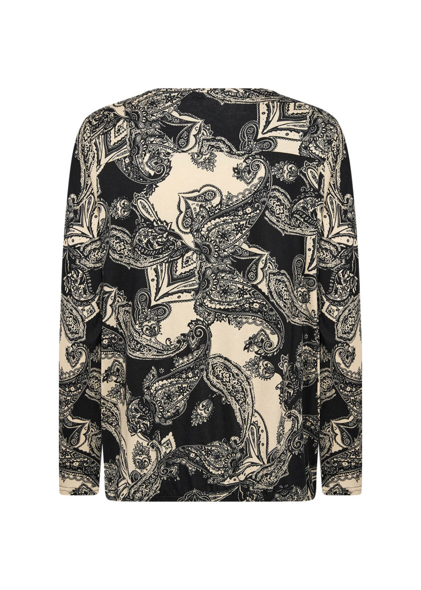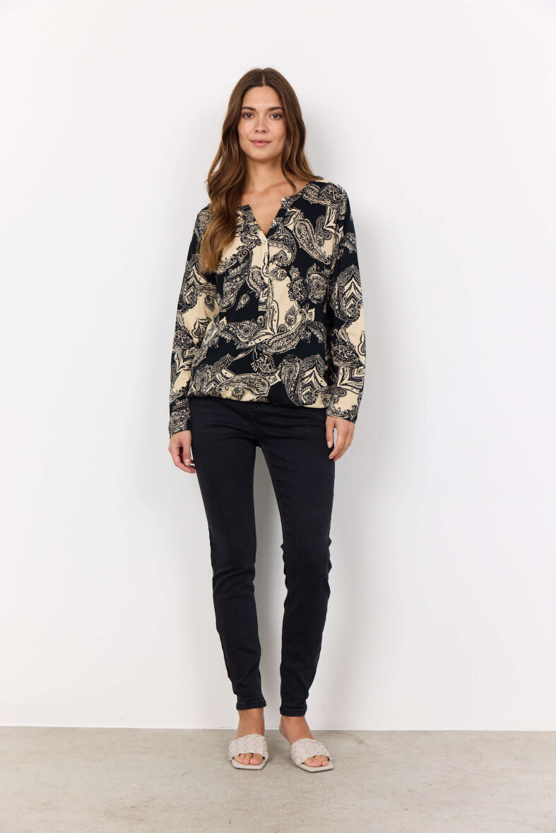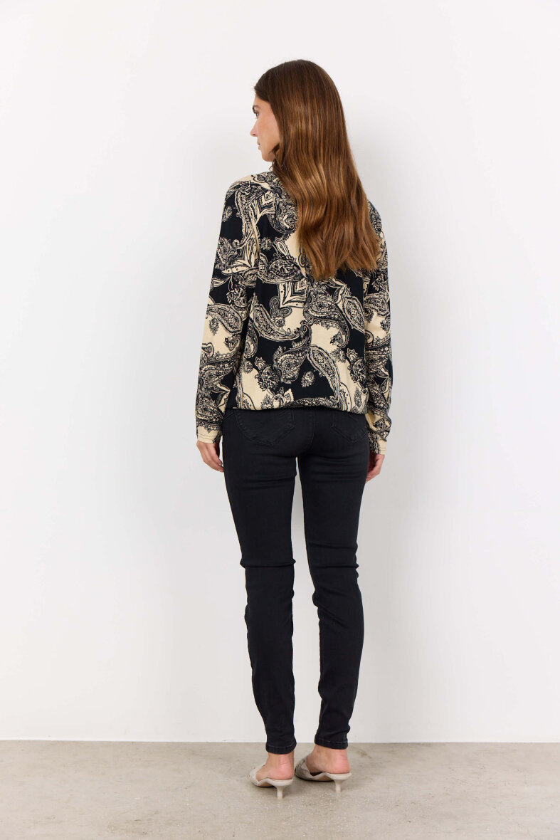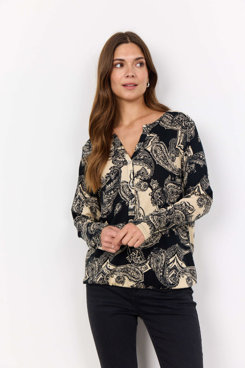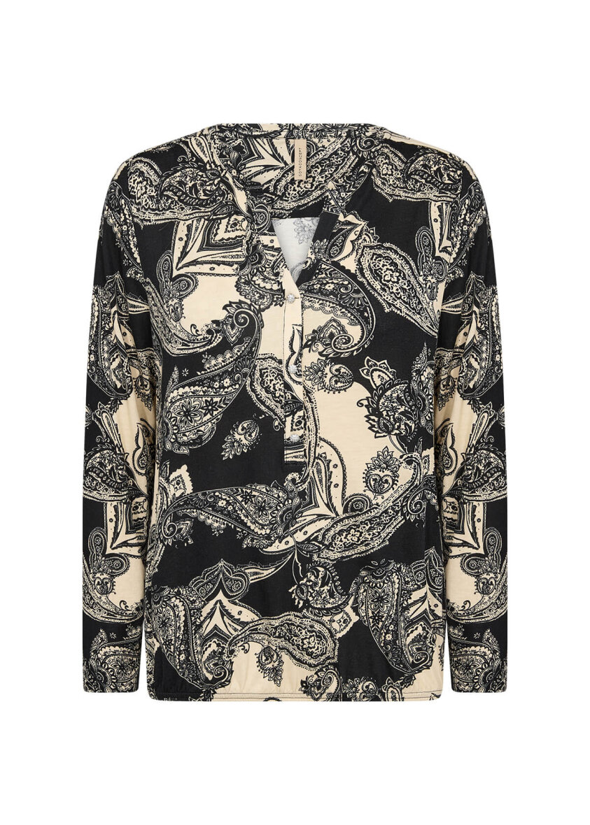 Flot og feminin bluse fra Soyaconcept. Blusen er lavet i et flot paisley print i sort og hvid.
