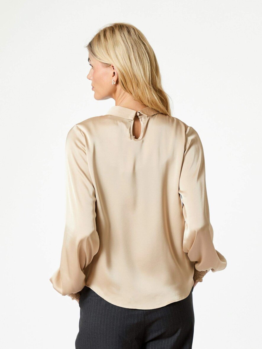 Blusen er med rund hals med en fin knude detalje ved, som giver blusen en fin detalje. Blusens lange ærmer er med en påsyet kant med smock ved håndledet, som giver en flot ballon effekt til ærmet.