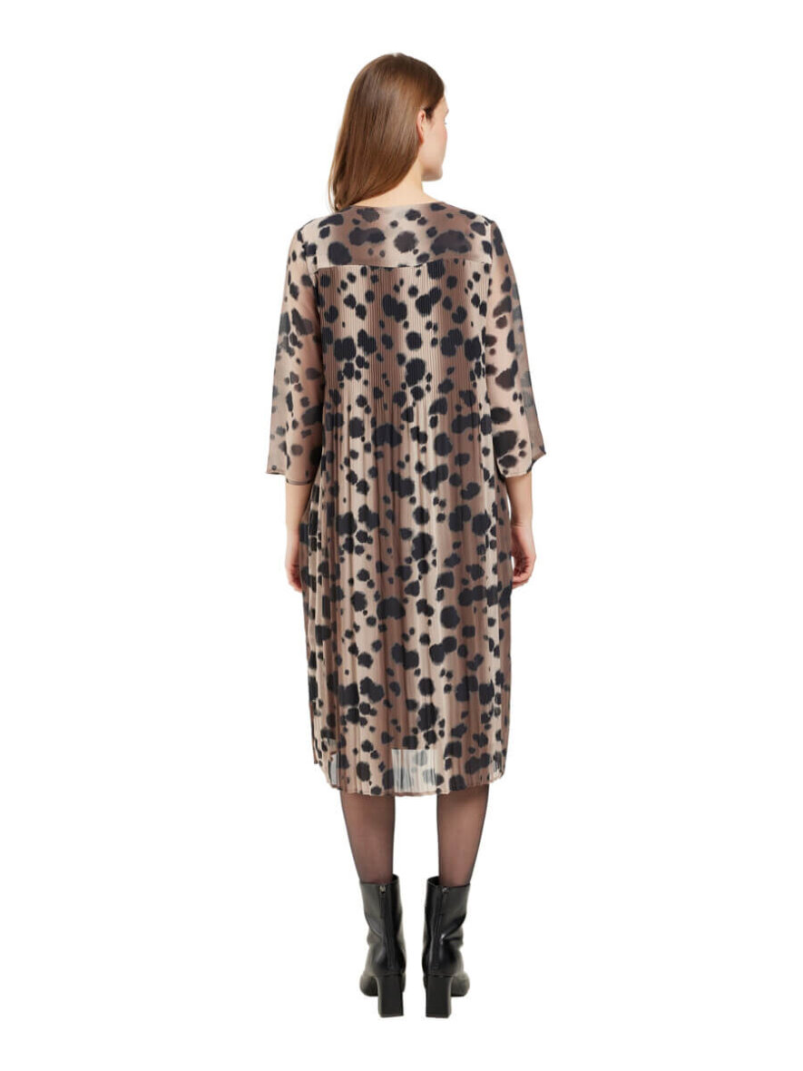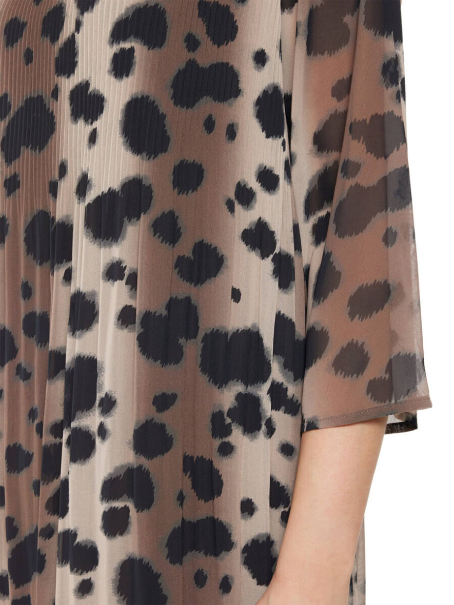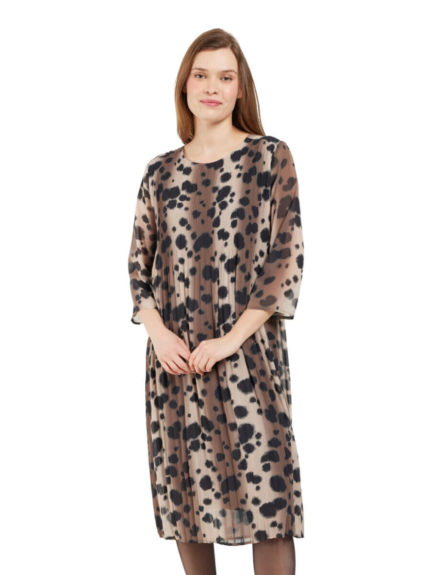 Kjolen er lavet i en behagelig løs pasform. Kjolen består af to dele, hvor den yderste del er lavet i et transparent design. Herunder er der en påsyet brun inderdel i en dejlig blød viskose kvalitet. Ærmerne er transparente. Kjolen er med rund hals og brede 3/4 ærmer.