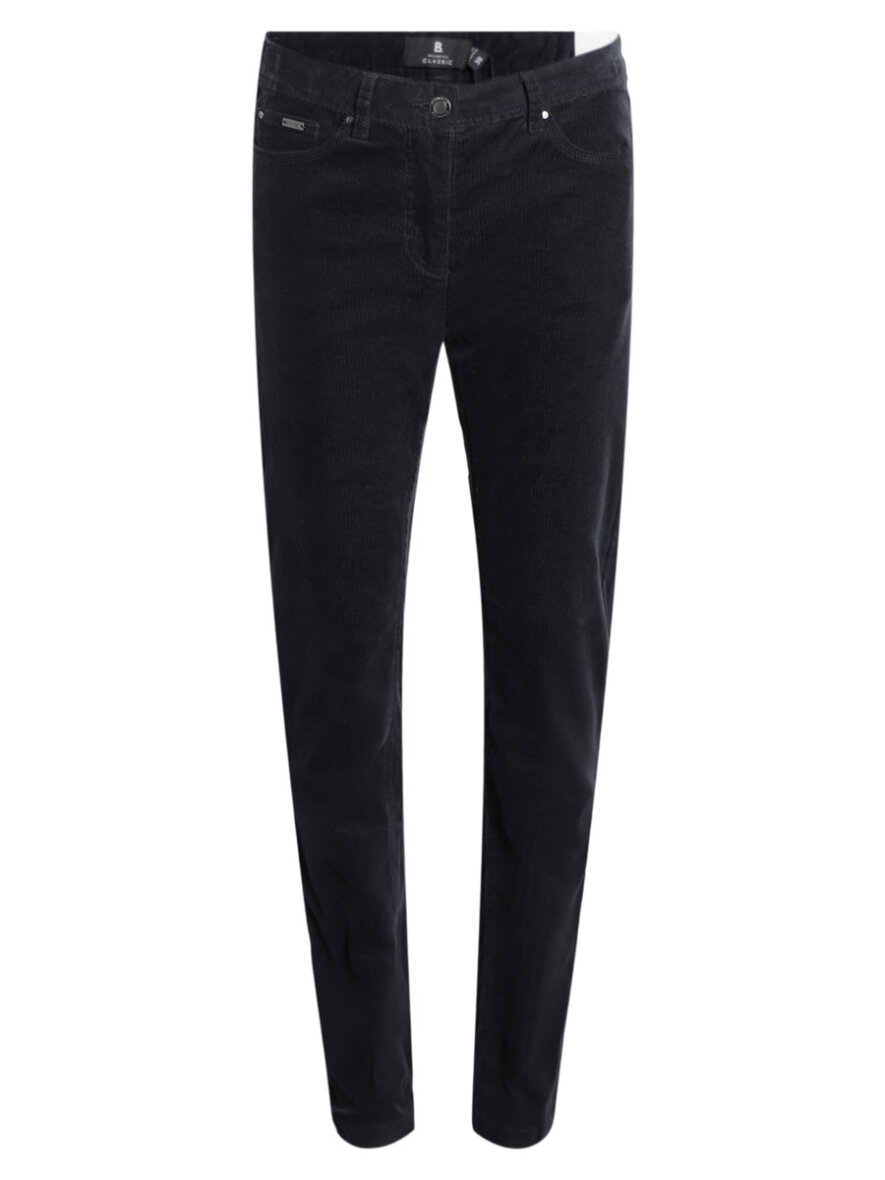 Skønne og bløde fløjlsbukser i sort fra Brandtex. Bukserne har en formskåret linning. Lukkes med lynlås og knap og har bæltestropper. Medium waist/Straight fit/Straight leg.