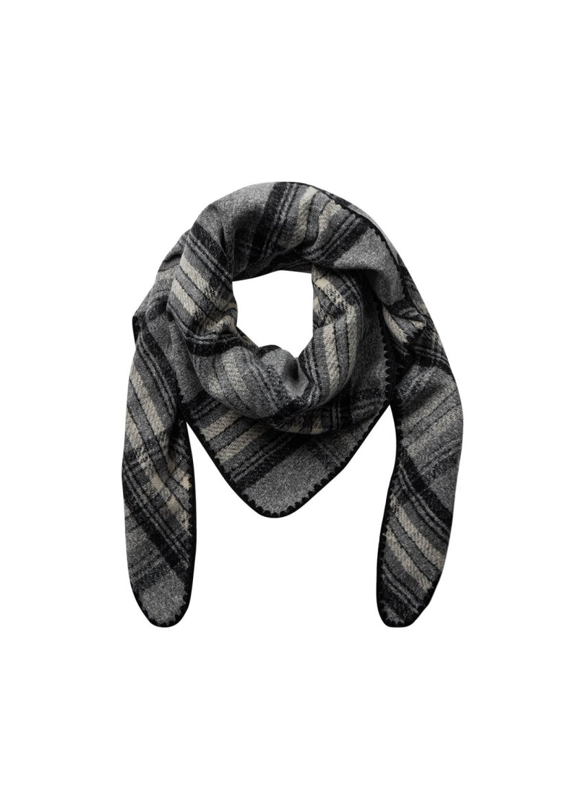 Flot tørklæde i et ternet design fra Soyaconcept. Halstørklædet er lavet i et trekantet design med et ternet strikket mønster sort og grå nuancer.