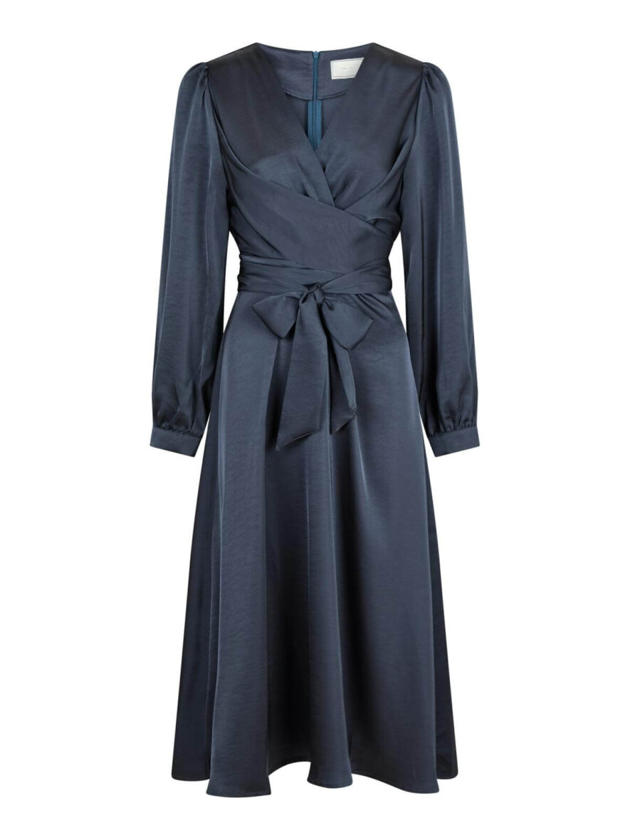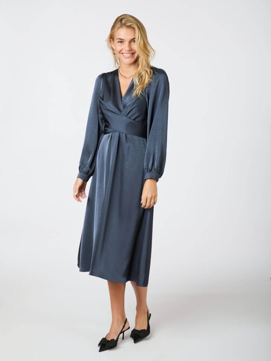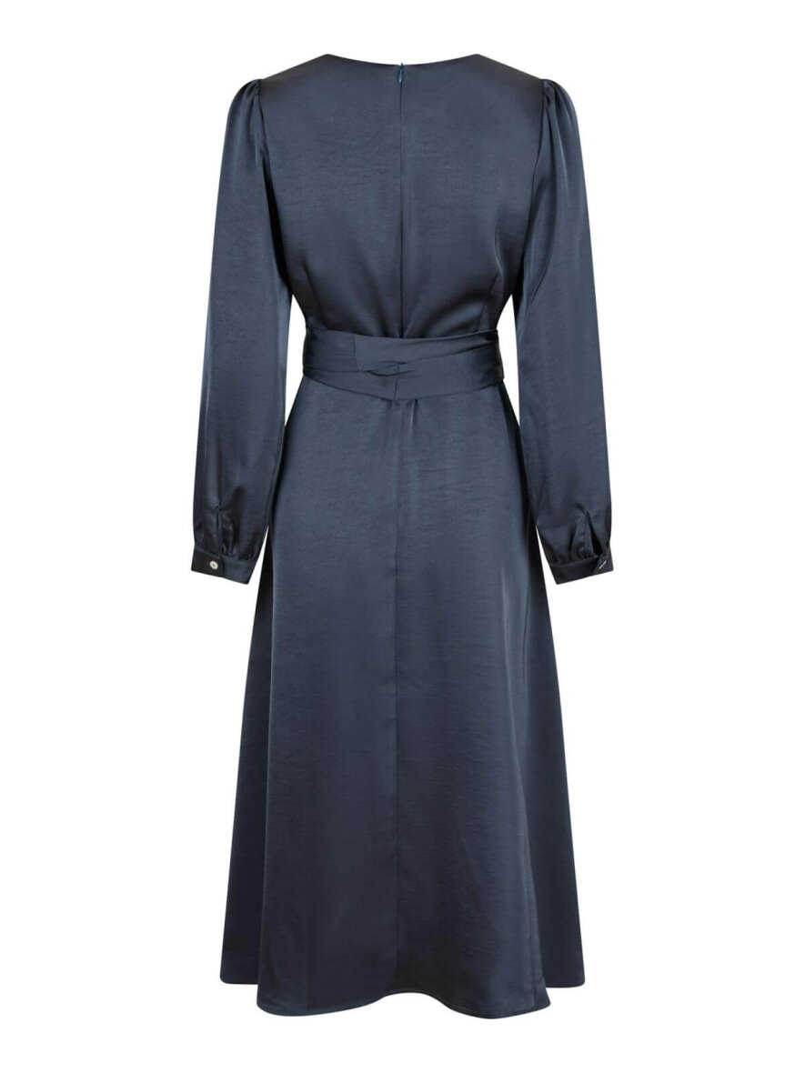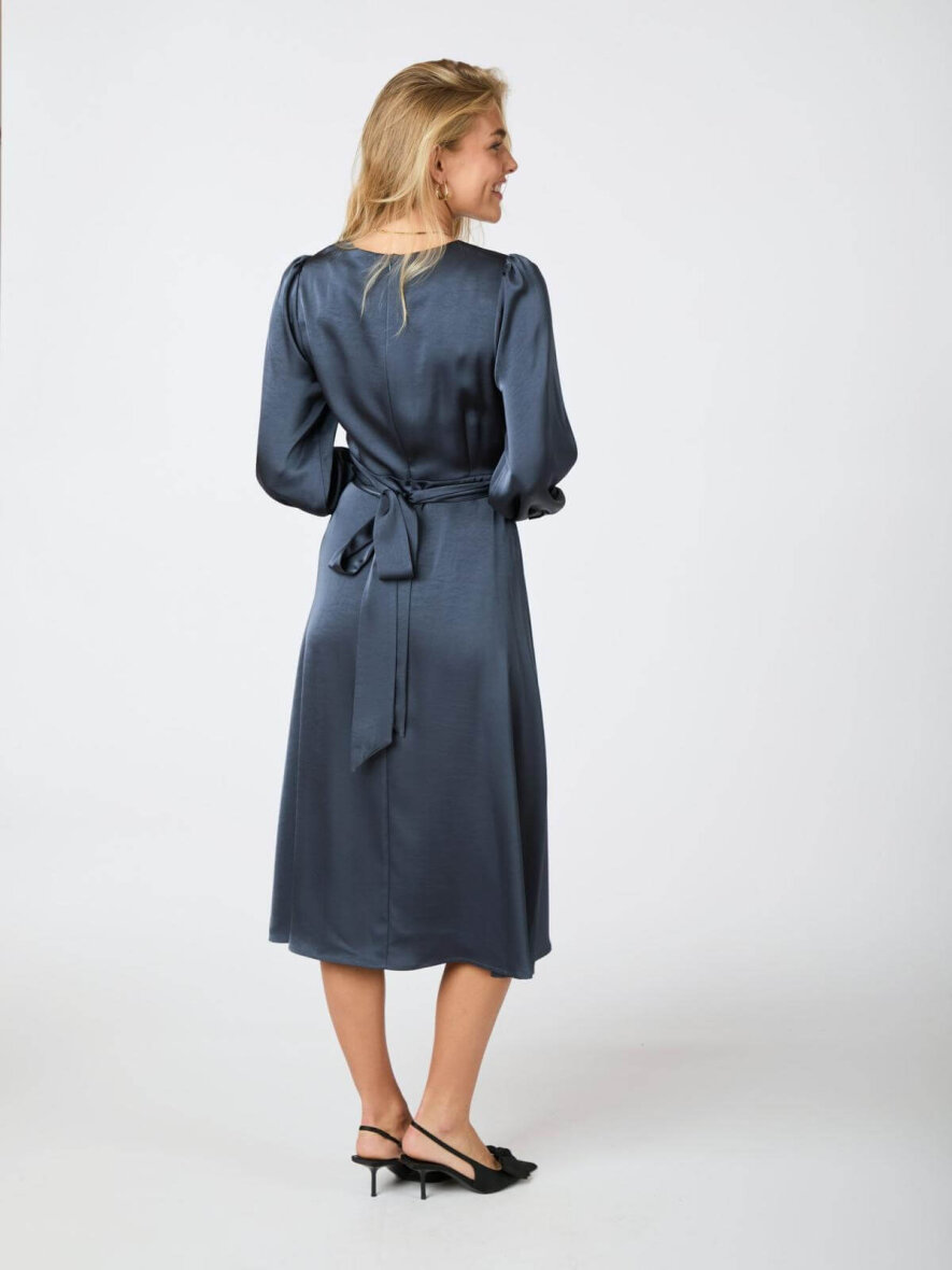 Kjole med slå-om detalje i taljen. Kjolen er med v-halsudskæring og rynkeeffekt ved skuldrene. Kjolens lange ærmer er med let puf, hvilket giver en flot effekt når man har blusen på.