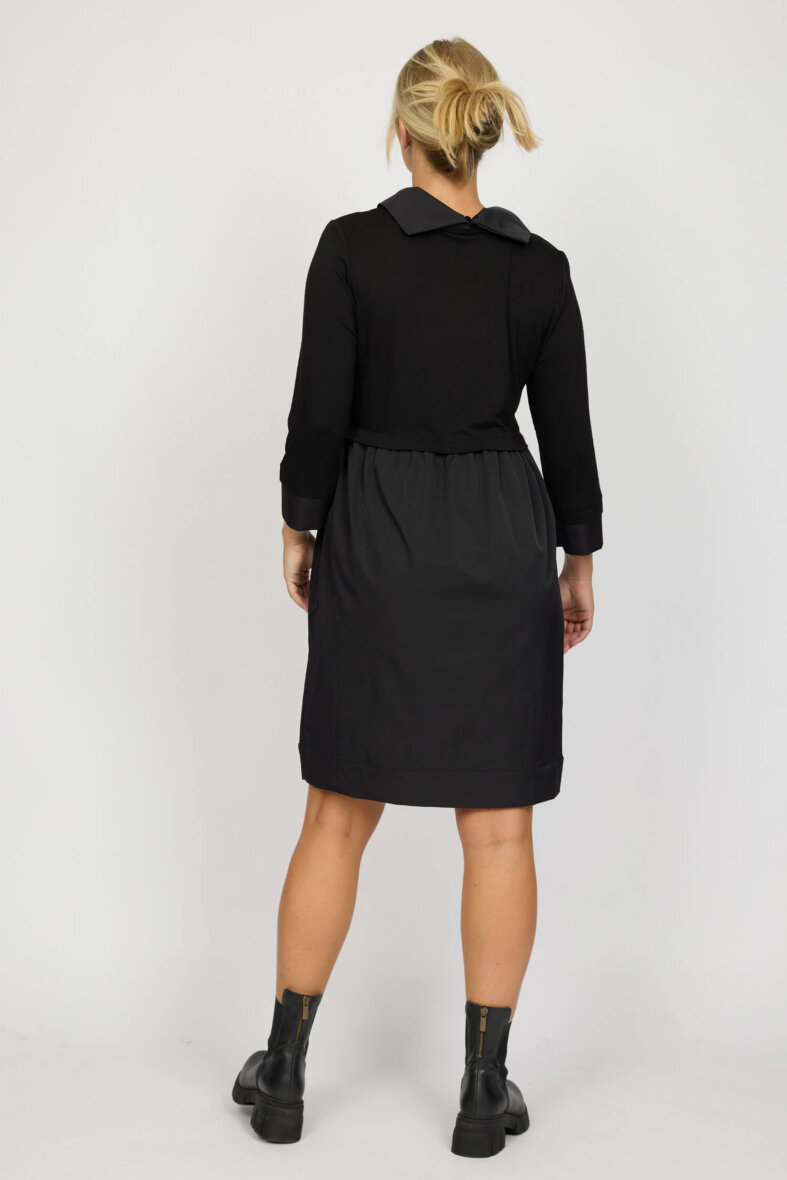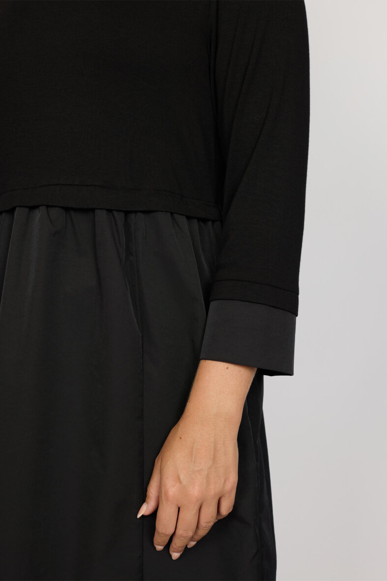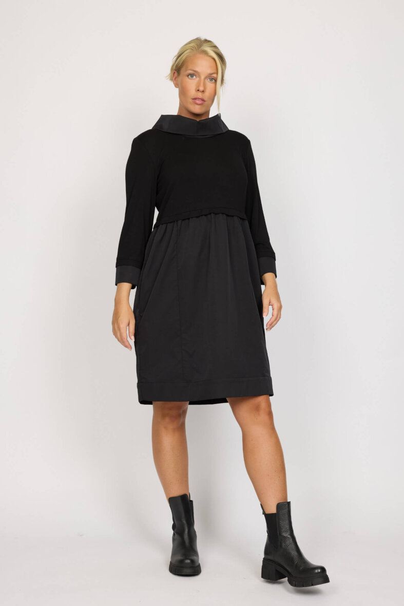 Smuk knæ lang kjole fra 2-Biz i modellen Ebella. Kjolen er lavet i et smukt sort design, hvor overdelen og underdelen er lavet i to forskellige kvaliteter.