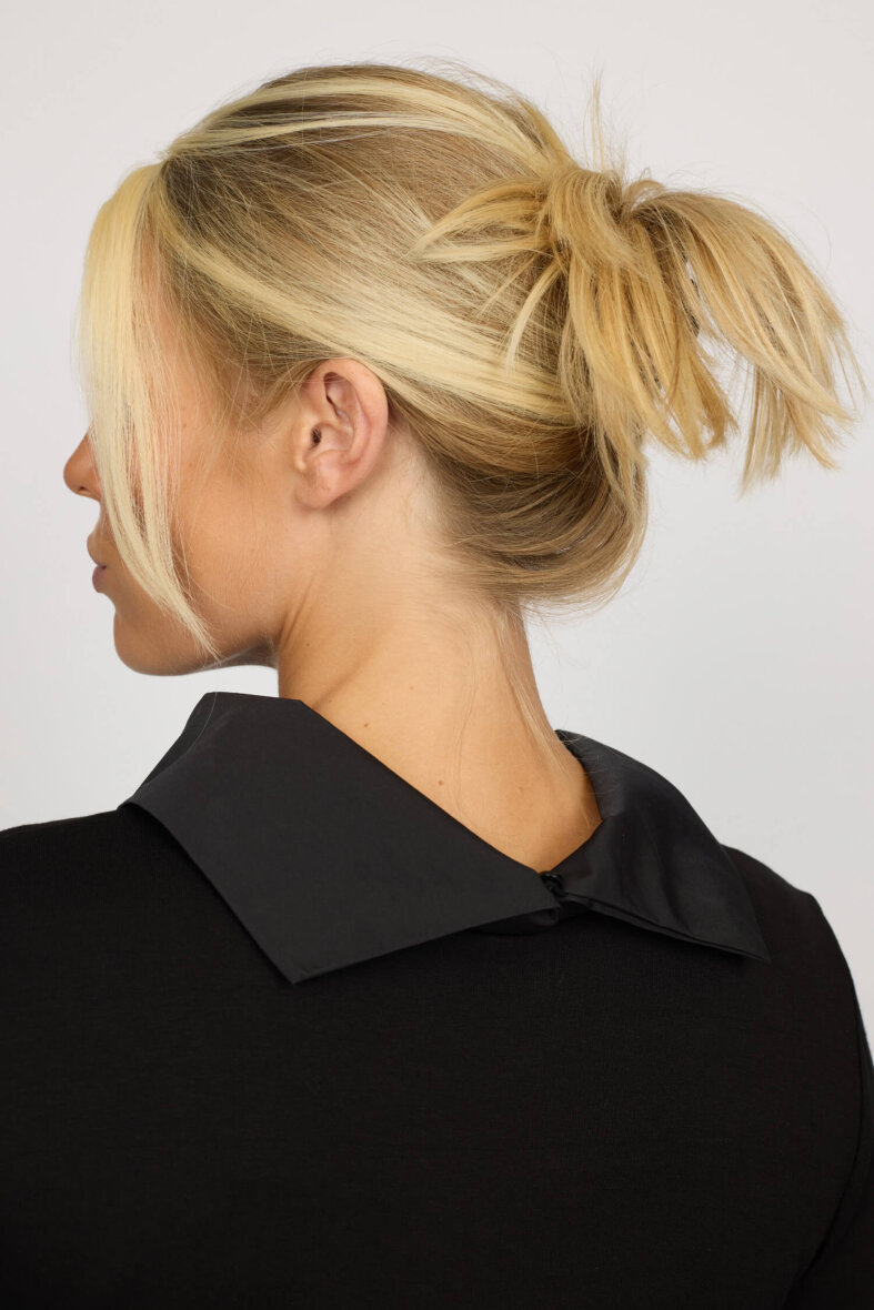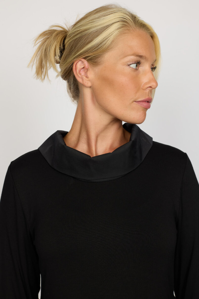 Ebella kjolen er med rund hals med krave og lange ærmer. Overdelen er lavet i en blød viskose kvalitet, hvor underdelen er lavet i en Poplin kvalitet, som giver en glat og kraftig effekt. Denne kvalitet går igen ved håndledet og kraven.