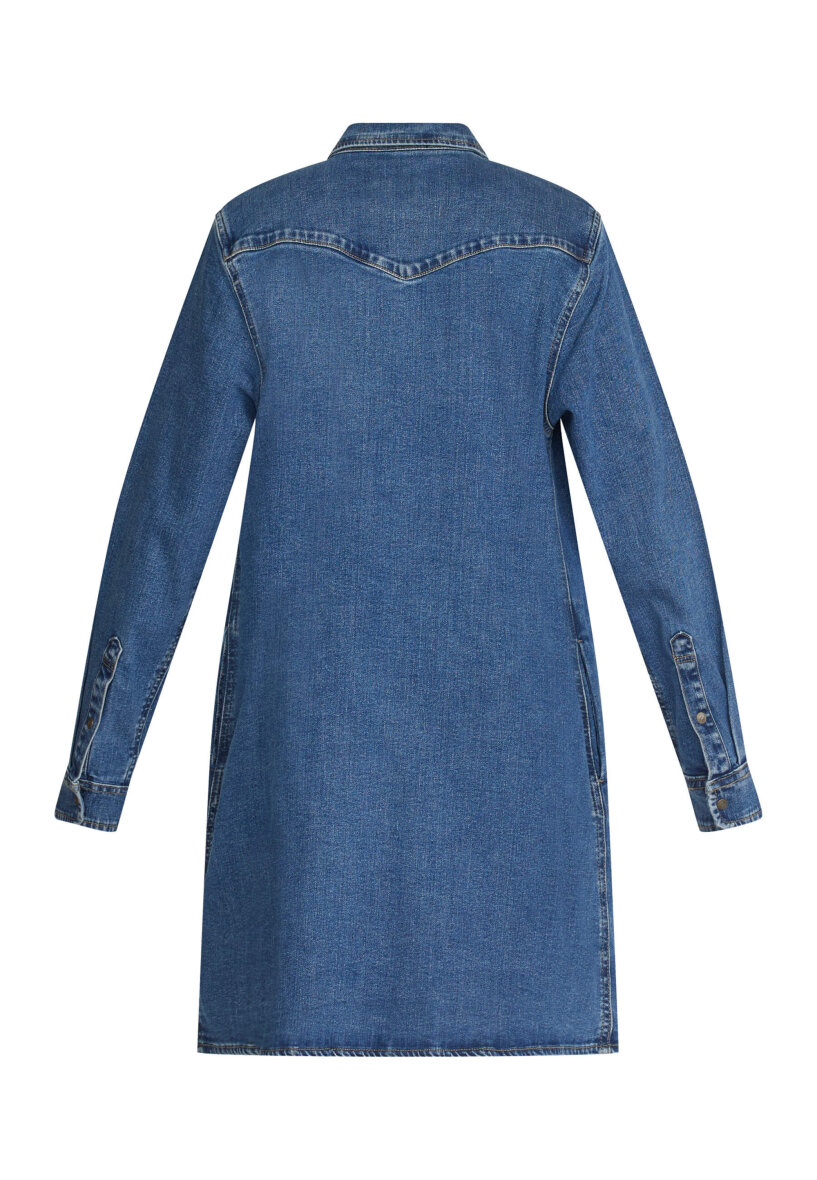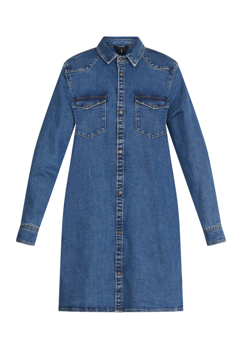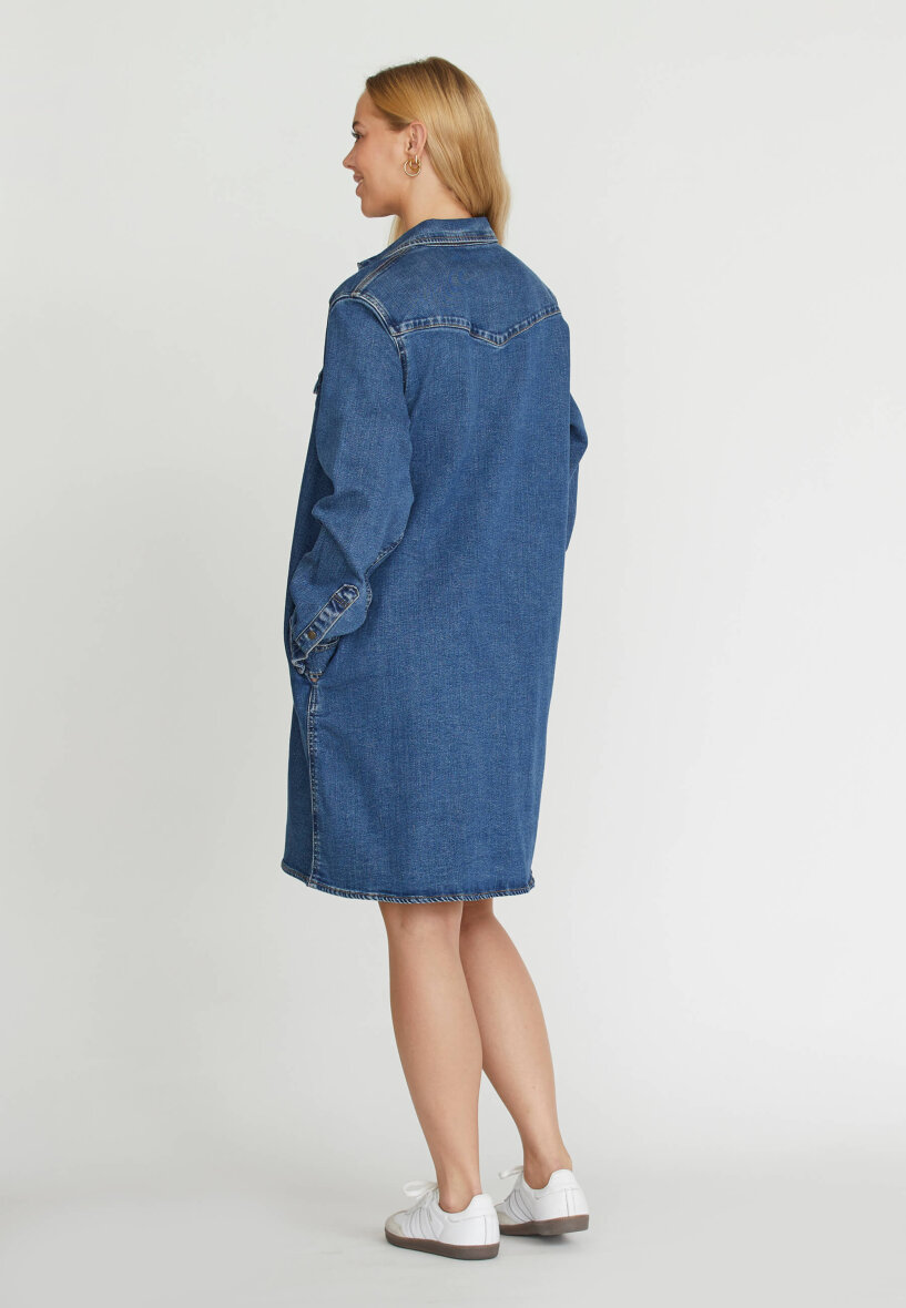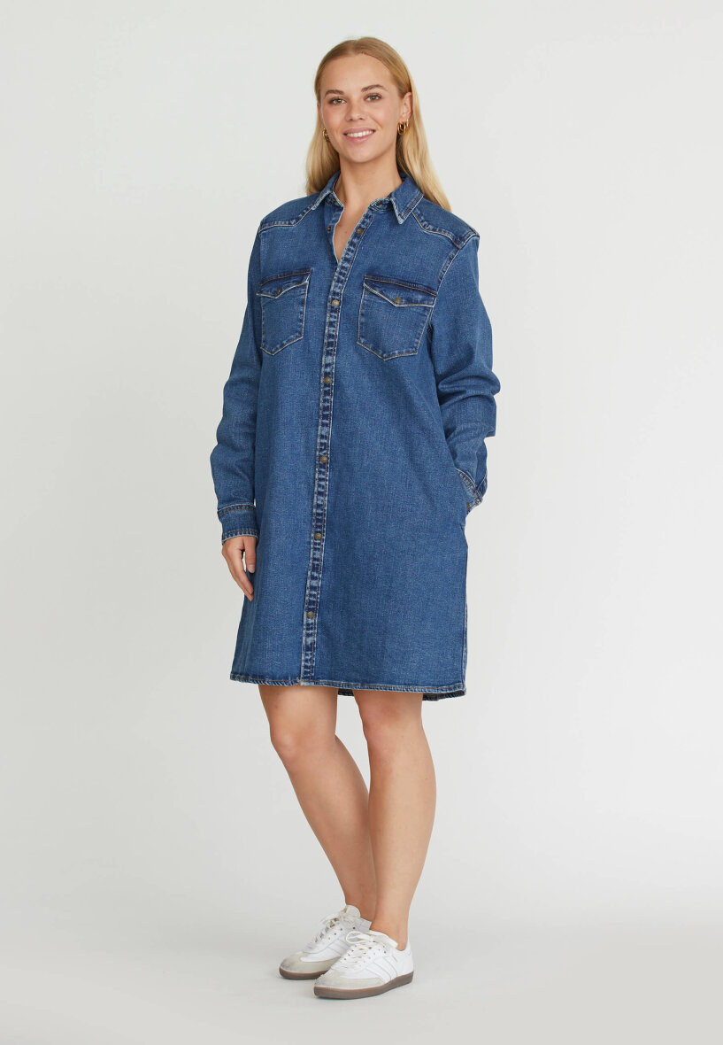 Kjolen er med en klassisk skjorte krave samt med fine gennemgående guldknapper langs fronten Kjolen er lavet i et flot og enkelt design i en komfortabel pasform. Denimkjolen er med lange ærmer med trykknapper ved håndledet. Med to brystlommer med klap samt skjulte lommer i siden.