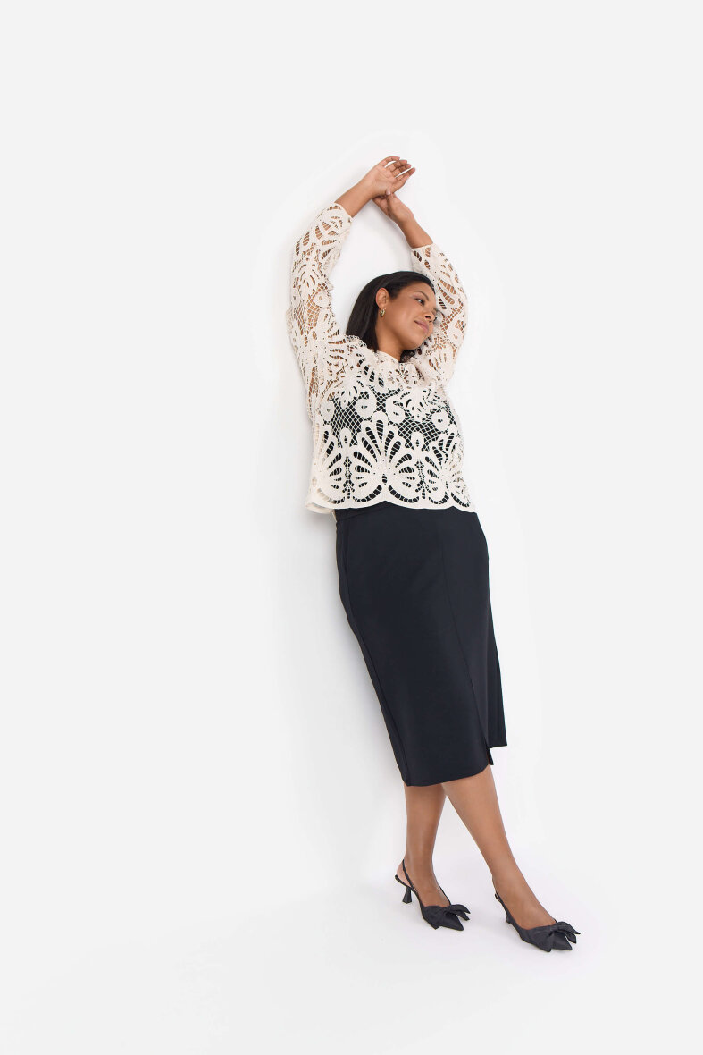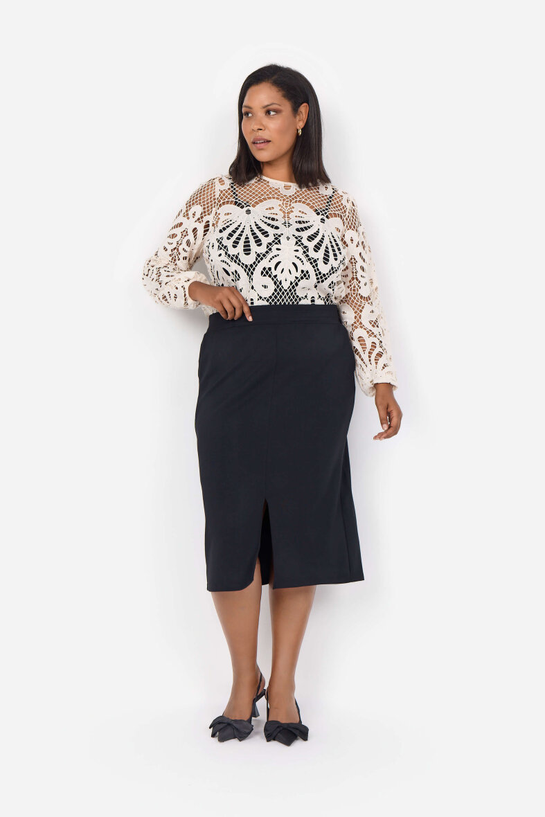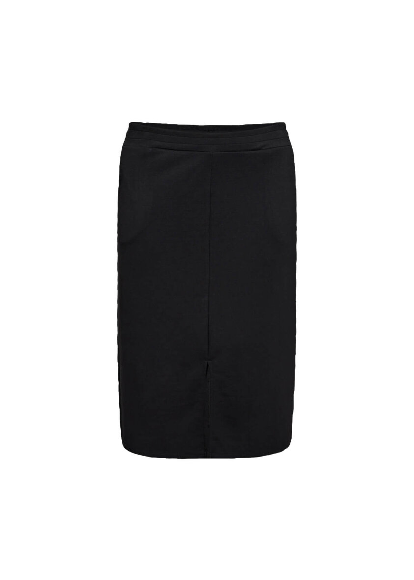 Nederdelen er lavet med elastik i taljen, så den sidder godt. Nederdelen er lavet i en skøn kvalitet af modal og polyester med stræk, så den er særdeles behagelig at have på. Flot og flatterende kropsnær pasform.