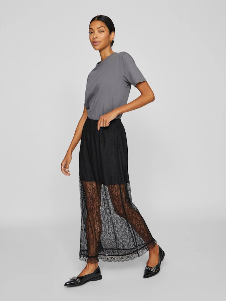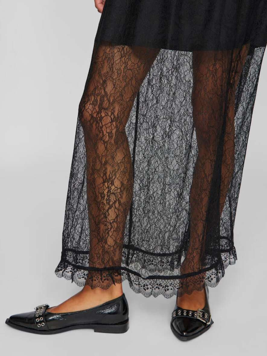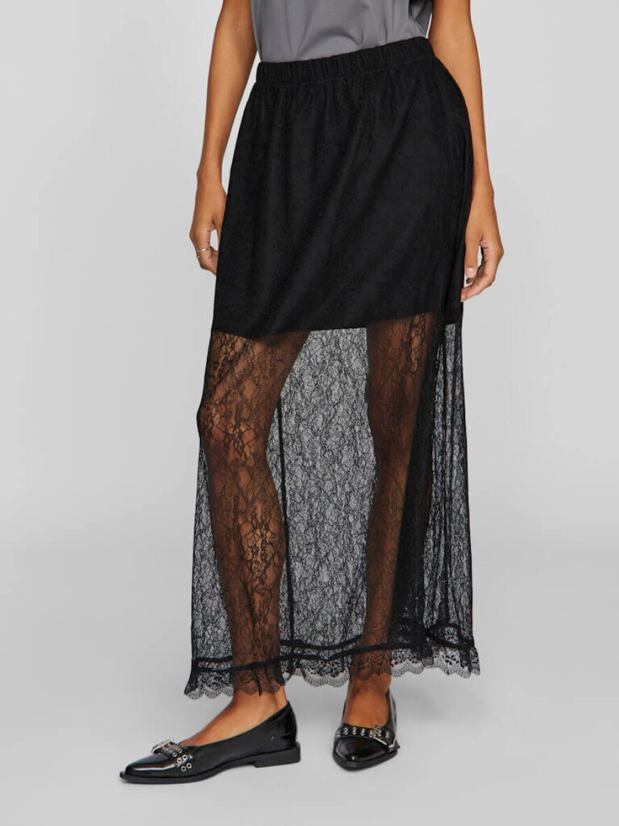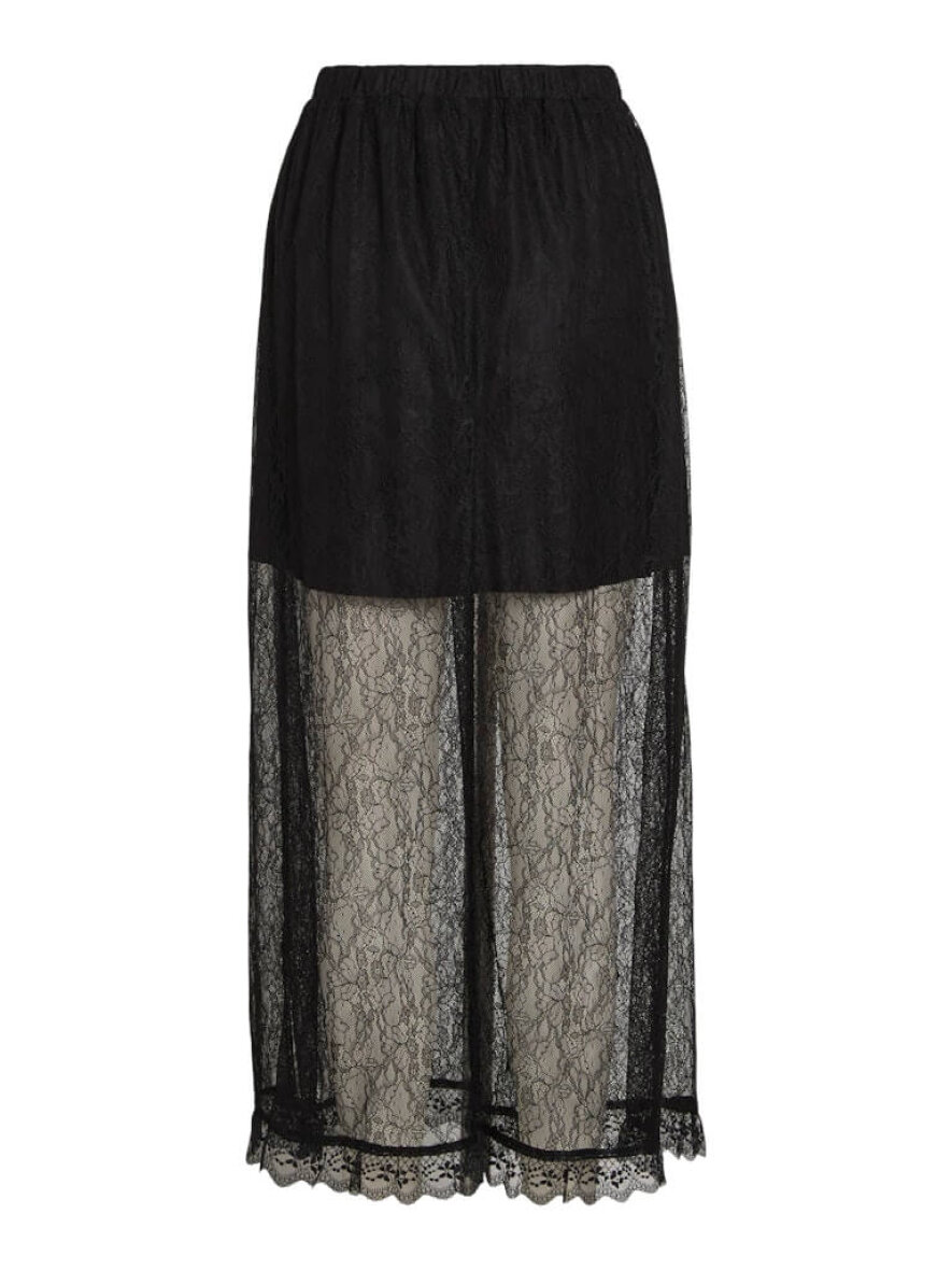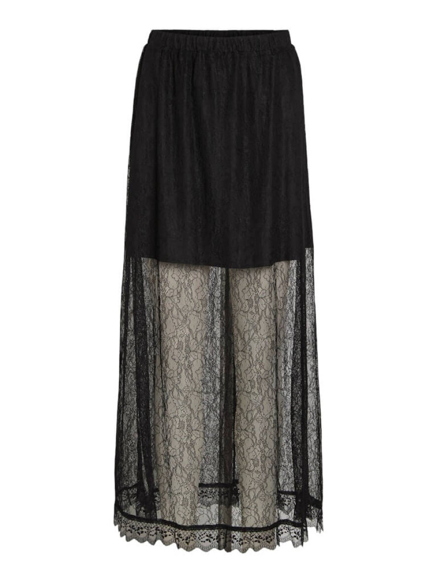 Nederdelen er lavet i et flot og moderne blonde design i en transparent mesh kvalitet med flæse kant forneden. Den lange nederdel er med elastik i taljen samt en kort påsyet underdel.