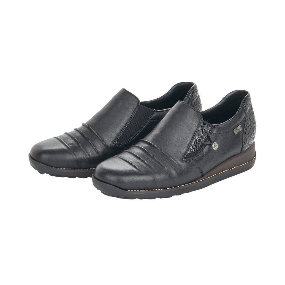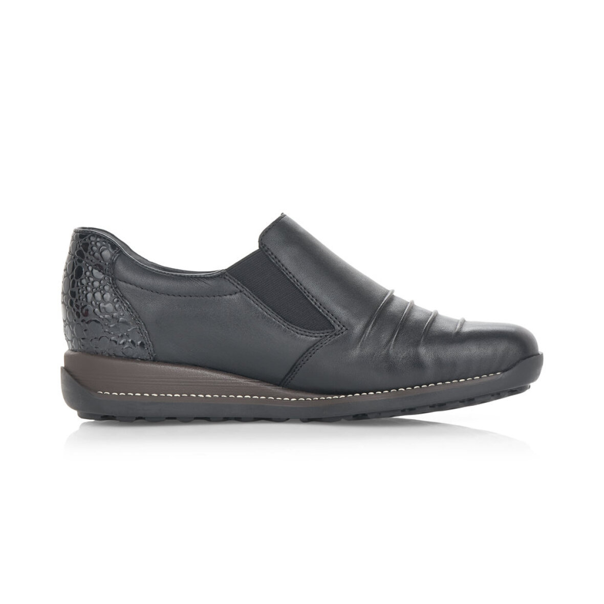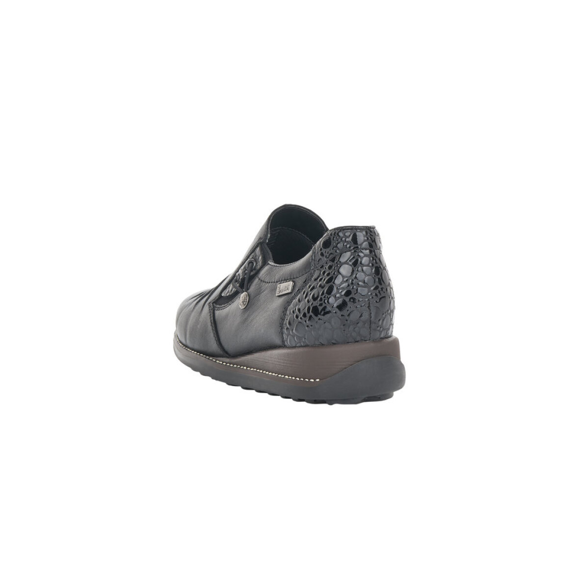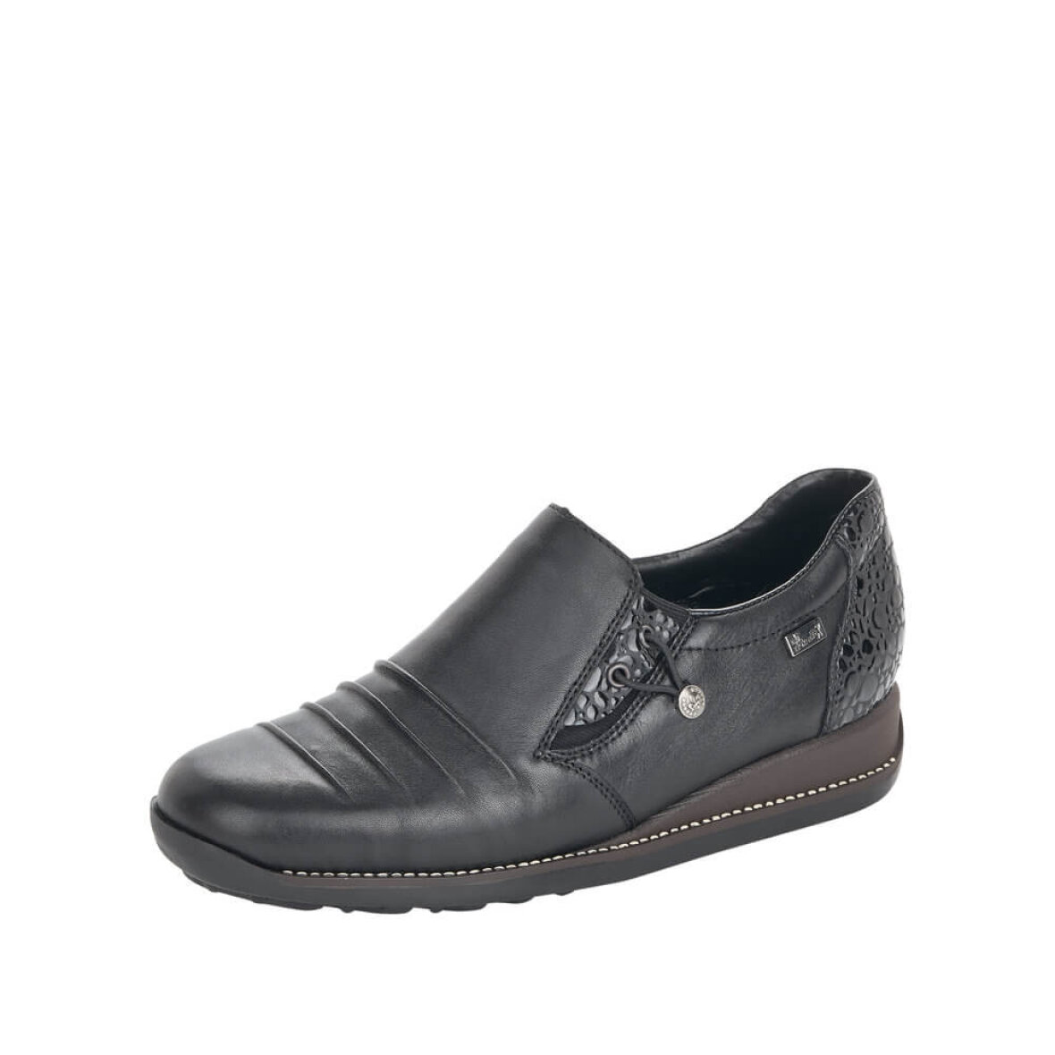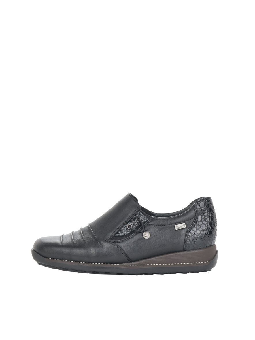Fin og komfortabel sort sko fra Rieker. Skoen er lavet i et tidsløst design med stilfulde lakdetaljer ved hælen.