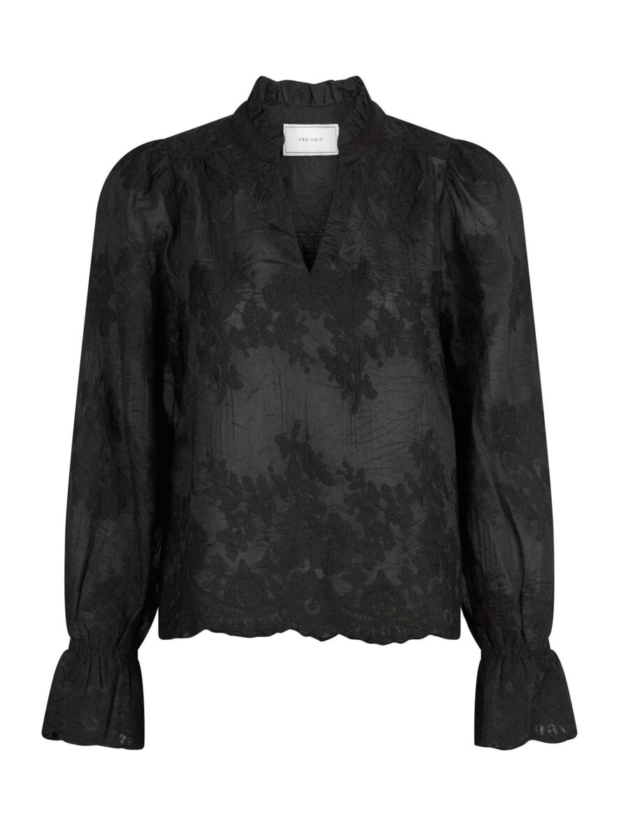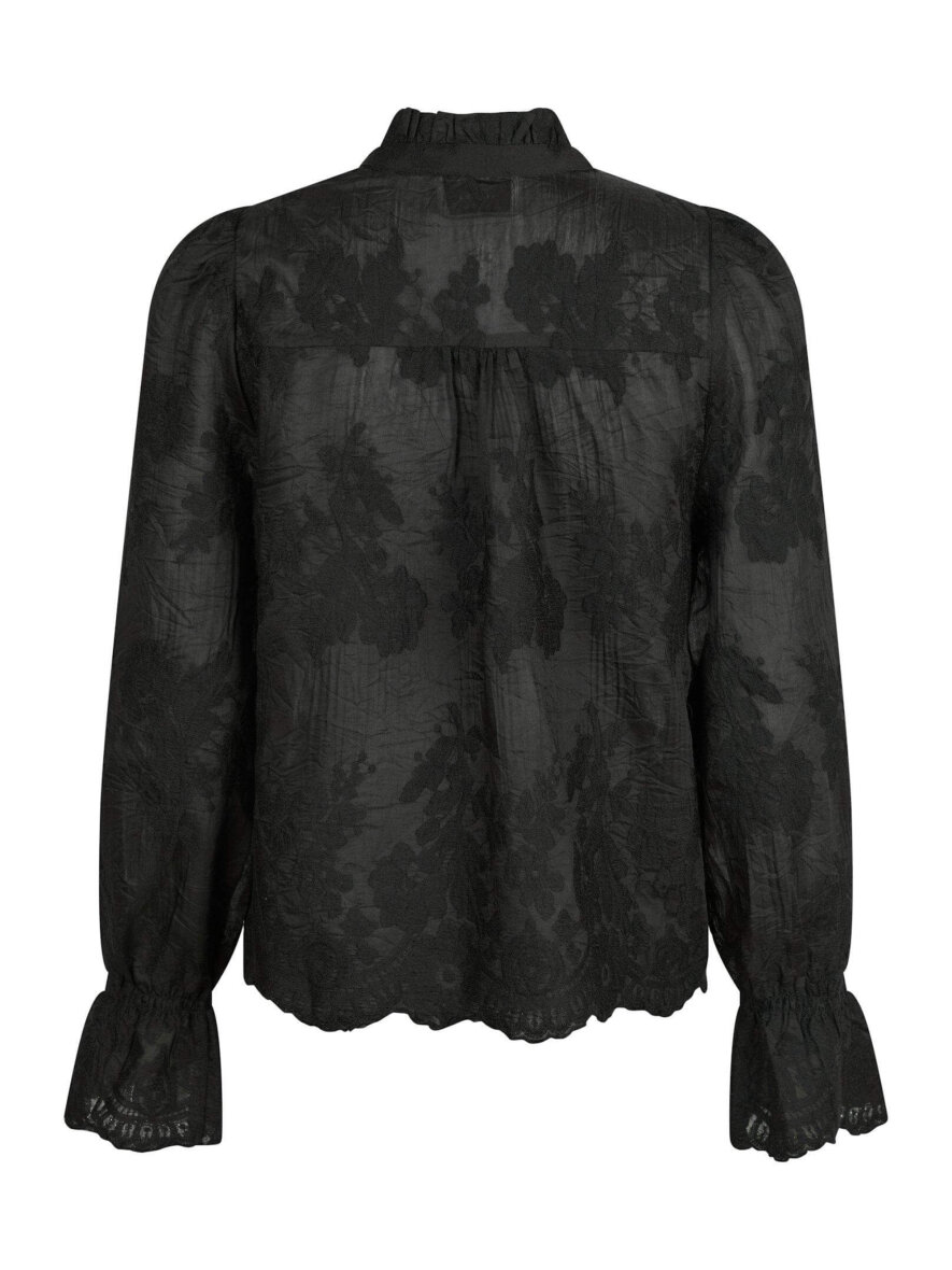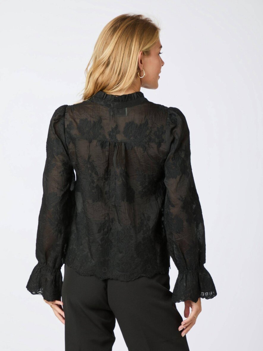 Blusen er med rund hals med flæse detaljer samt en lille v-halsudskæring. Blusen har lange ærmer med elastik kant, som danner en flot flæse detalje ved håndledet. Blusen er lavet i et let transparent stof - Style evt. med en sort top indenunder. Med fine rundinger forneden på blusen.