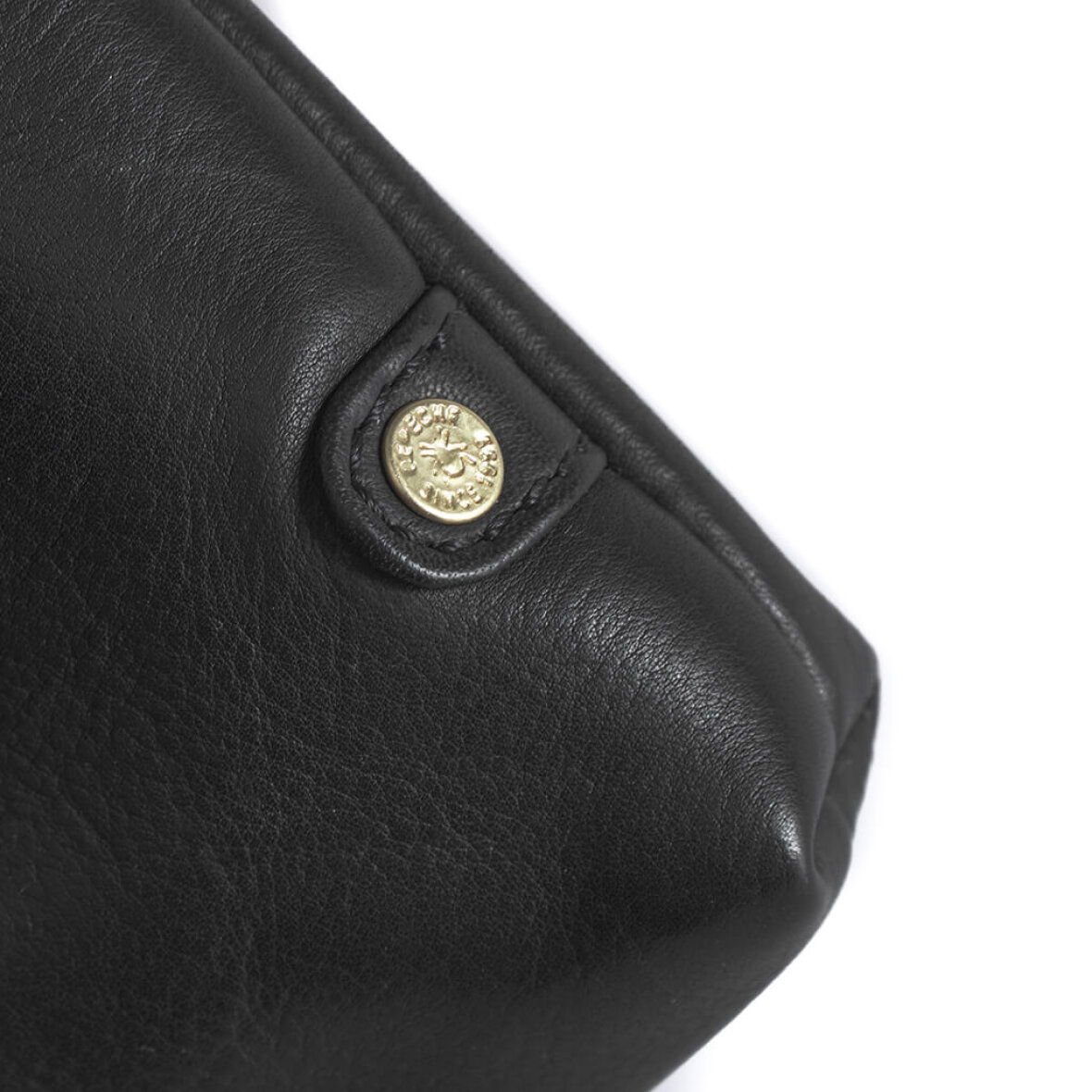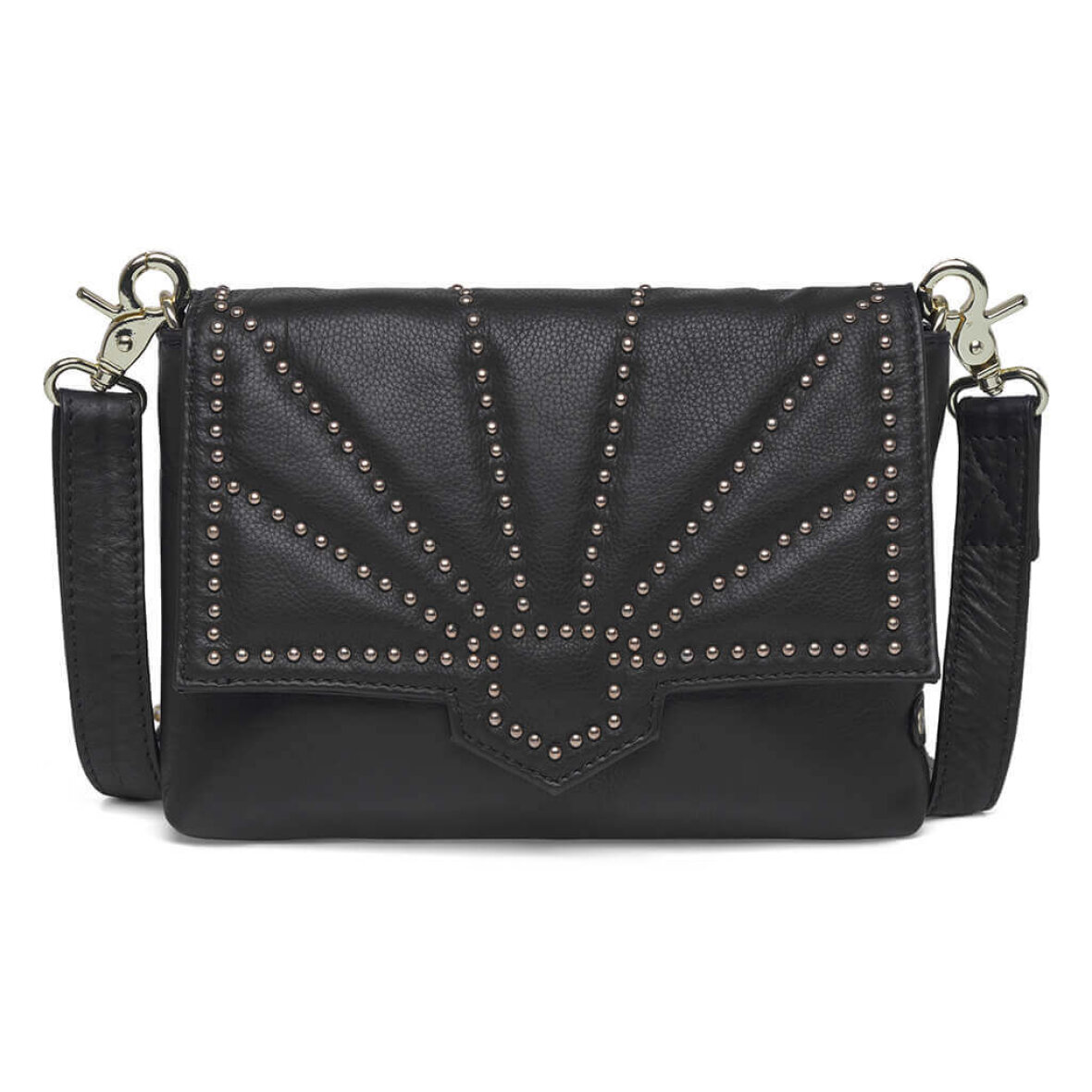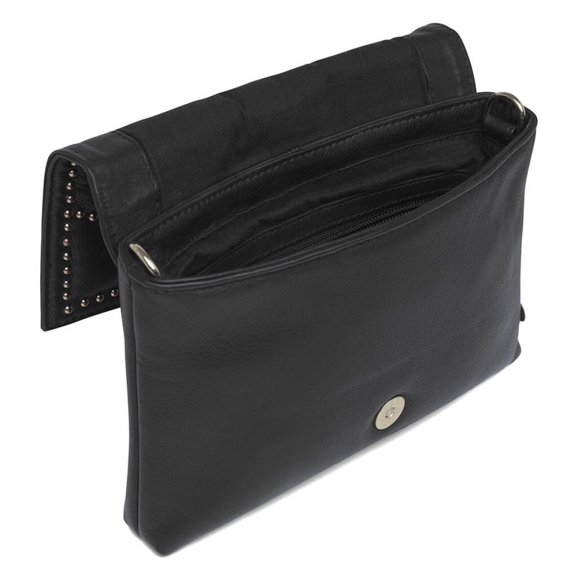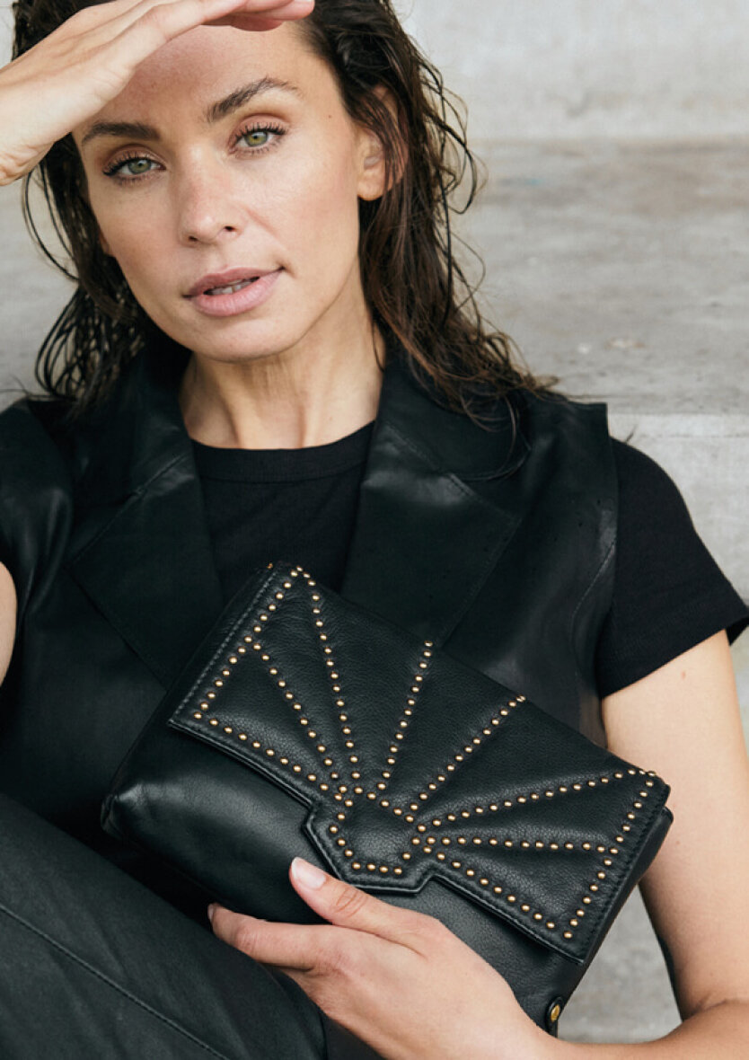 Stilfuld lille taske / clutch i et klassisk sort design fra Depeche. Tasken er lavet i en dejlig blød 100% skindkvalitet af okselæder med fine dekorative guld nitter på klappen.