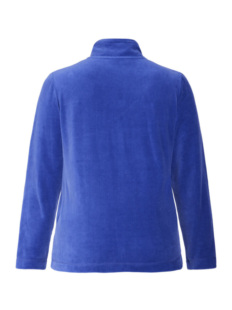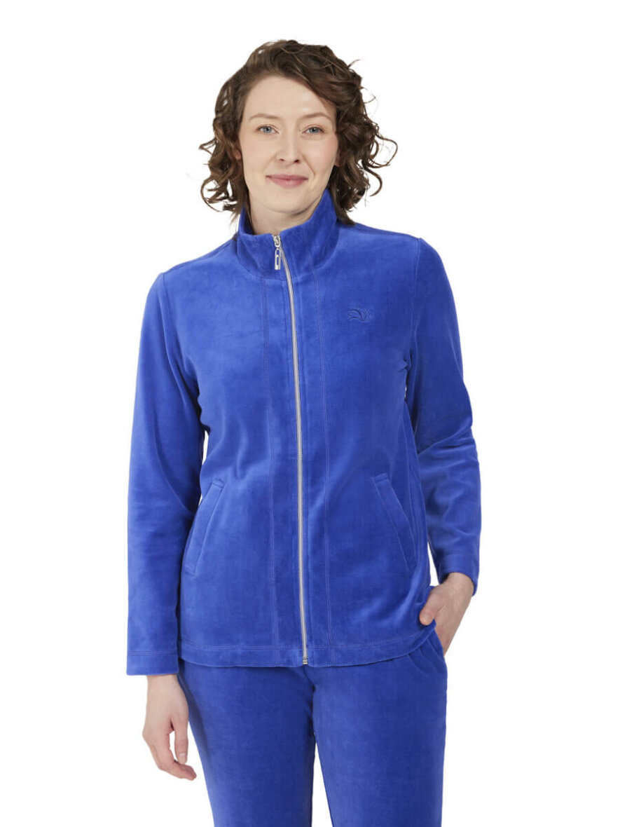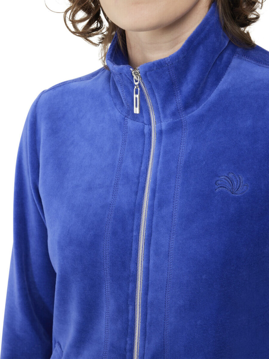 Sættet er lavet i en dejlig blød velour kvalitet udenpå. Sættet består af to dele. Blusen er med høj hals og gennemgående lynlås luk langs fronten. Buksen er med lange ben og elastik i taljen.