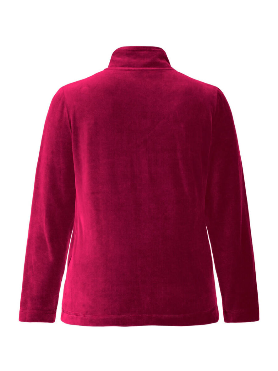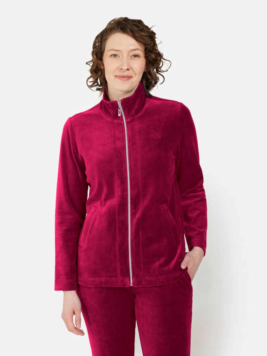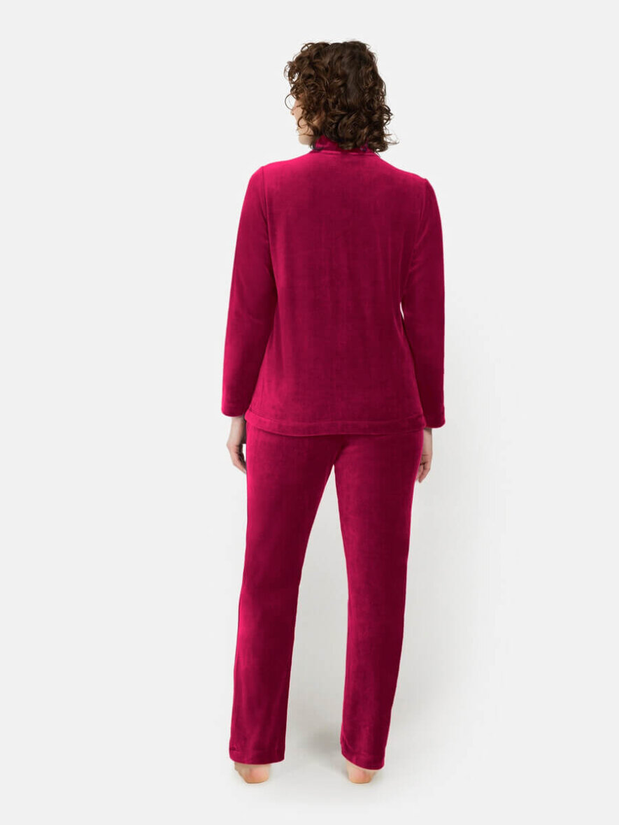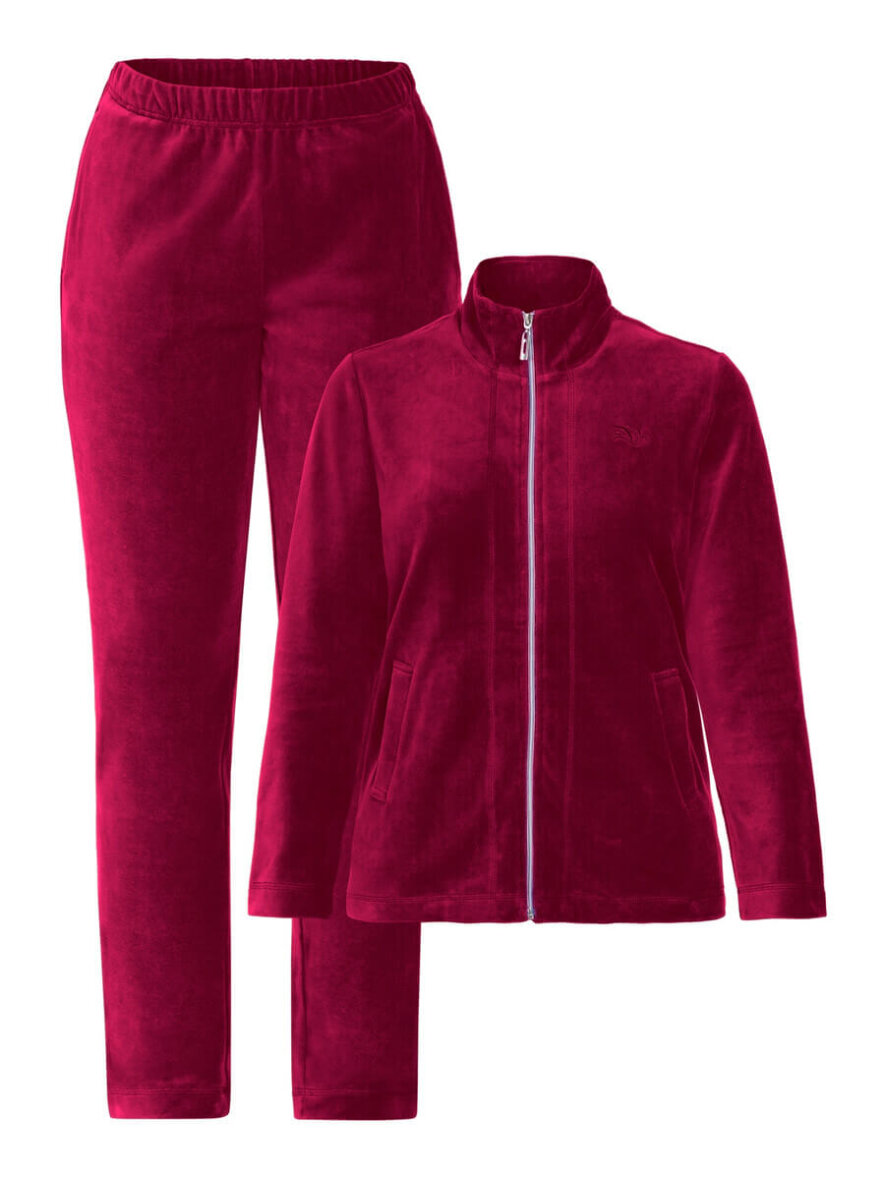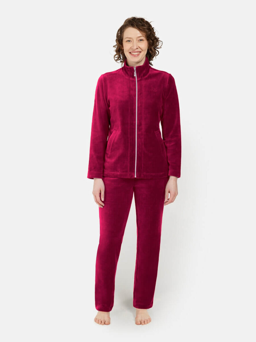 Sættet er lavet i en dejlig blød velour kvalitet udenpå. Sættet består af to dele, en bluse og bukser. Blusen er med høj hals og gennemgående lynlås luk langs fronten. Buksen er med lange ben og elastik i taljen.
