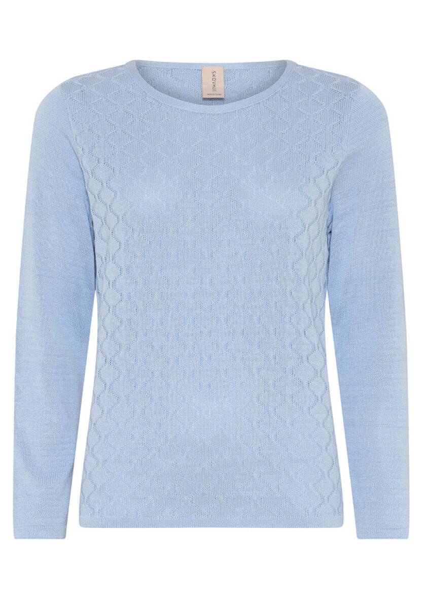 Flot finstrikket striktrøje fra Skovhuus. Striktrøjen er vævet i et enkelt zig zag mønster i en frisk lyseblå farve.