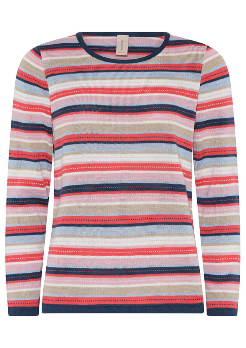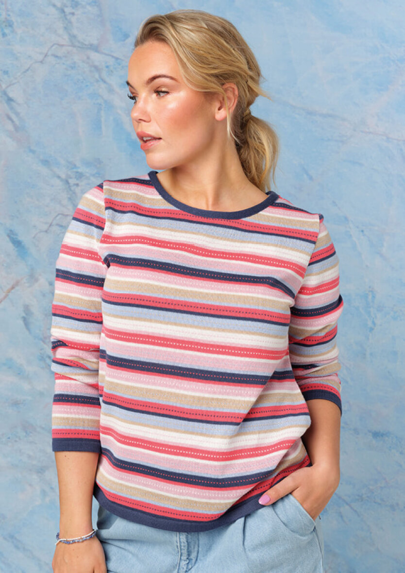 Flot og farverig finstrikket striktrøje fra Skovhuus. Striktrøjen er vævet i et stribet mønster i et mix af farver i røde og blå toner med små hjerter.