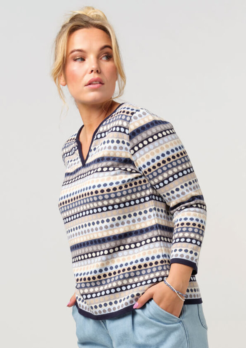 Denne flotte farve sammensætning, skaber et flot spil i trøjen. Trøjen er med rund hals med en lille v-halsudskæring. Med 3/4 ærmer med en fin blå kant ved alle åbninger, som giver en flot detalje til trøjen. Let tætsiddende pasform lavet i en dejlig blød kvalitet af bomuld og akryl, som er utrolig behagelig at have på.