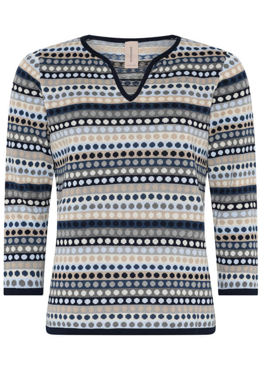 Flot finstrikket striktrøje fra Skovhuus i et stribet design med prikker i grå og blå nuancer.