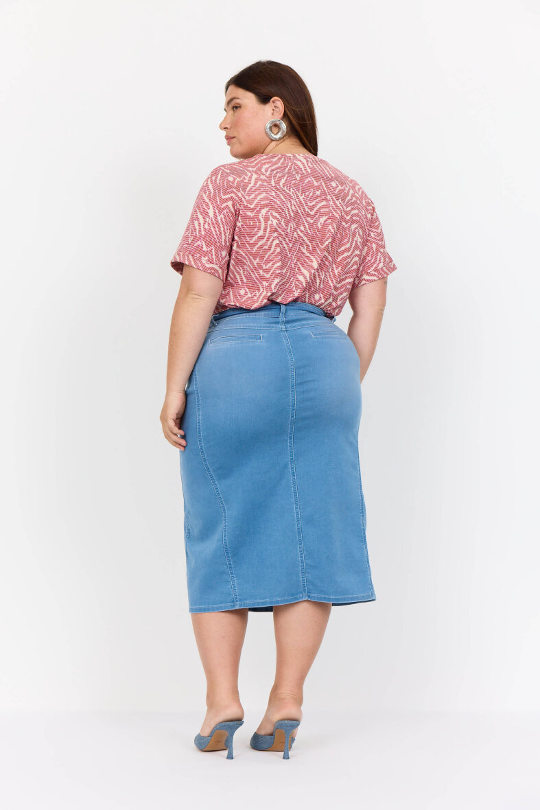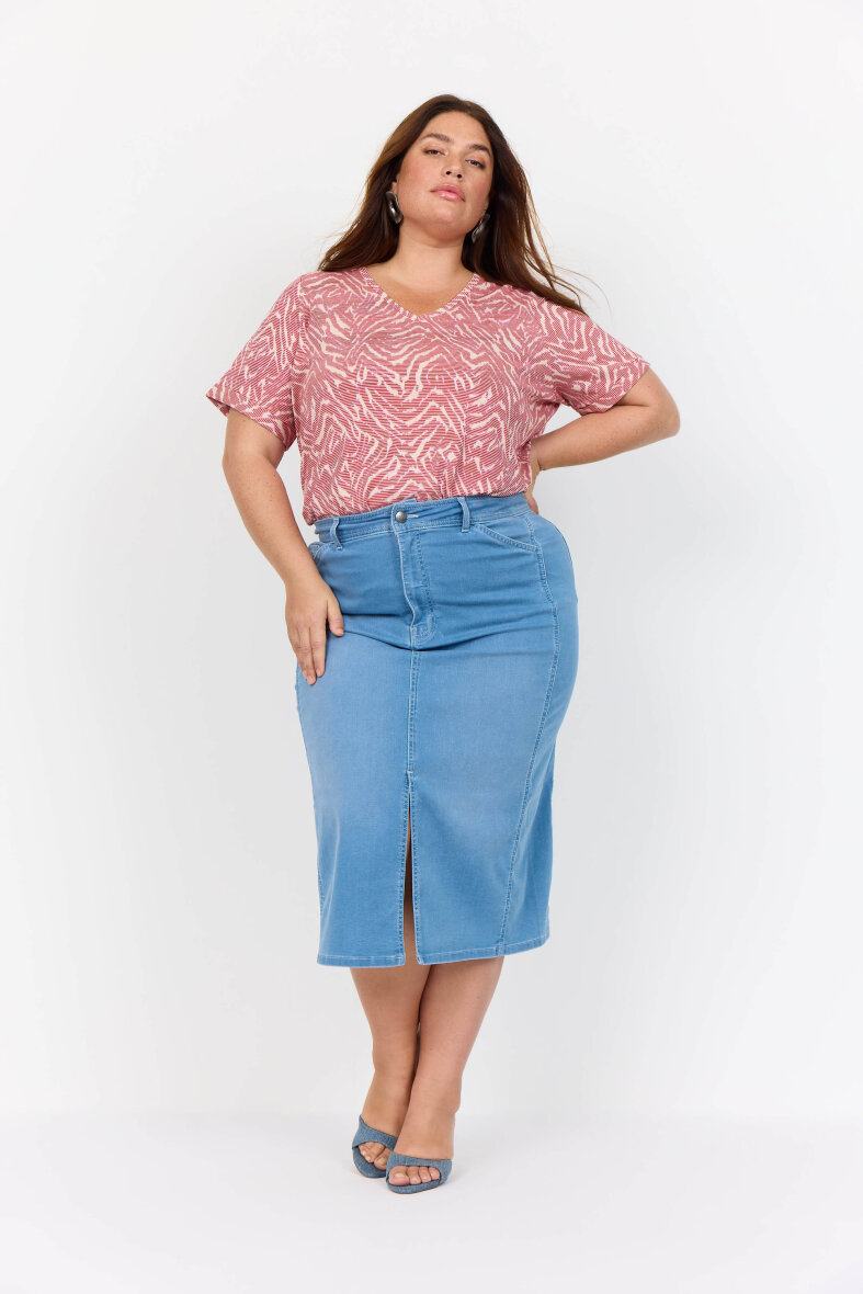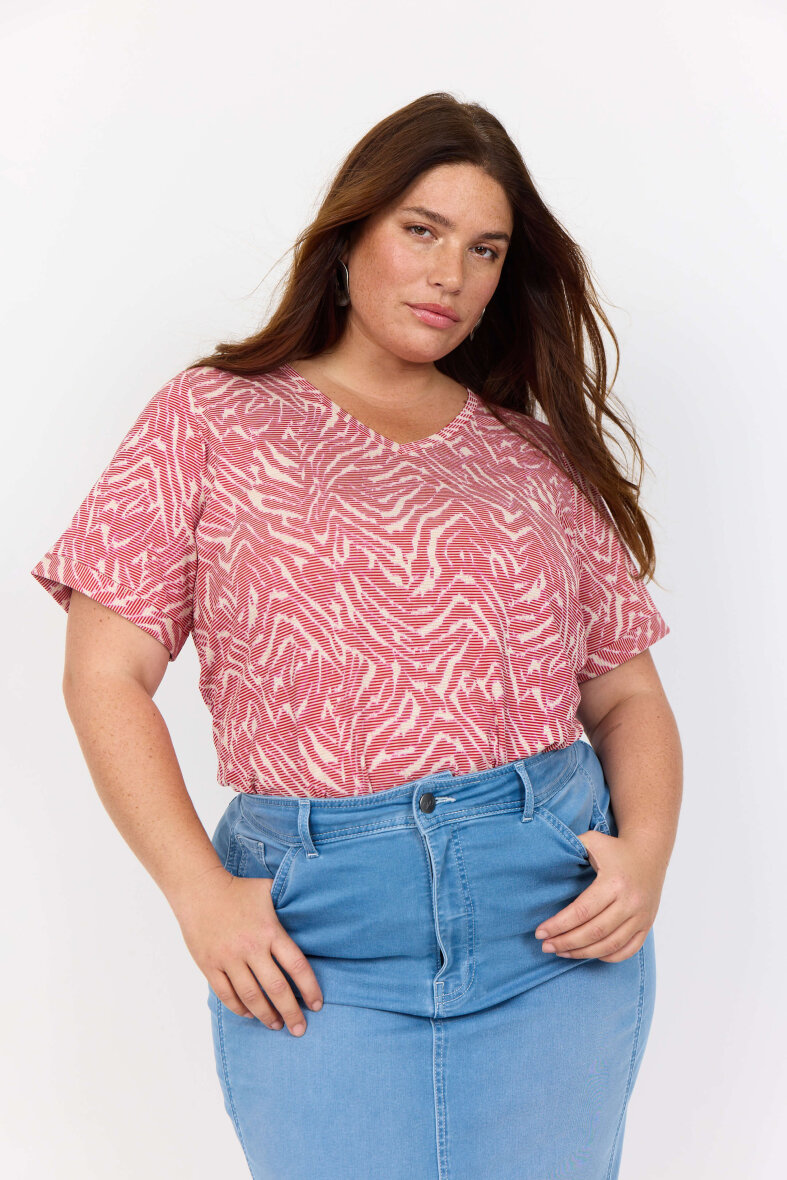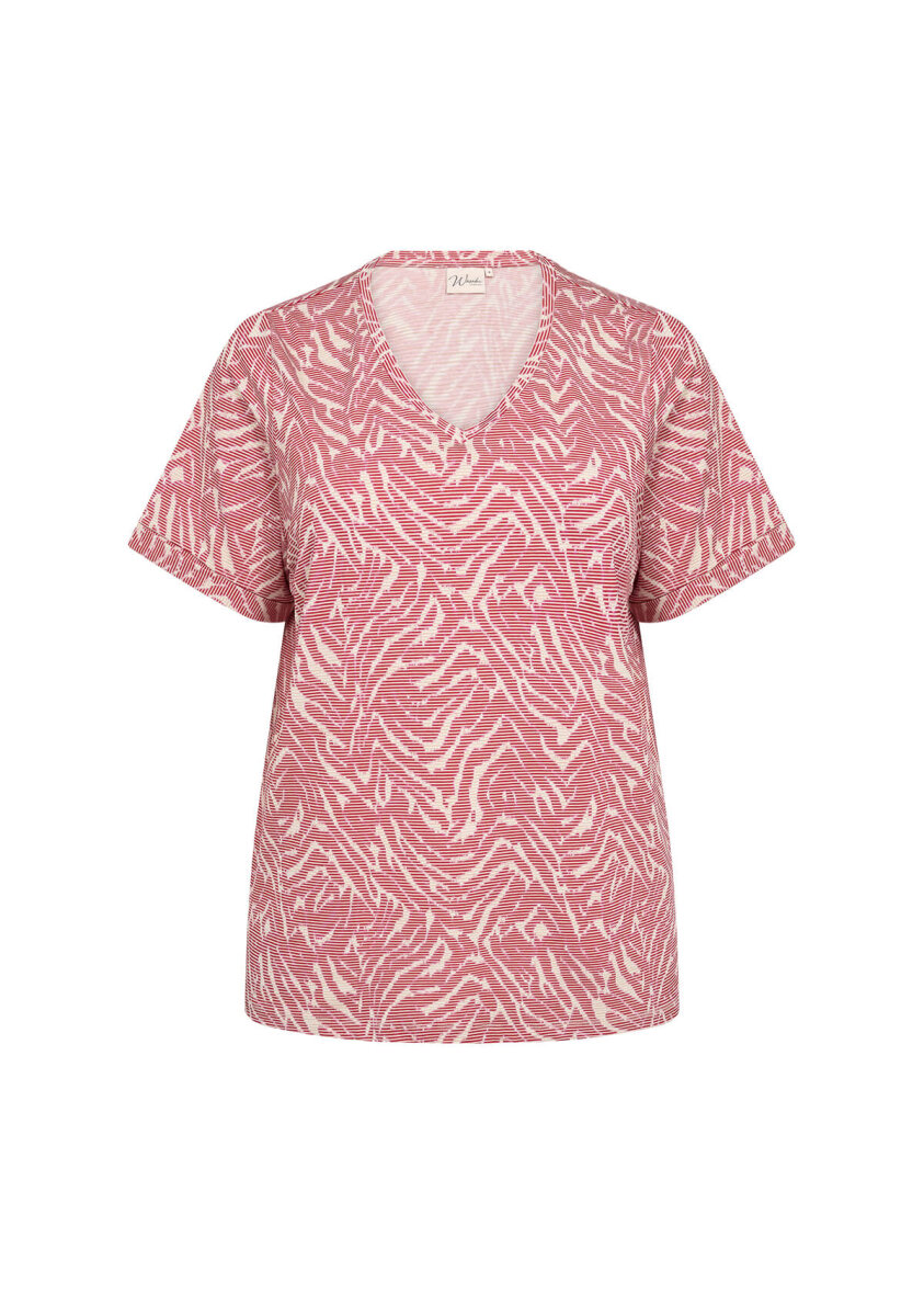 T-shirten er med v-hals og korte ærmer med opsmøg. T-shirten er lavet i en utrolig blød kvalitet i en viskoseblanding med stretch, som er særdeles behagelig at have på. Den farverige t-shirt er lavet i en løs og afslappet pasform. Det røde design passer perfekt til et par smarte jeans eller en denimnederdel.
