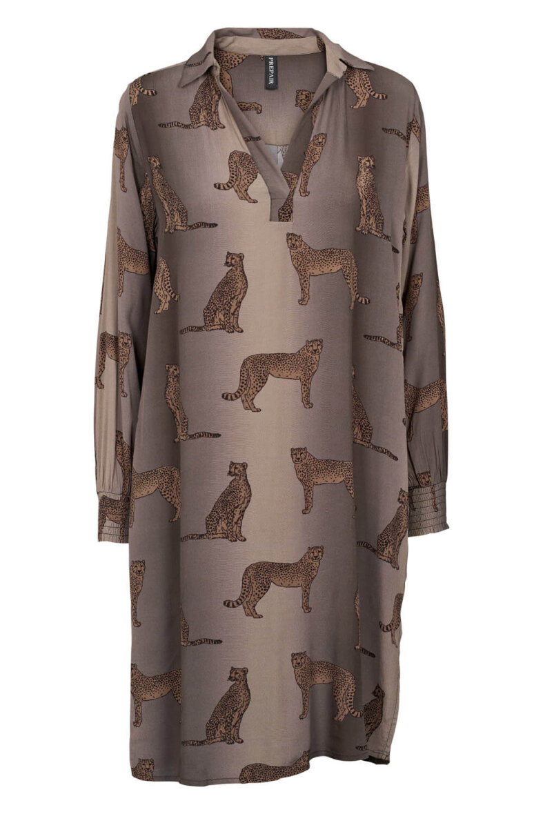 Smuk midi-kjole fra Prepair i modellen Helena. Kjolen er lavet i et smukt brunt print med gepard motiver.