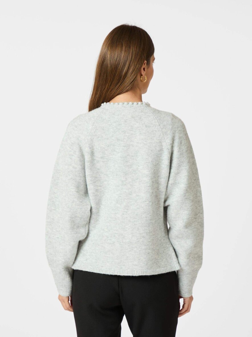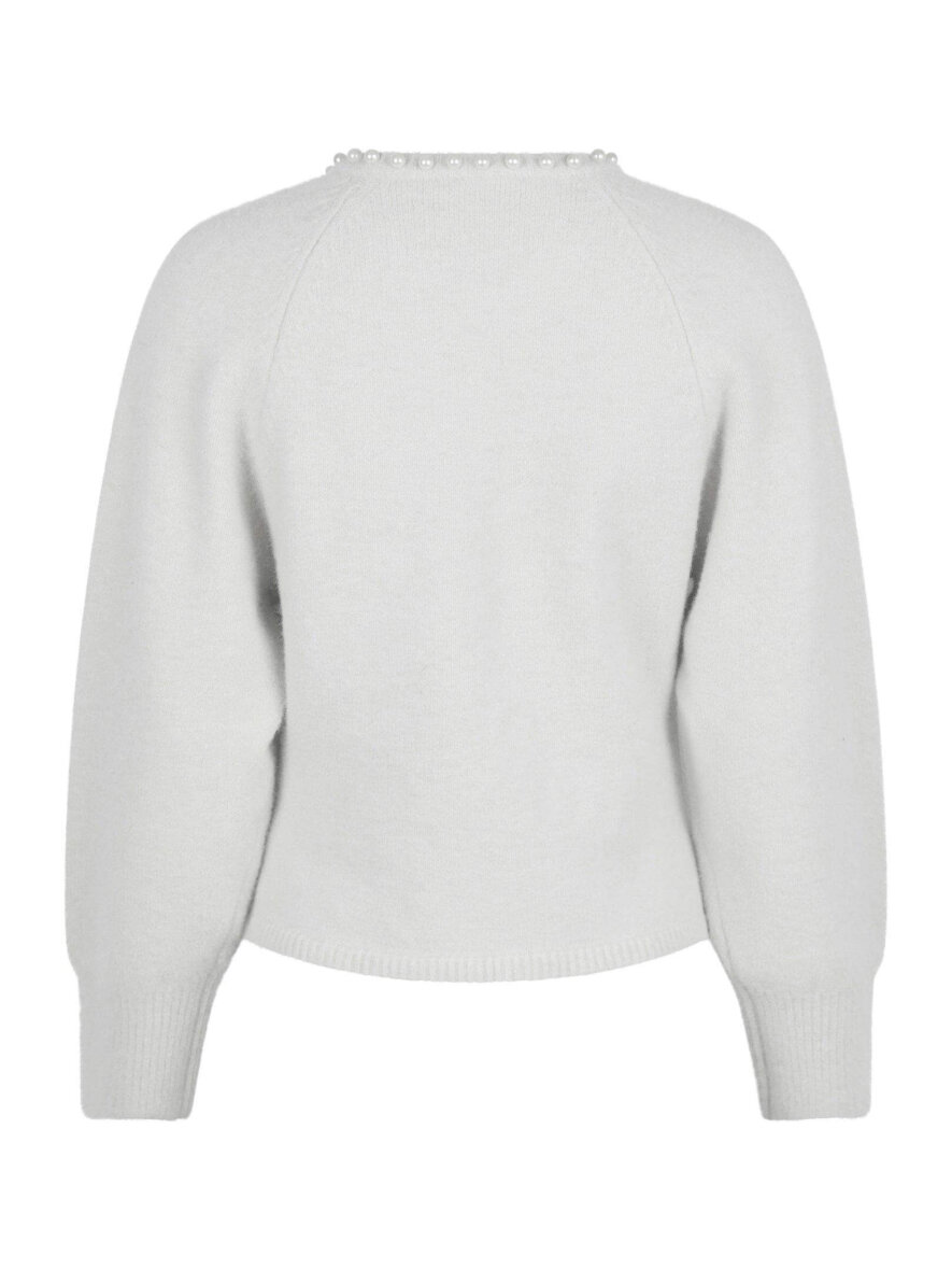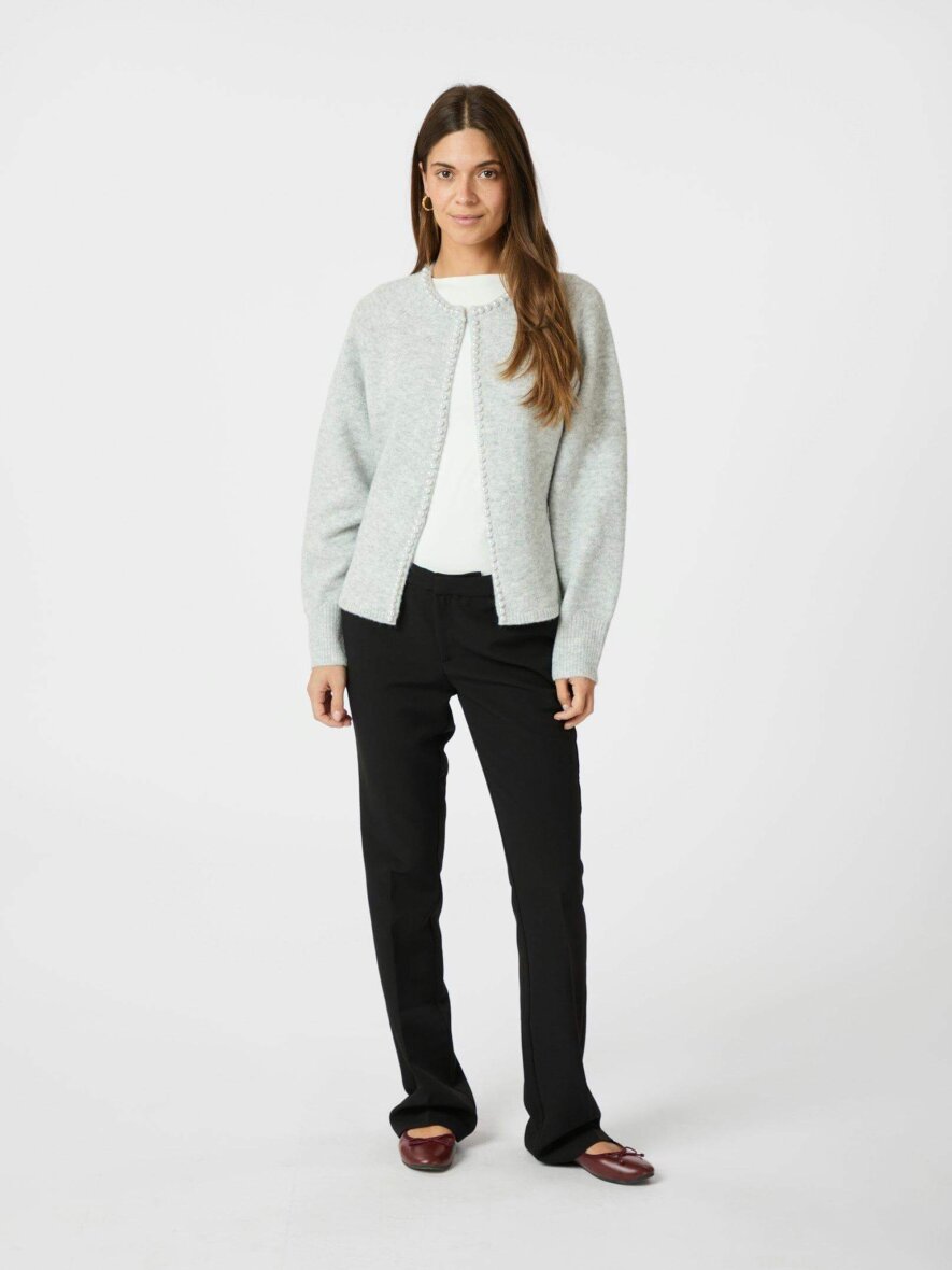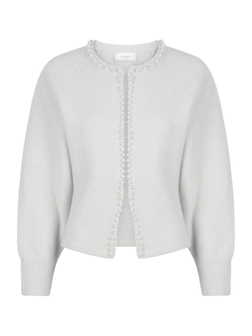 Fin strik cardigan fra Neo Noir i et lysegråt design med fine hvide dekorative perler. Cardiganen er lavet i en blød og vamset kvalitet i en ulden materiale blanding.