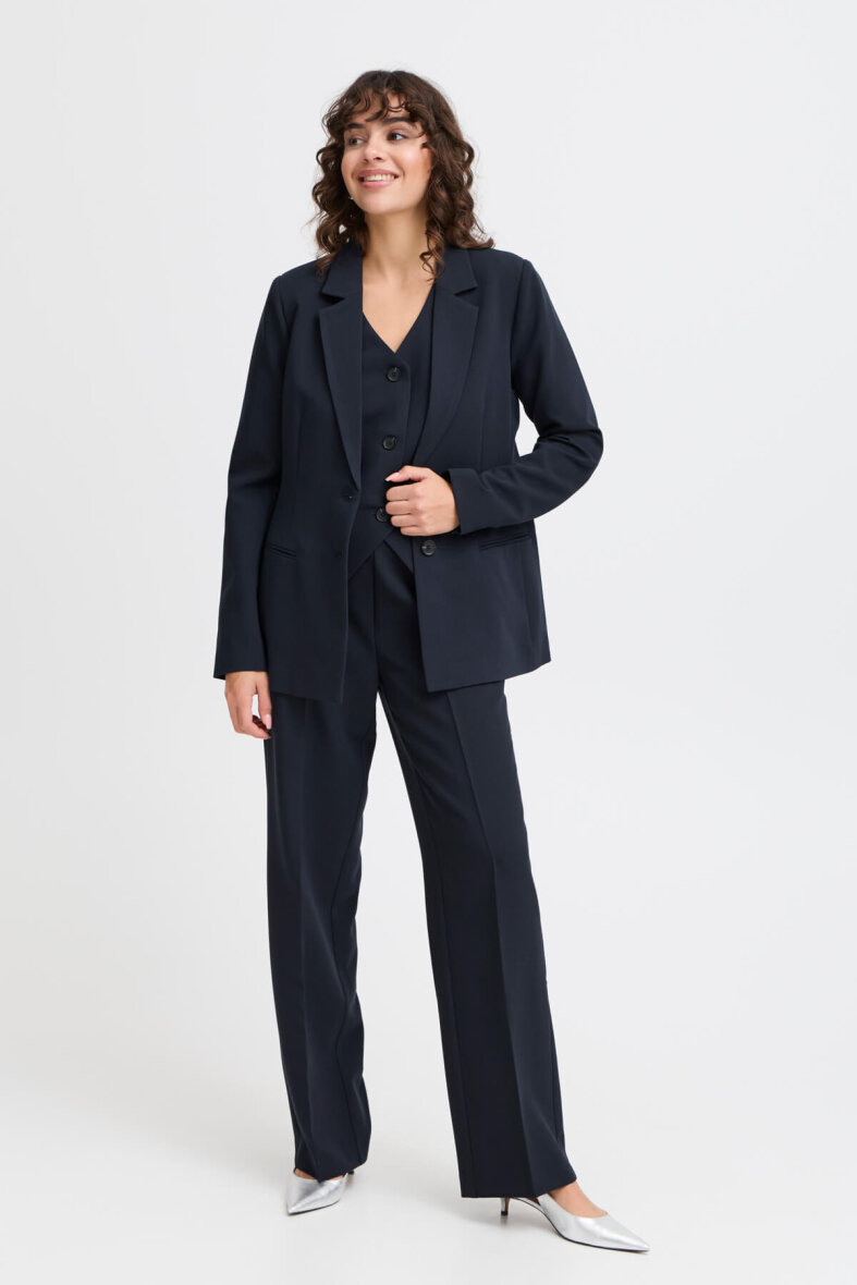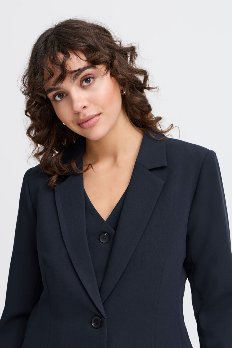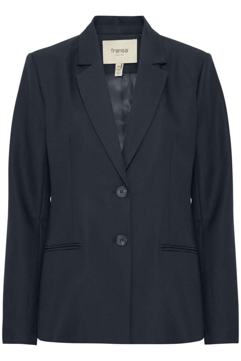 Elegant og stilfuld blazer fra Fransa i et klassisk navy design. Blazeren har klassisk reverskrave og to snydelommer på fronten.