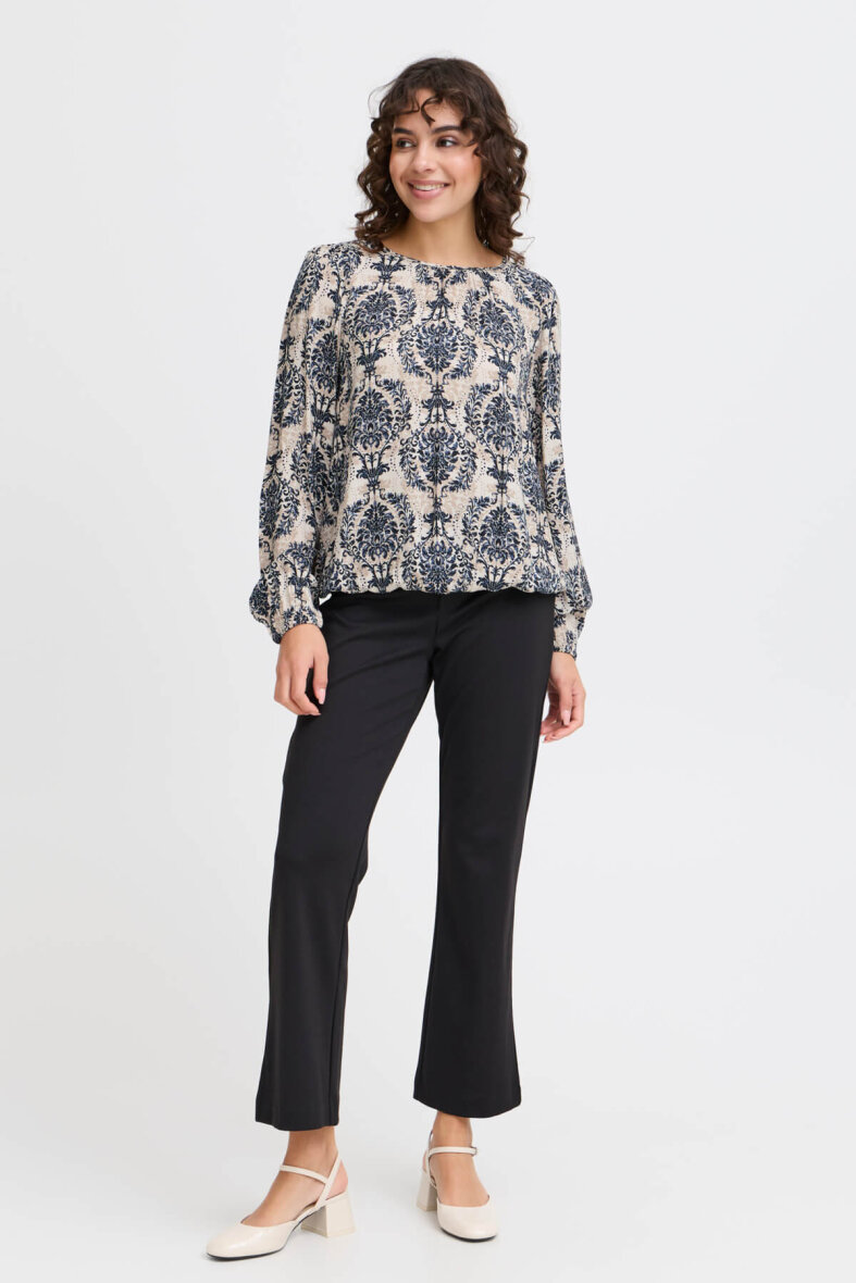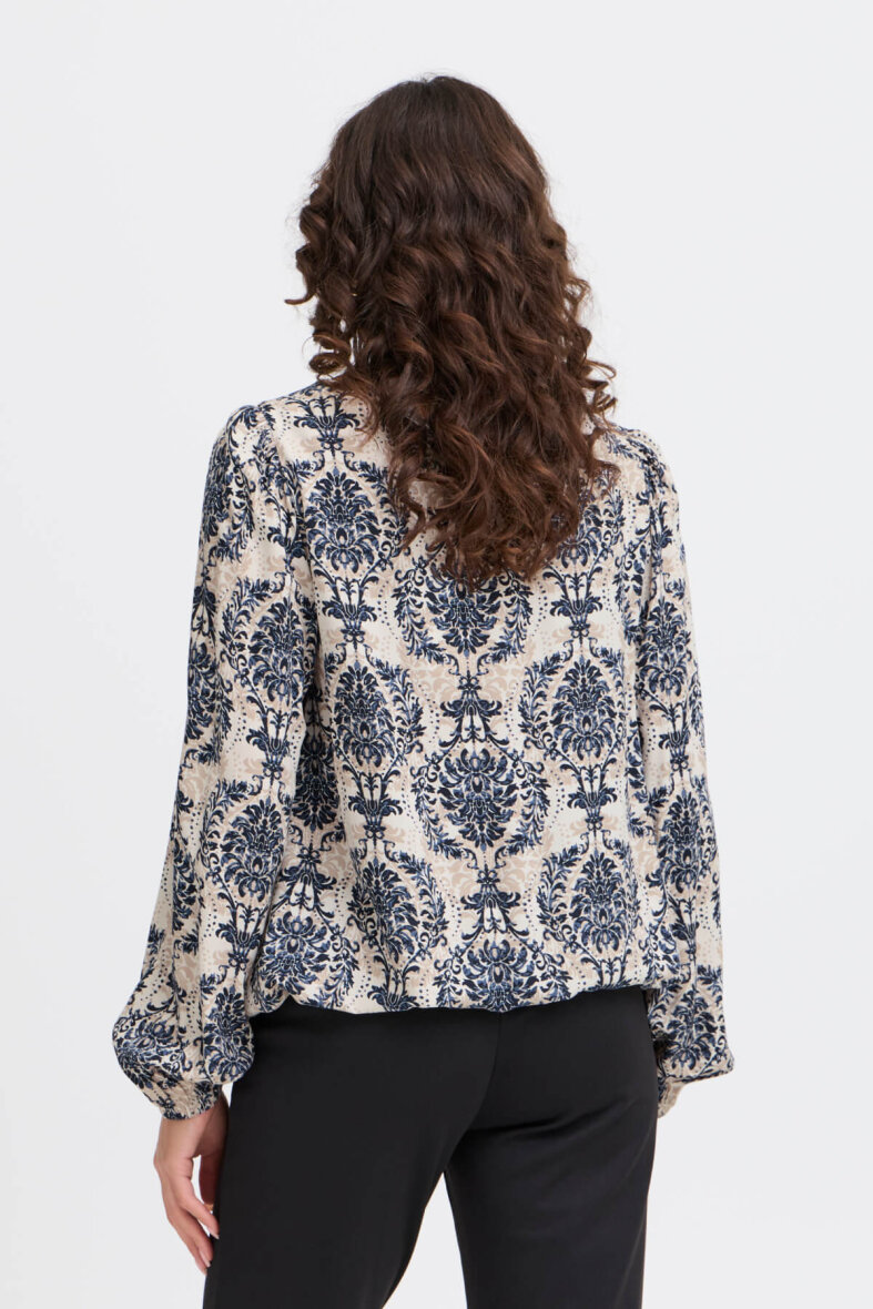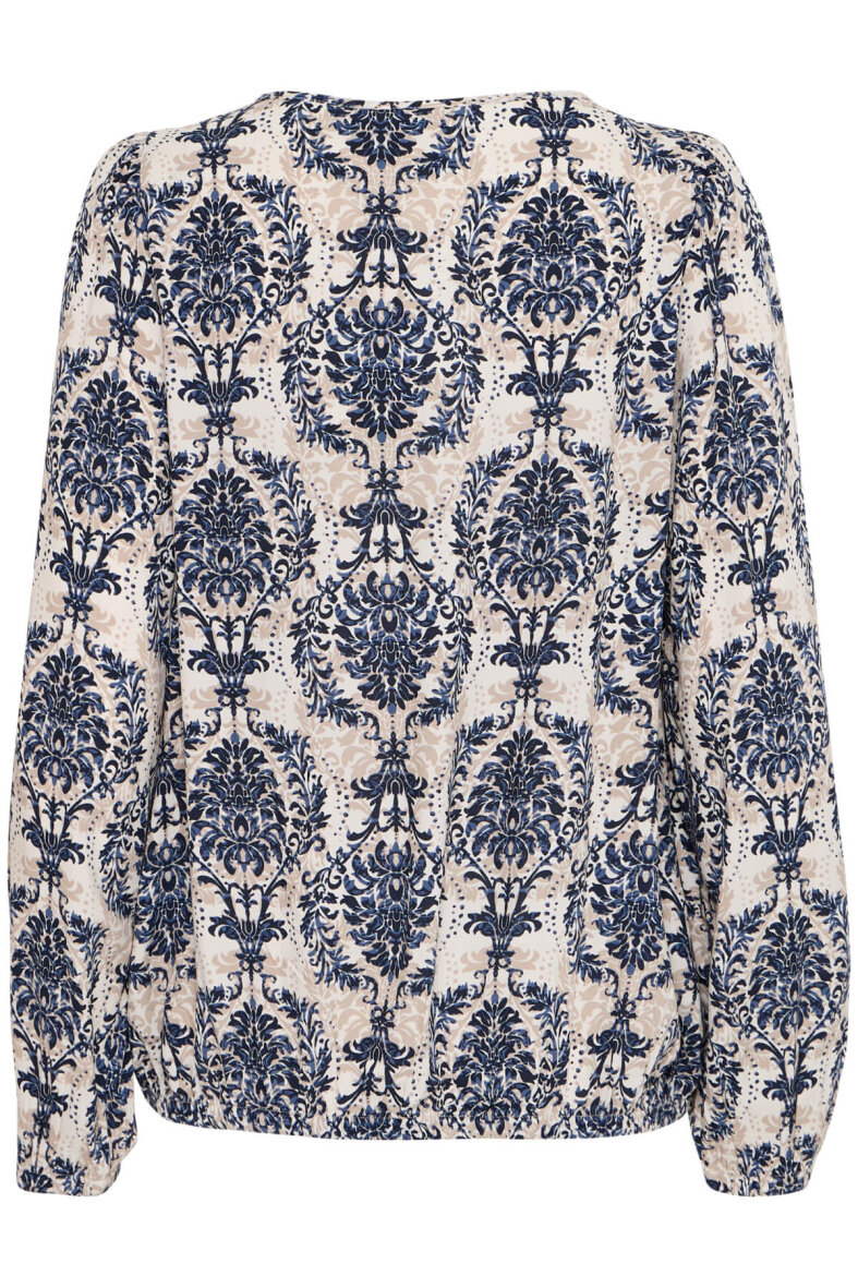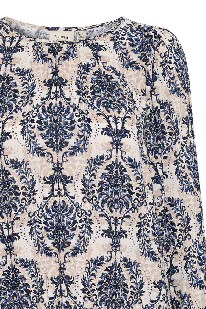 Fin bluse i et smukt botanisk print fra FRANSA i et mix af blå og sandfarvet. Et alsidigt print, der passer til det meste.