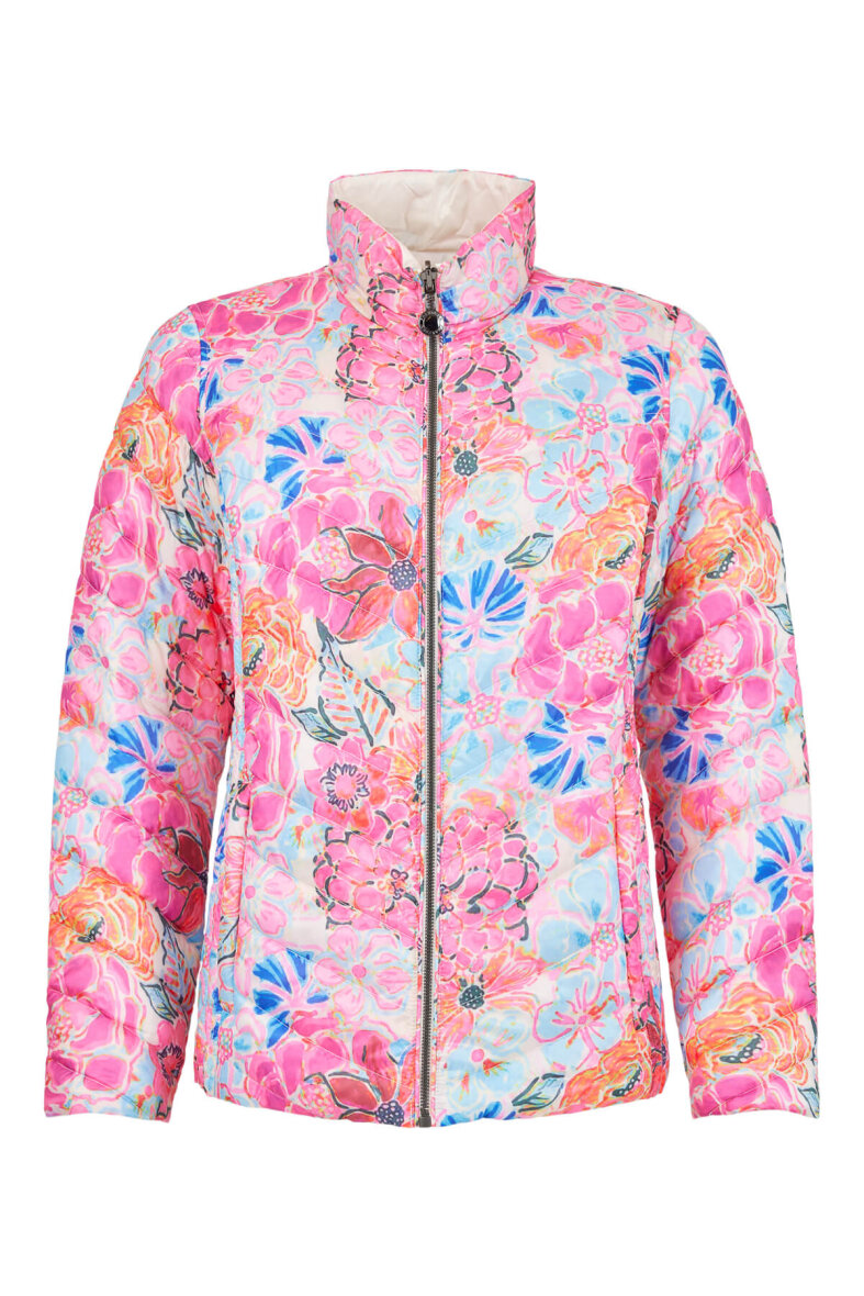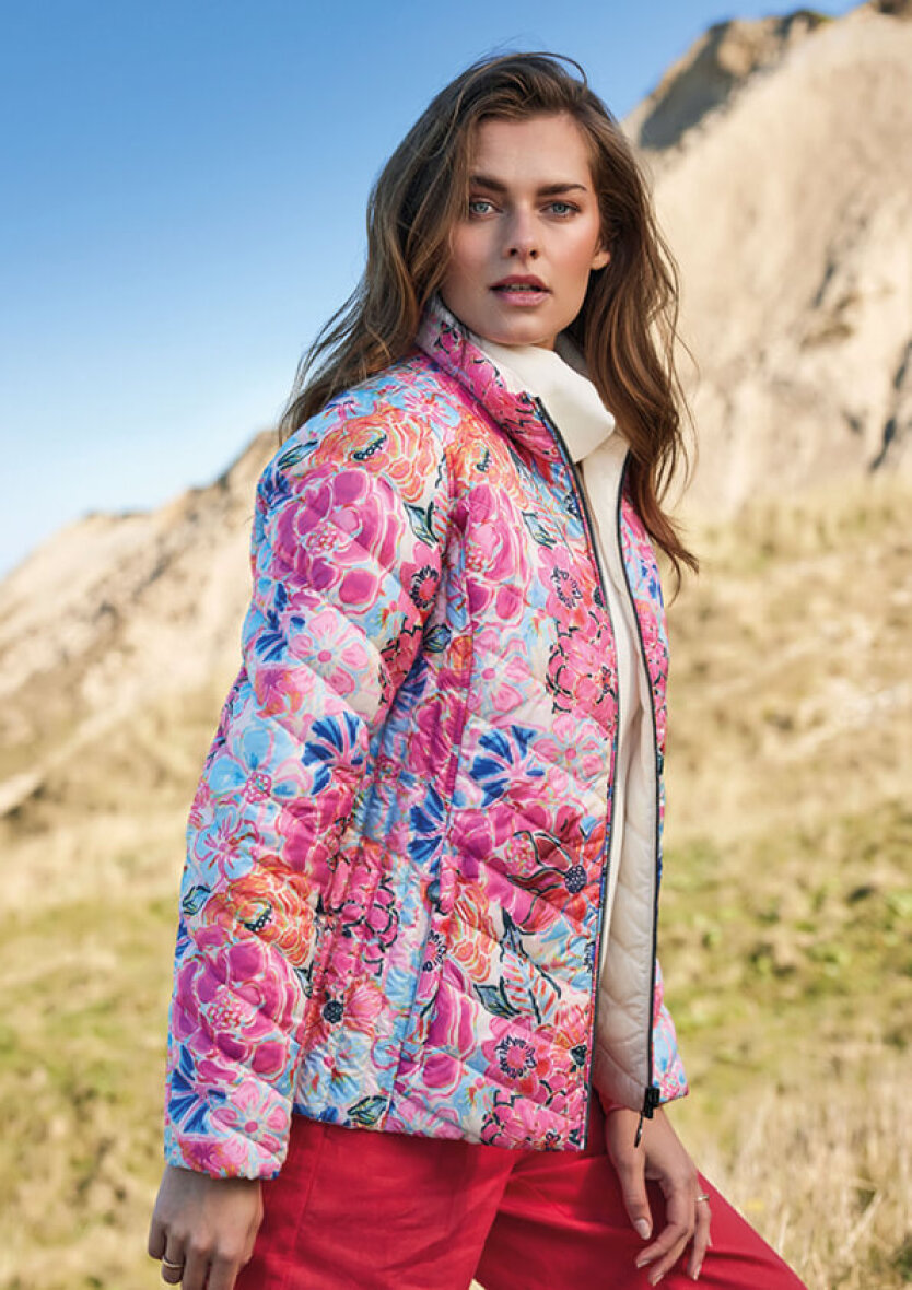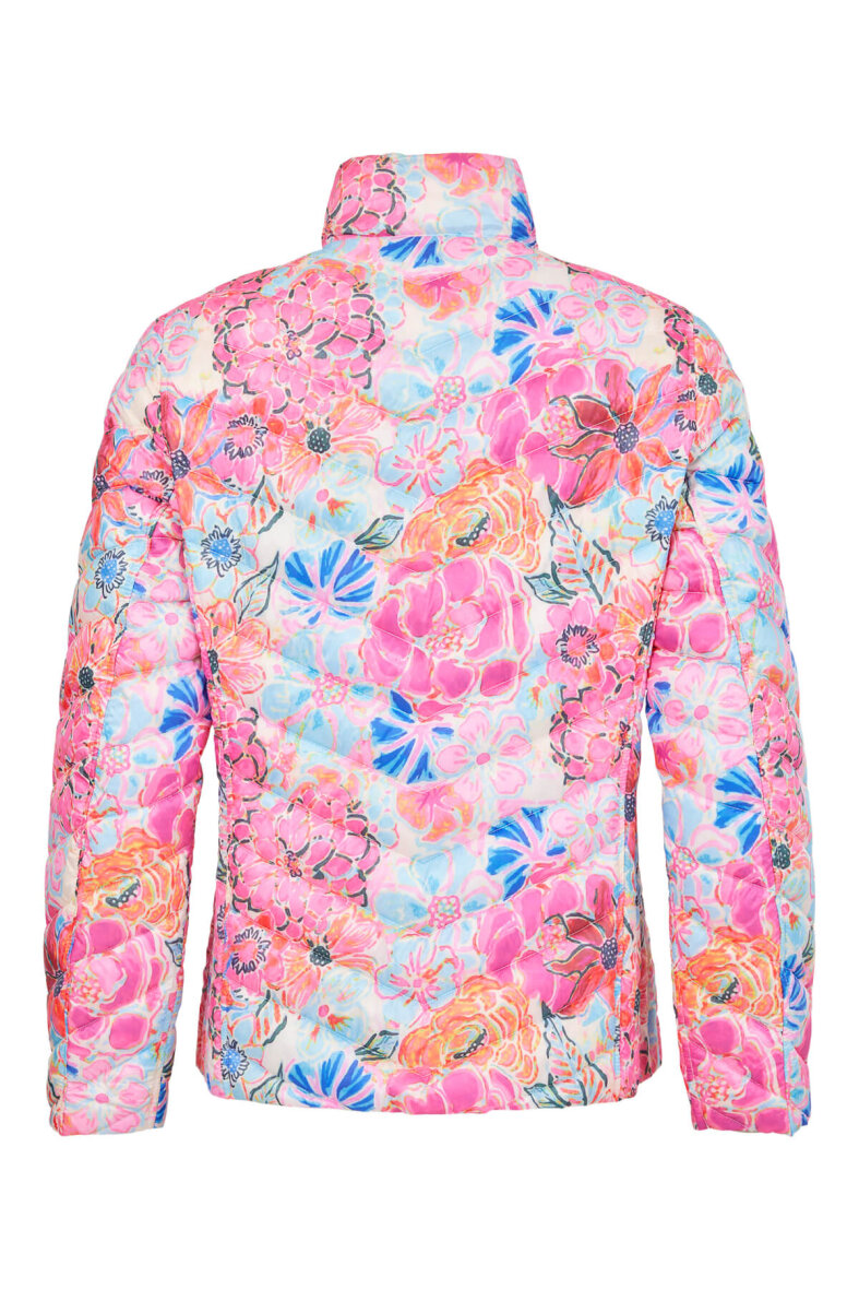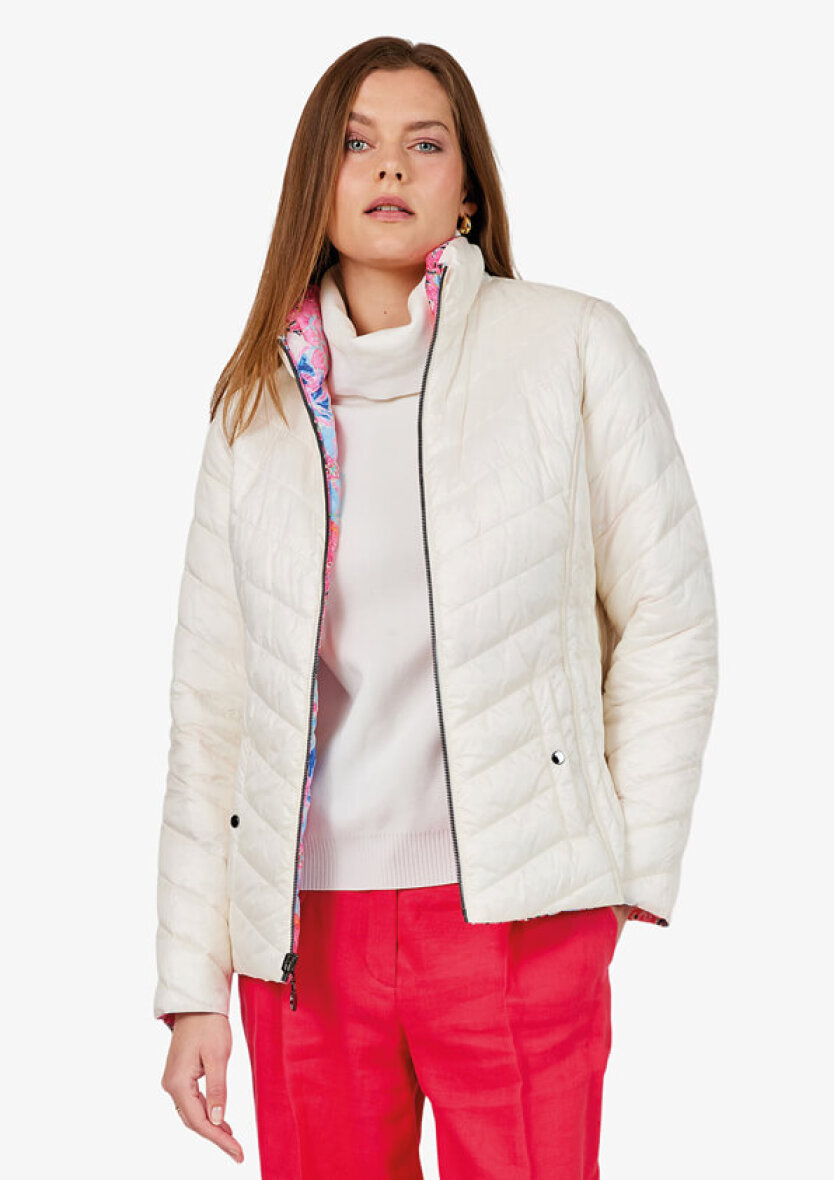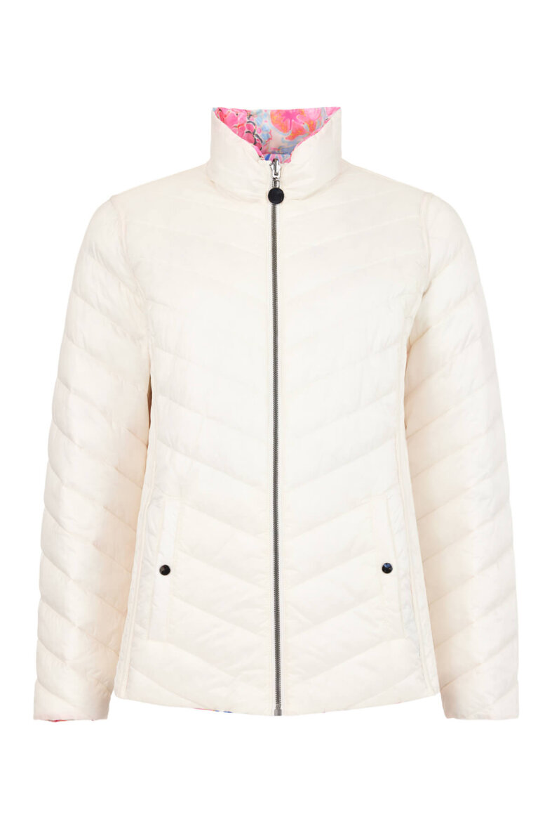 Smart 2-in-1 reversible dunjakke fra Frandsen i teknisk dun. Denne jakke er lavet i lækre bløde materialer og er desuden vendbar. På den ene side af jakken er der et smukt farverigt print i et pink mix, hvor den anden side er i et enkelt hvidt design. Jakken er syet i baner, som giver en flot effekt samt en faconsyet pasform.