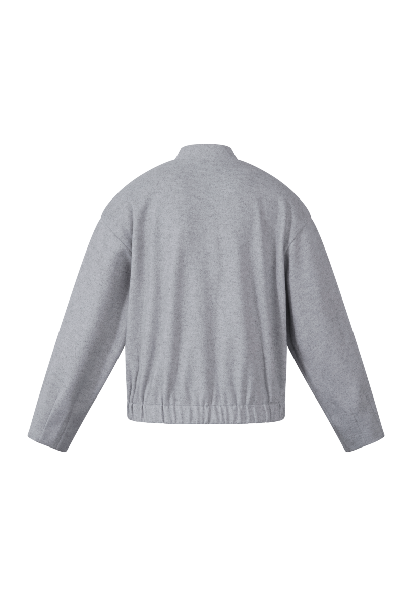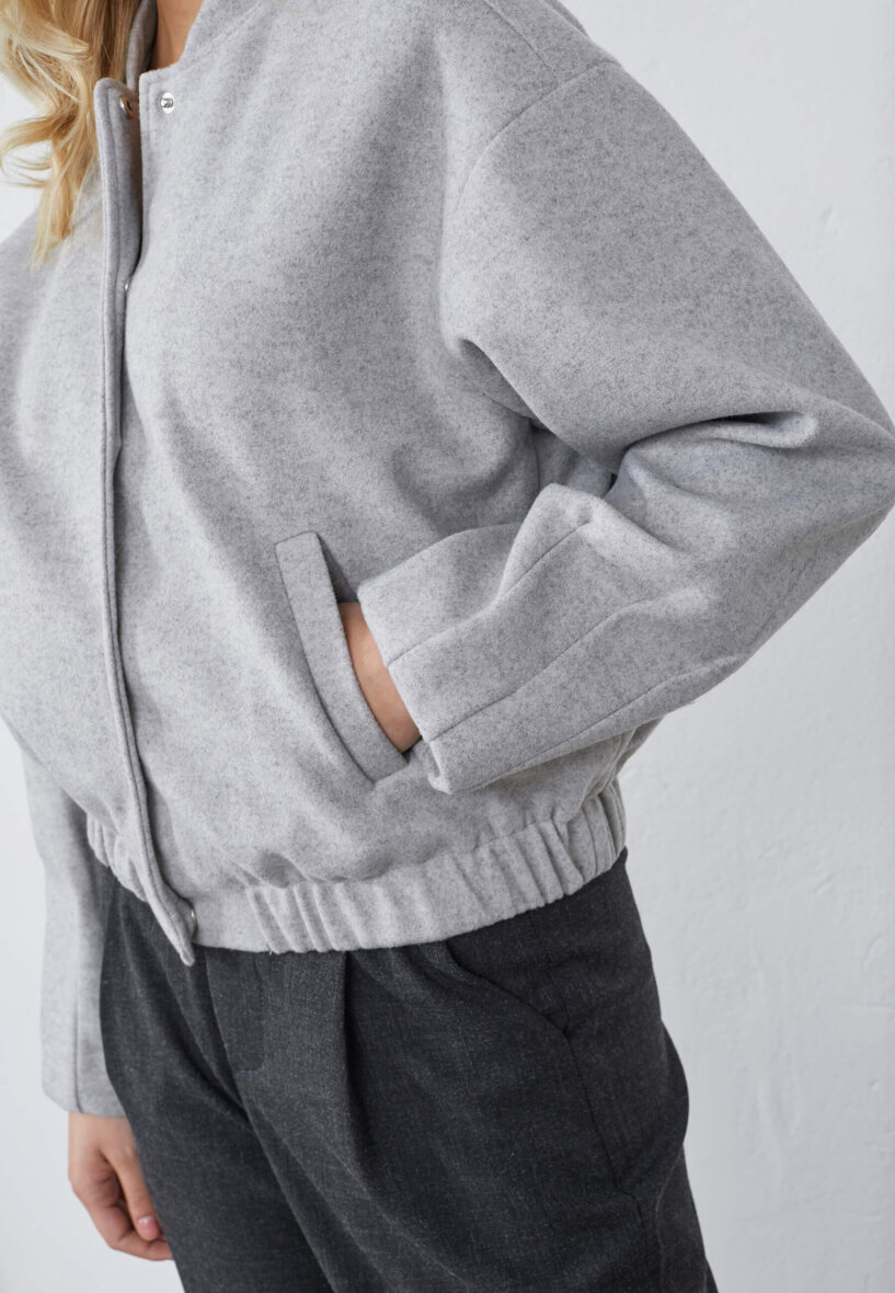 Jakken er med knaplukning langs fronten og stiklommer foran. Jakken er med bred elastik kant forneden, som giver et smart fit. Jakken er lavet i en ulden kvalitet udenpå. Denne bomber jakke er perfekt som cardigan eller overgangsjakke.