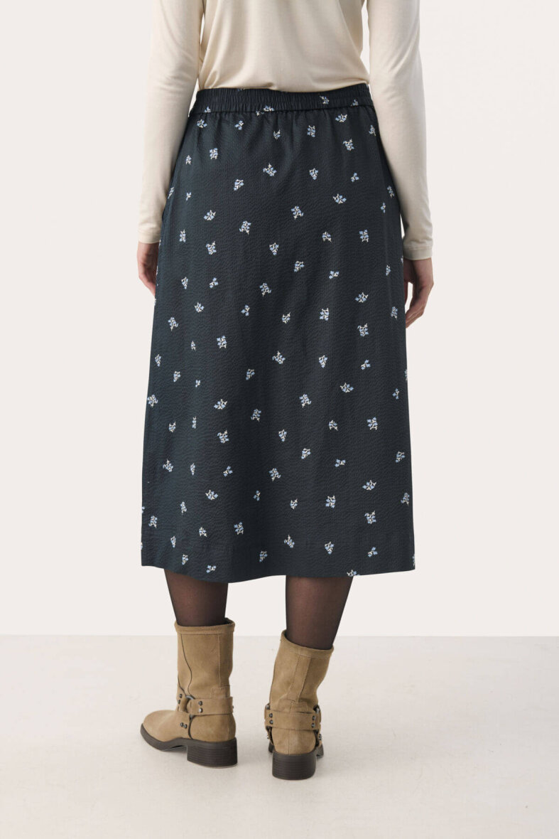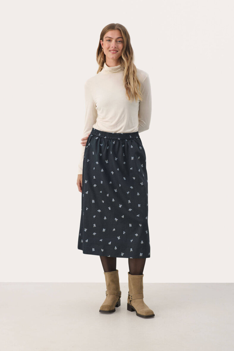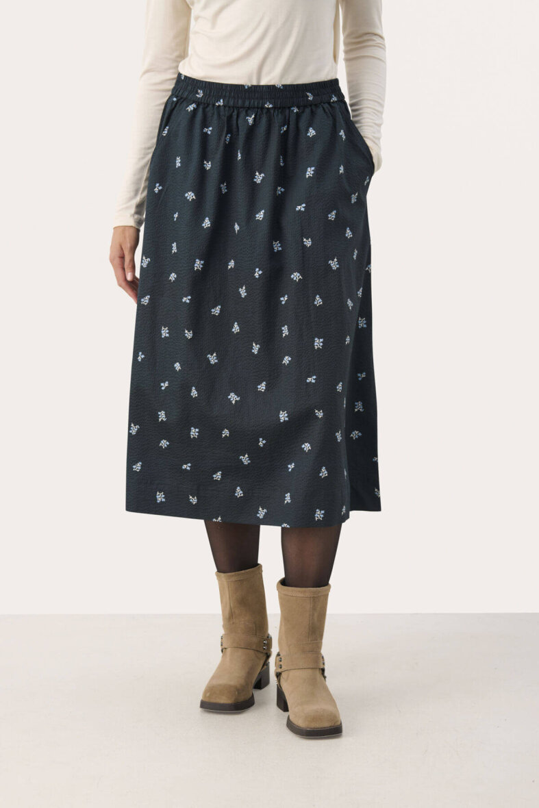 Flot midi nederdel fra Part Two, som går til ned under knæene. Nederdelen er lavet i et flot mørkeblåt design med små blomster over hele nederdelen.