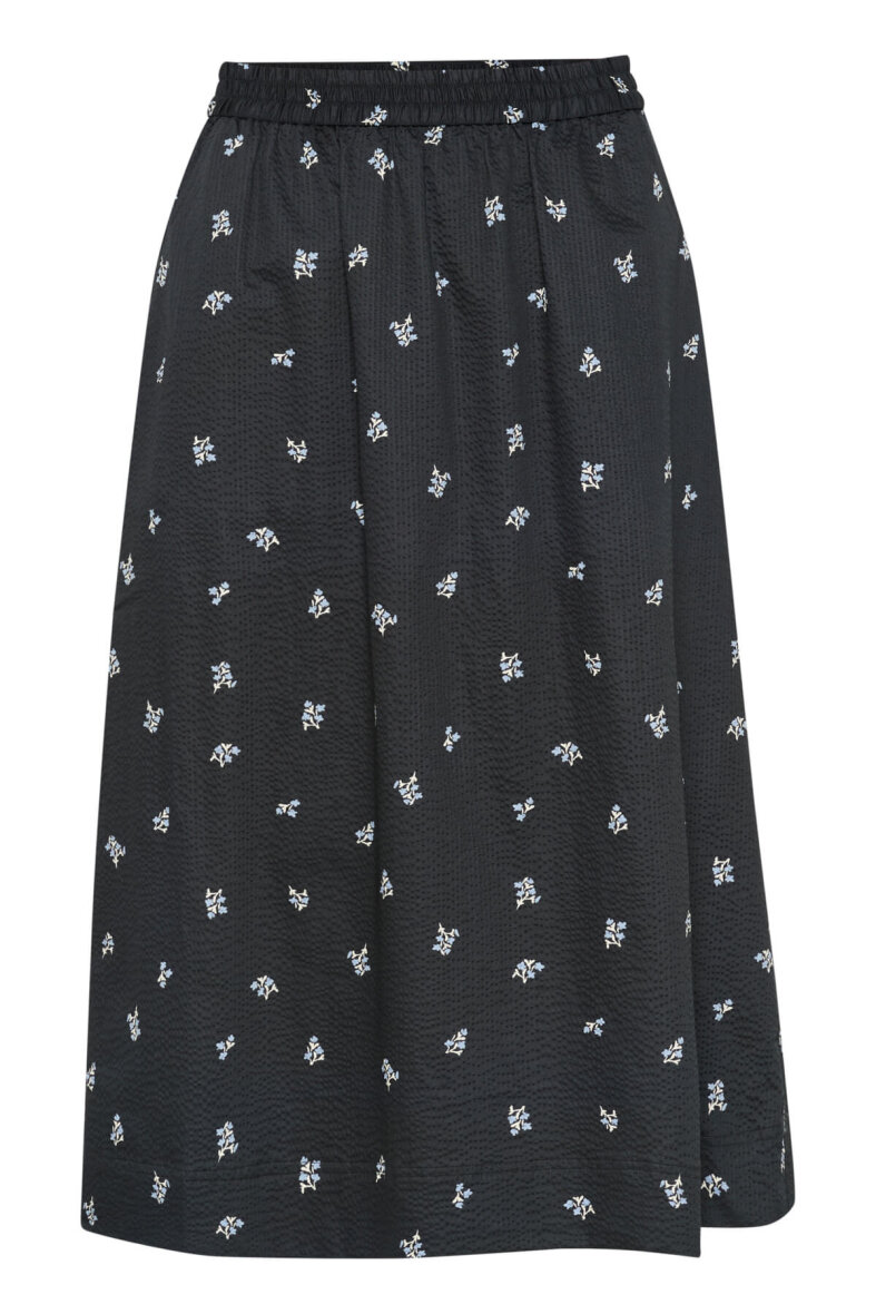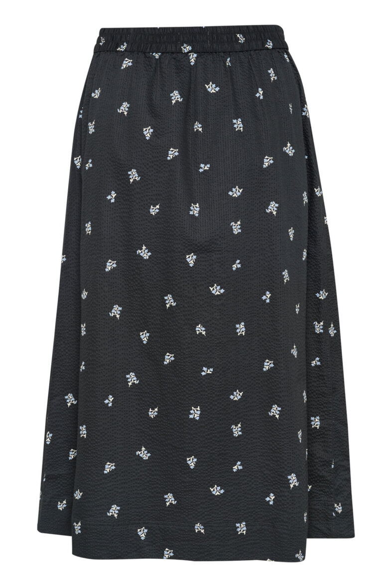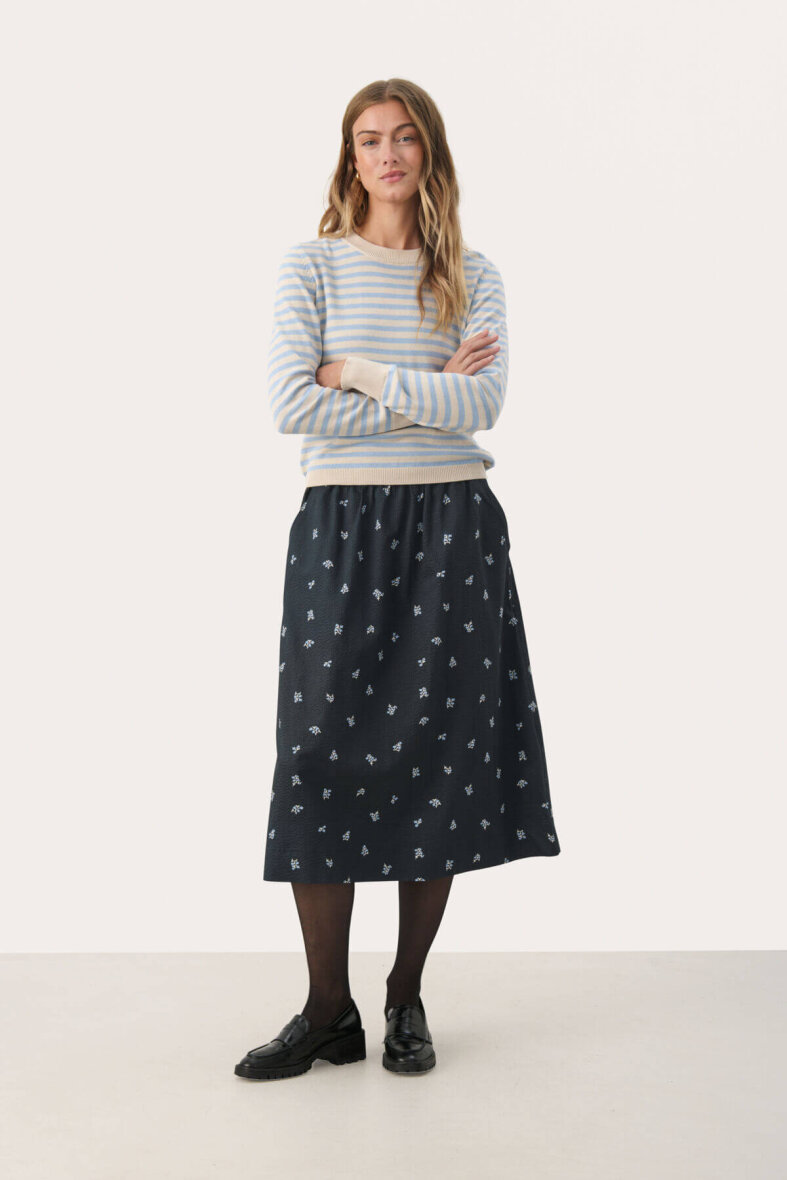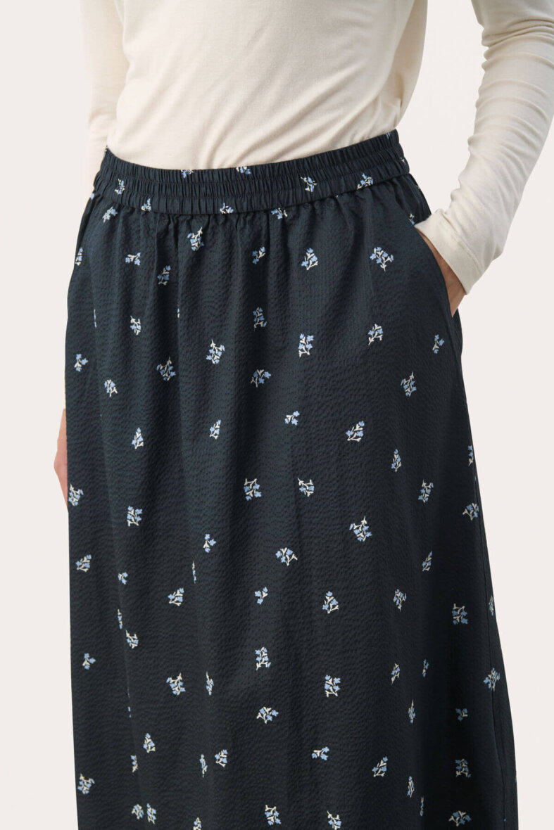 Flot midi nederdel fra Part Two, som går til ned under knæene. Nederdelen er lavet i et flot mørkeblåt design med små blomster over hele nederdelen.
