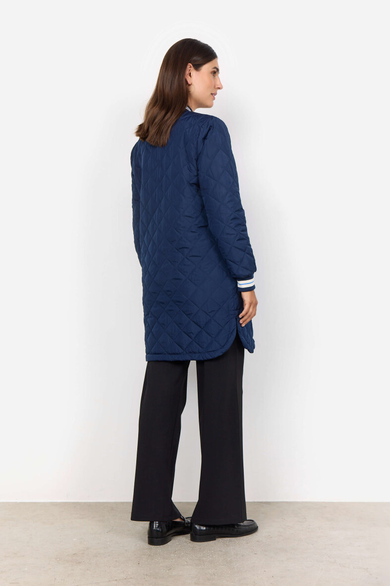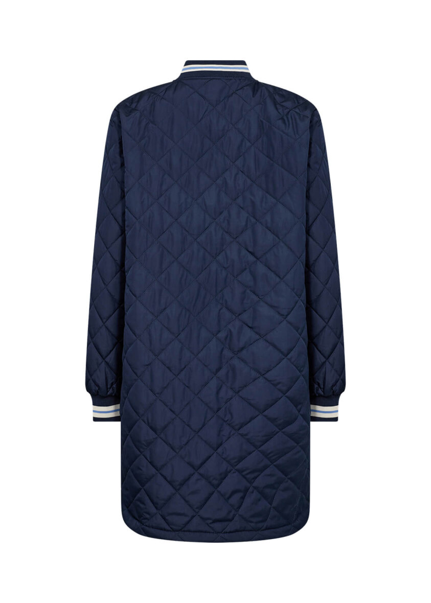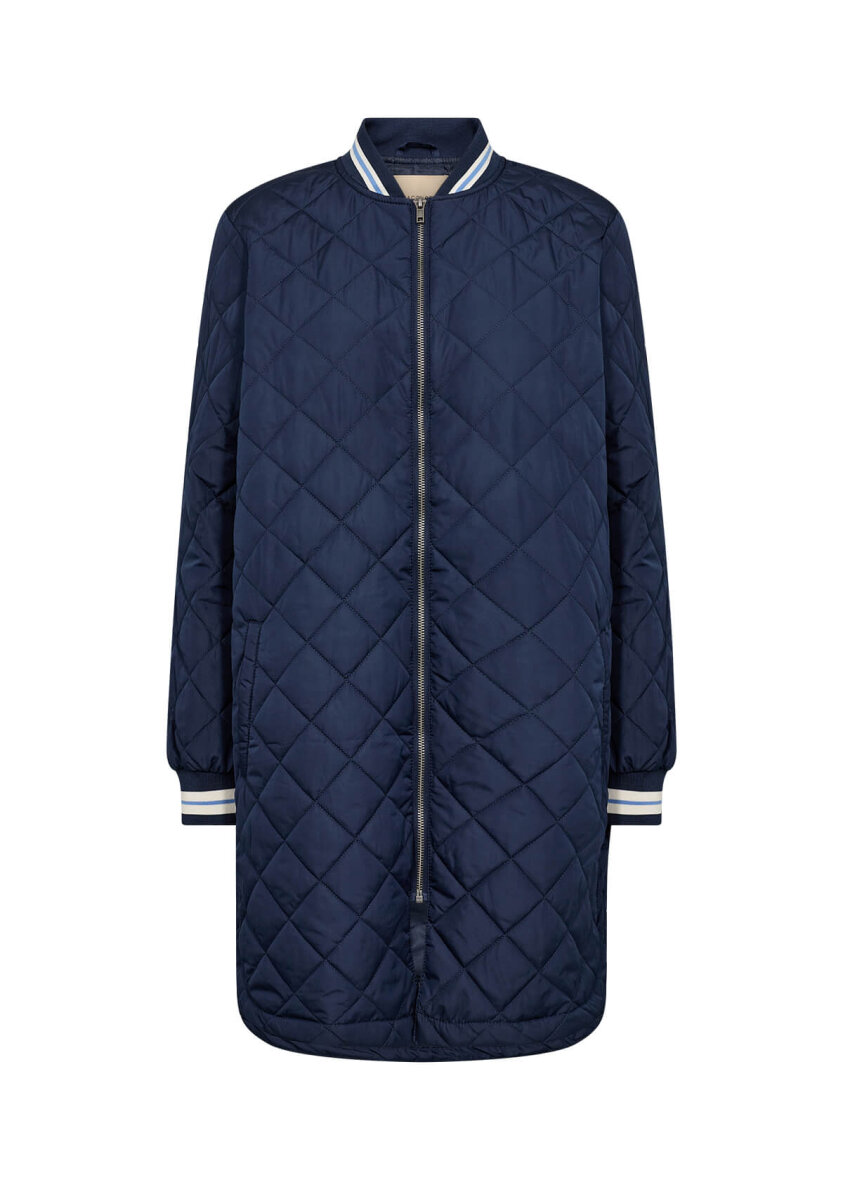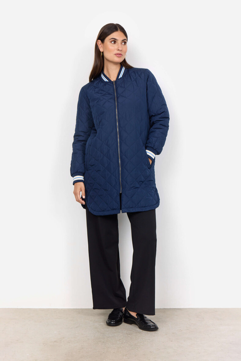 Super lækker navy jakke fra Soyaconcept i en lang pasform. Jakken er lavet i et let quiltet design, som gør den ideel som overgangsjakke.