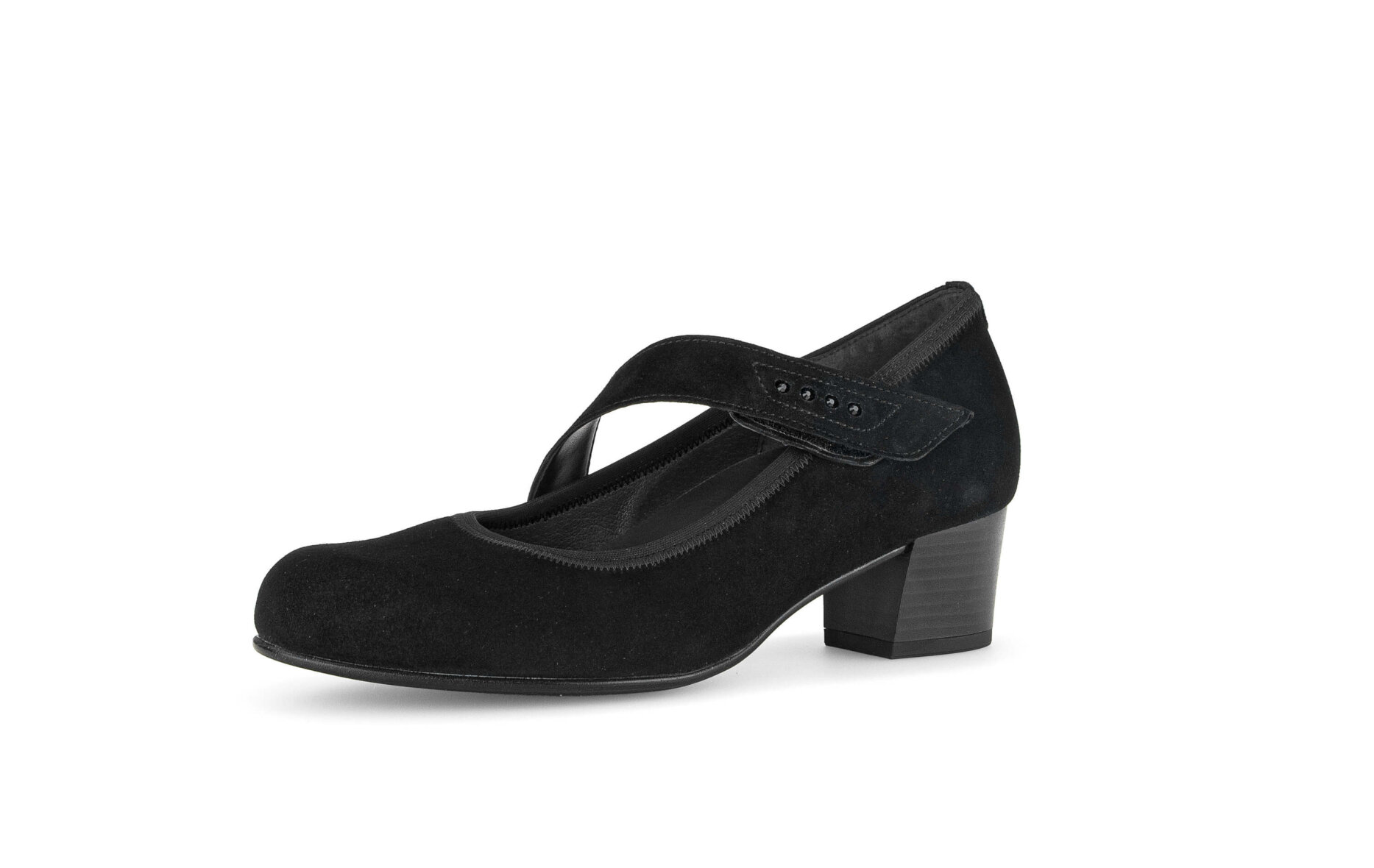 Fin og elegant sort høj sko fra Gabor. Skoen er lavet i sort ruskind udenpå. Skoen er lavet med en smart velcro skrå rem, som er med til at give god konformt ved at holde foden på plads. Derudover tilføjer den en fin detalje til skoen.