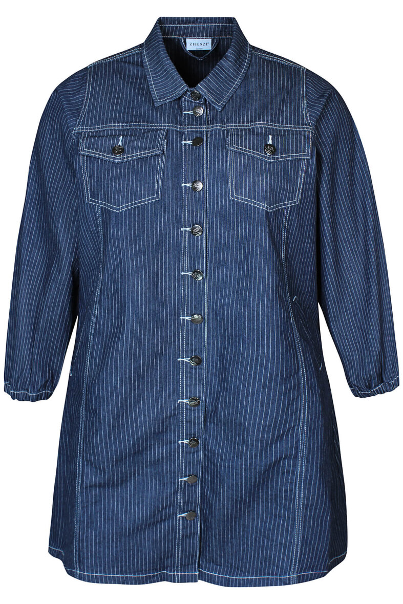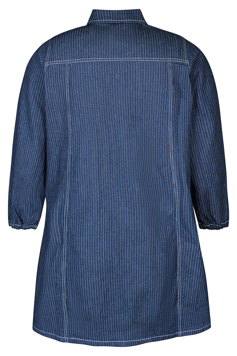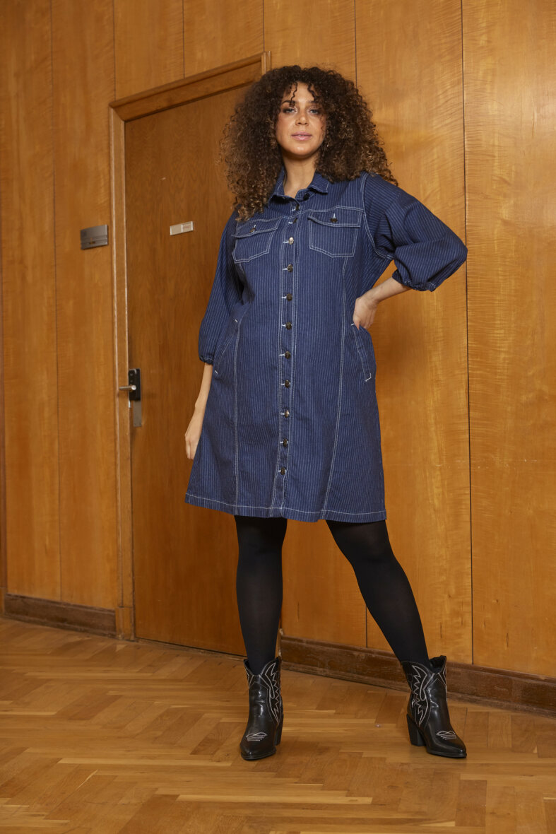 Flot knælang kjole i et moderne denim look fra Zhenzi. Denimkjolen er lavet i en flot mørkeblå denim farve i et moderne pinstripe design, som passer til enhver sæson.