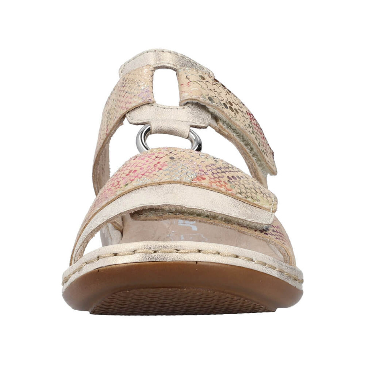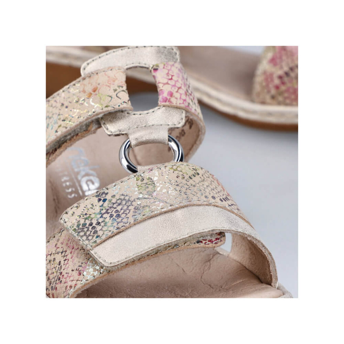 Sandalen har justerbare velcroremme, som sikrer at sandalerne kan tilpasses til netop din fod. Sandalerne indeholder også Riekers AntiStress teknologi, som blandt andet indebære fleksibilitet, lethed, rummelighed samt stødabsorbering. Sandalens ydersål er den lette, fleksible og affjedrende RIRICON-ydersåler, som i kombination med en 32 mm hælforhøjelse, sikrer god komfort og en behagelig gangoplevelse.