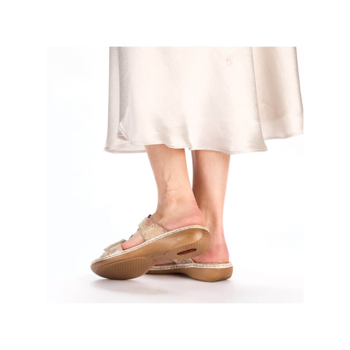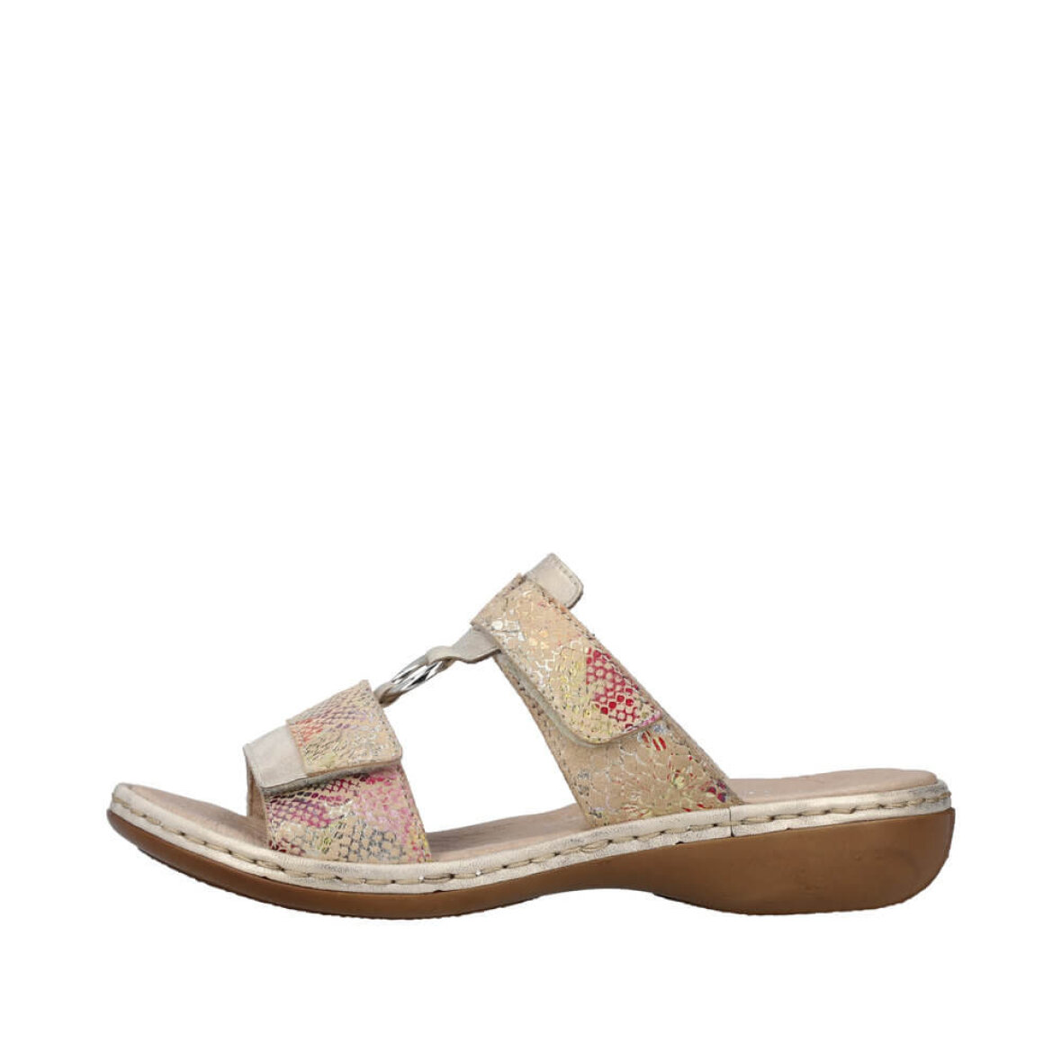 Fin slipper sandal fra Rieker i et farverigt design. Sandalens overdel er fremstillet i imiteret skind.