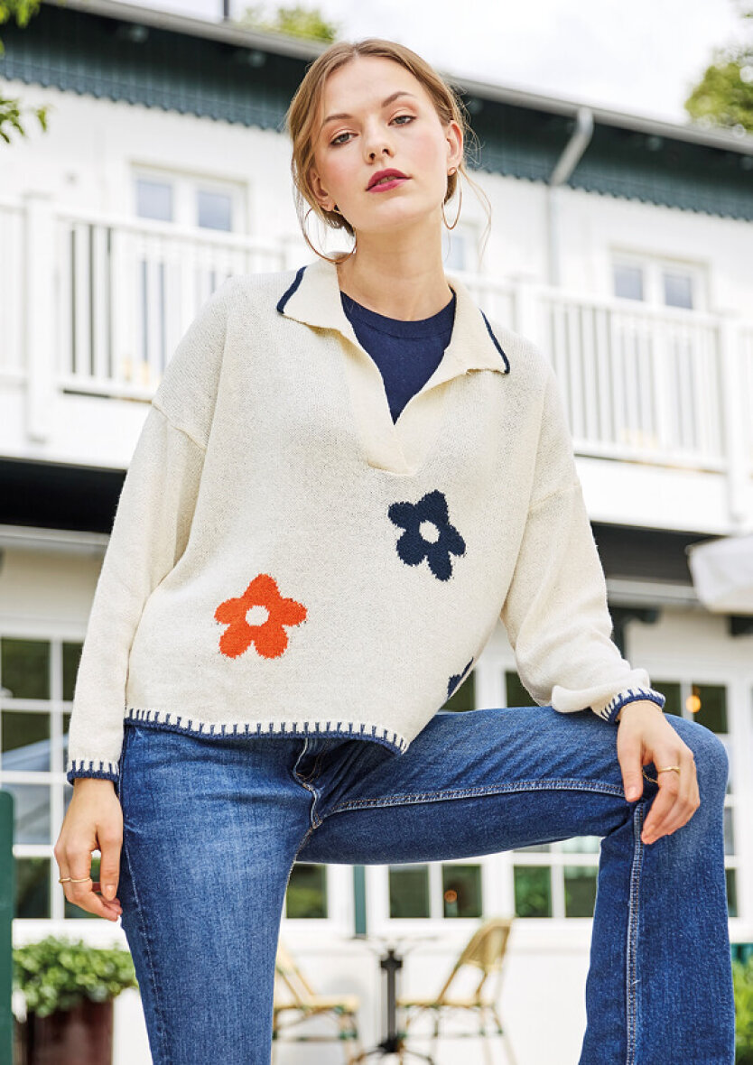 Flot strikket polo fra Skovhuus i et lyst design med blå detaljer samt fine blå og orange blomster.