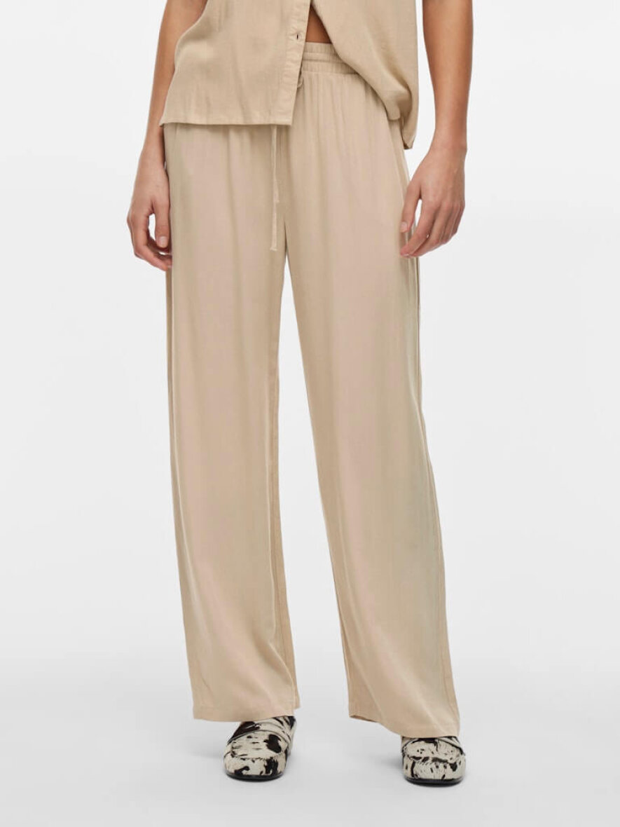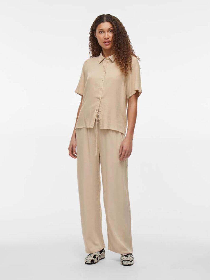 Smarte sandfarvet bukser fra Vila i et afslappet design med brede bukseben. Bukserne er lavet i en blanding af viskose og hør, som gør bukserne super lette og behagelige at have på.