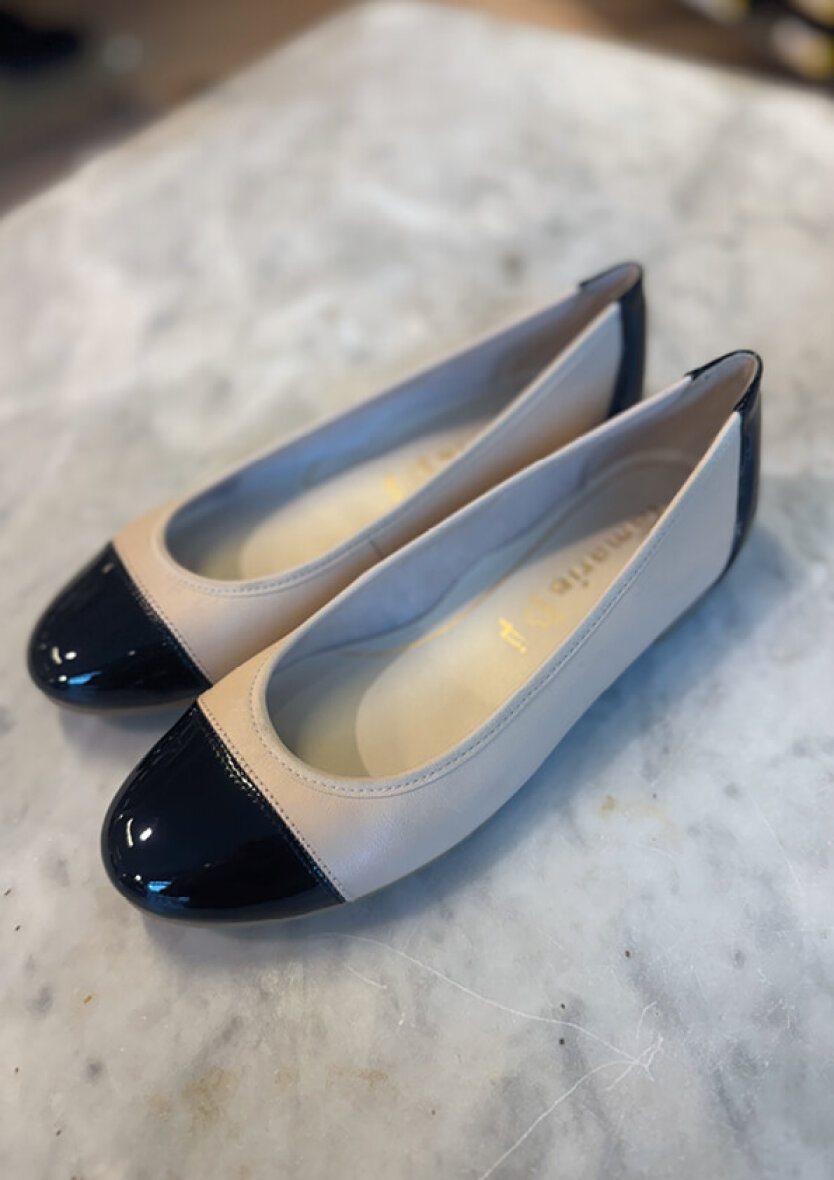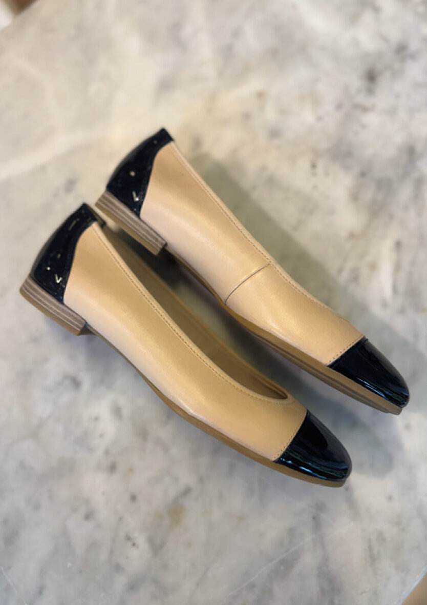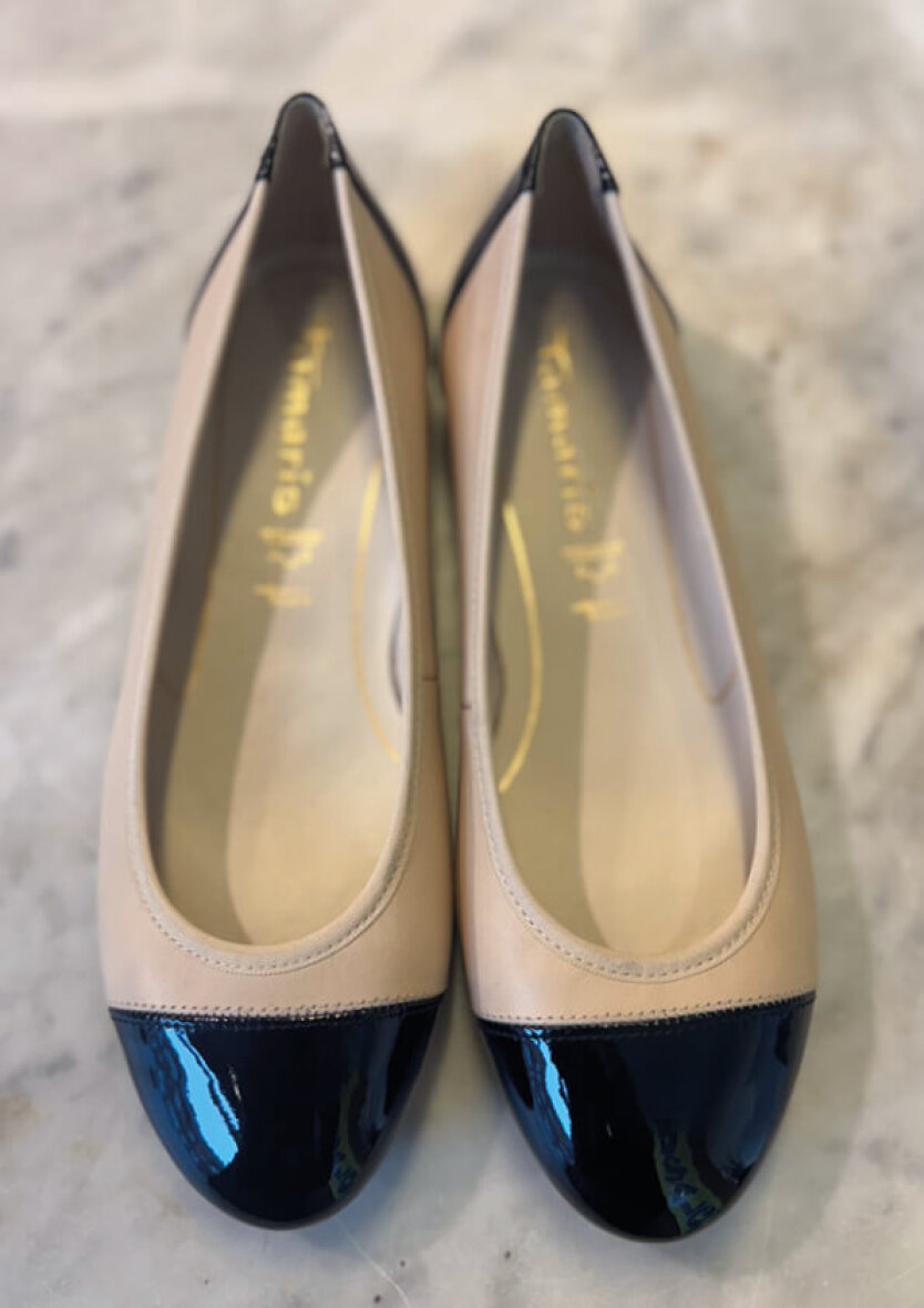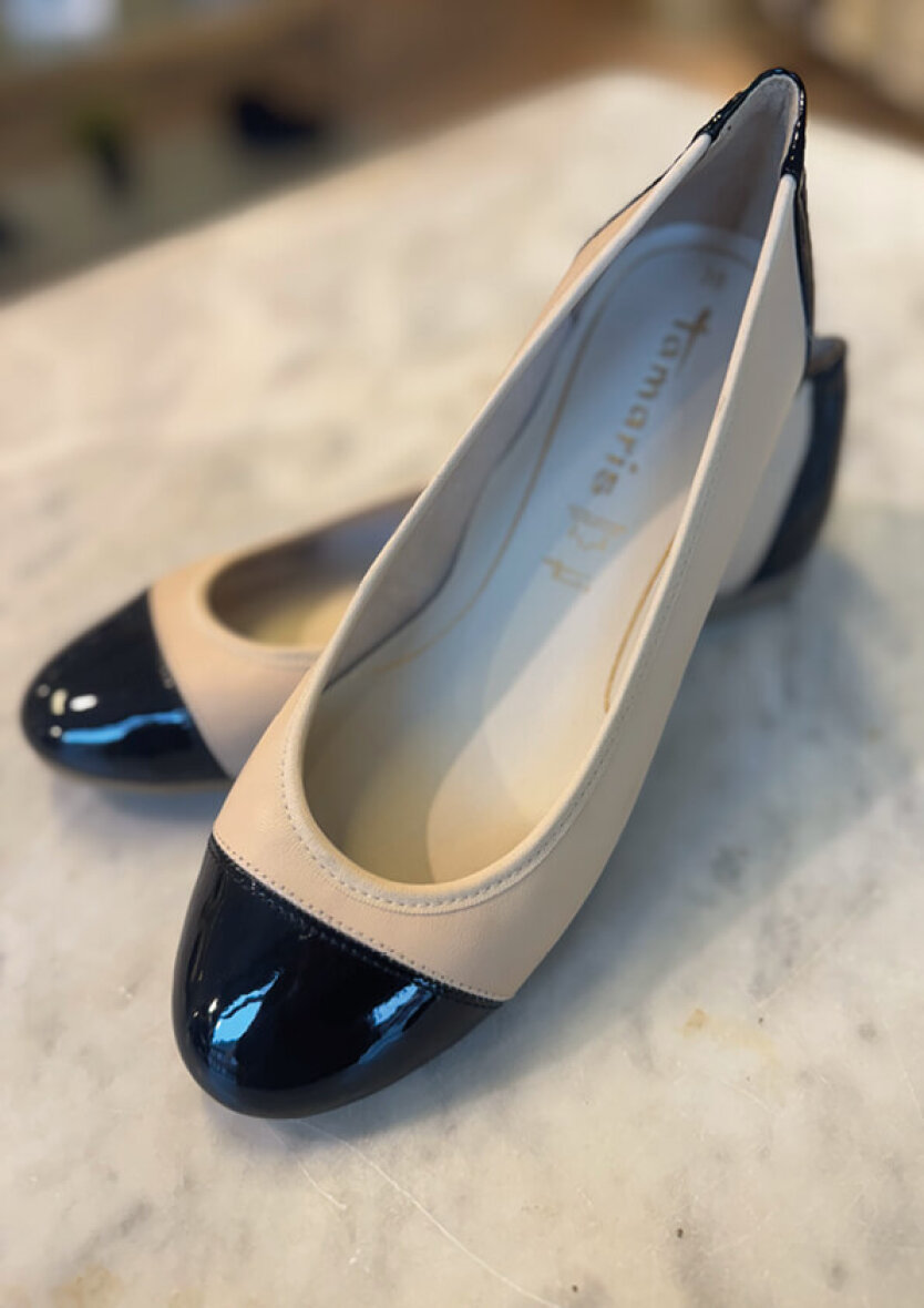 Fine og feminine ballerinaer fra Tamaris i nude comb. Et stilfuldt nude og sort design i en kombination af læder og syntetisk materiale.