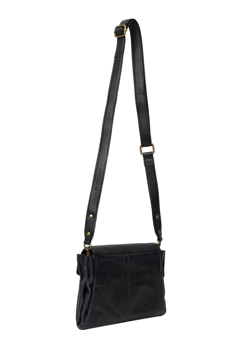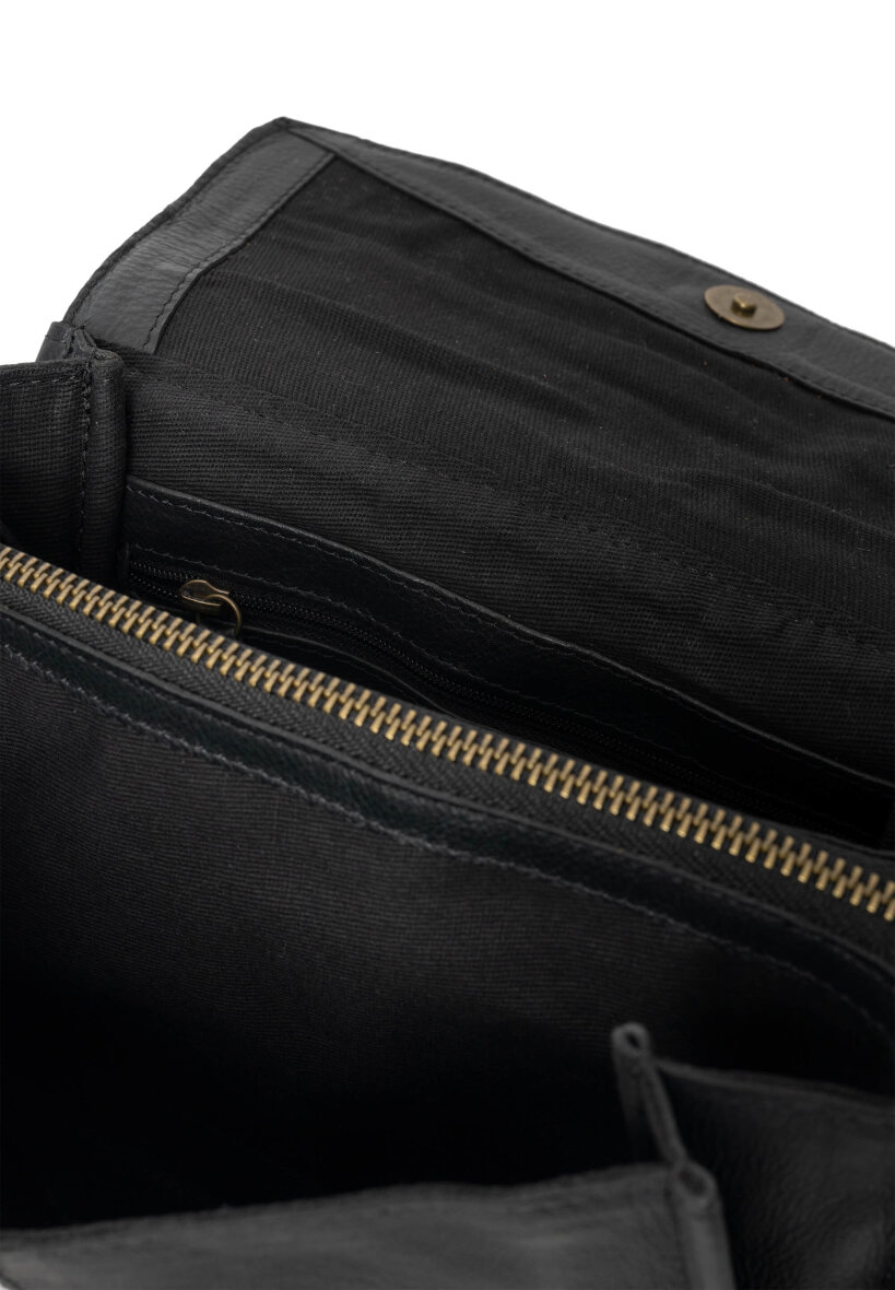 Tasken er lavet i skind, som sammen med messings detaljerne giver tasken en smart retro effekt. Liri tasken består af to åbne rum samt en lynlåslomme i midten. Der er tilmed en lille lynlåslomme indvendigt og tasken lukkes med en smart klap med trykknap. Aftagelig og justerbar rem medfølger.