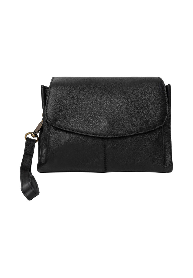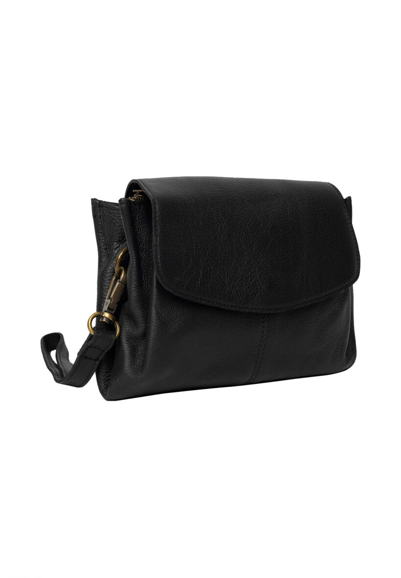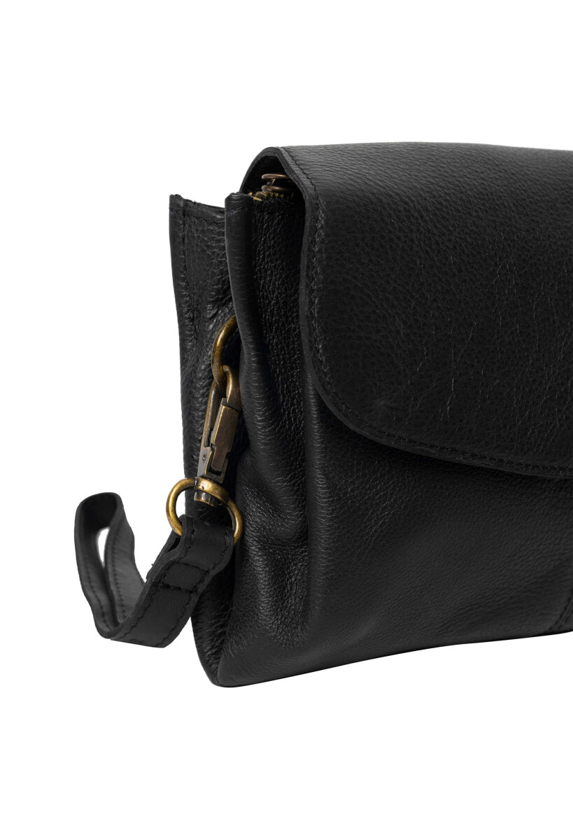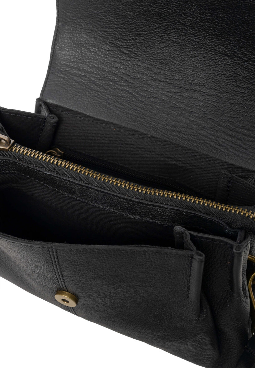 Tasken er lavet i skind, som sammen med messings detaljerne giver tasken en smart retro effekt. Liri tasken består af to åbne rum samt en lynlåslomme i midten. Der er tilmed en lille lynlåslomme indvendigt og tasken lukkes med en smart klap med trykknap. Aftagelig og justerbar rem medfølger, som gør det muligt også at bruge tasken som håndtaske.