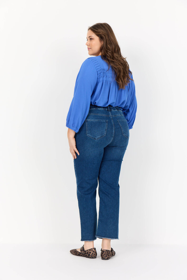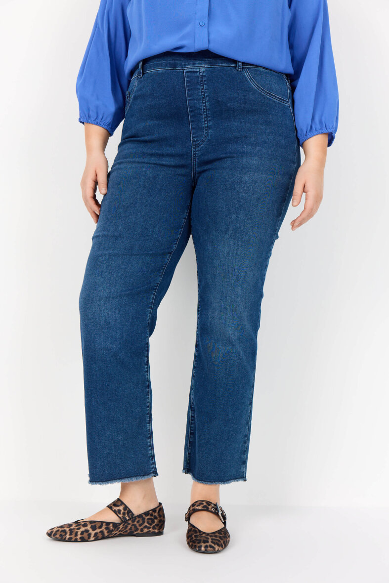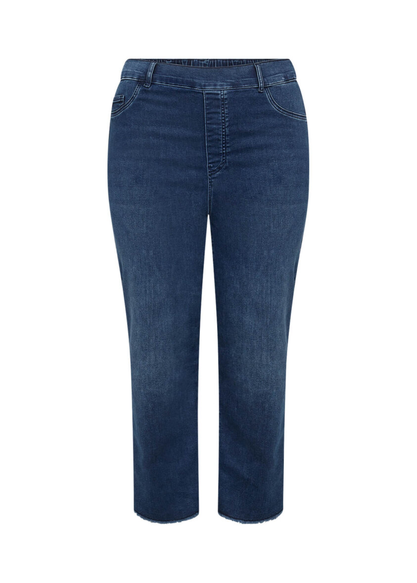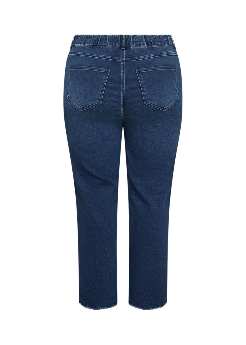 Bukserne er lavet med høj talje i en let cropped længde. Bukserne er lavet i slimfit med tætsiddende bukseben. Denim bukserne er med fast linning foran og elastisk linning bagpå. Bukserne er lavet i en skøn kvalitet med masser af stretch, som gør dem virkelig behagelige at have på.