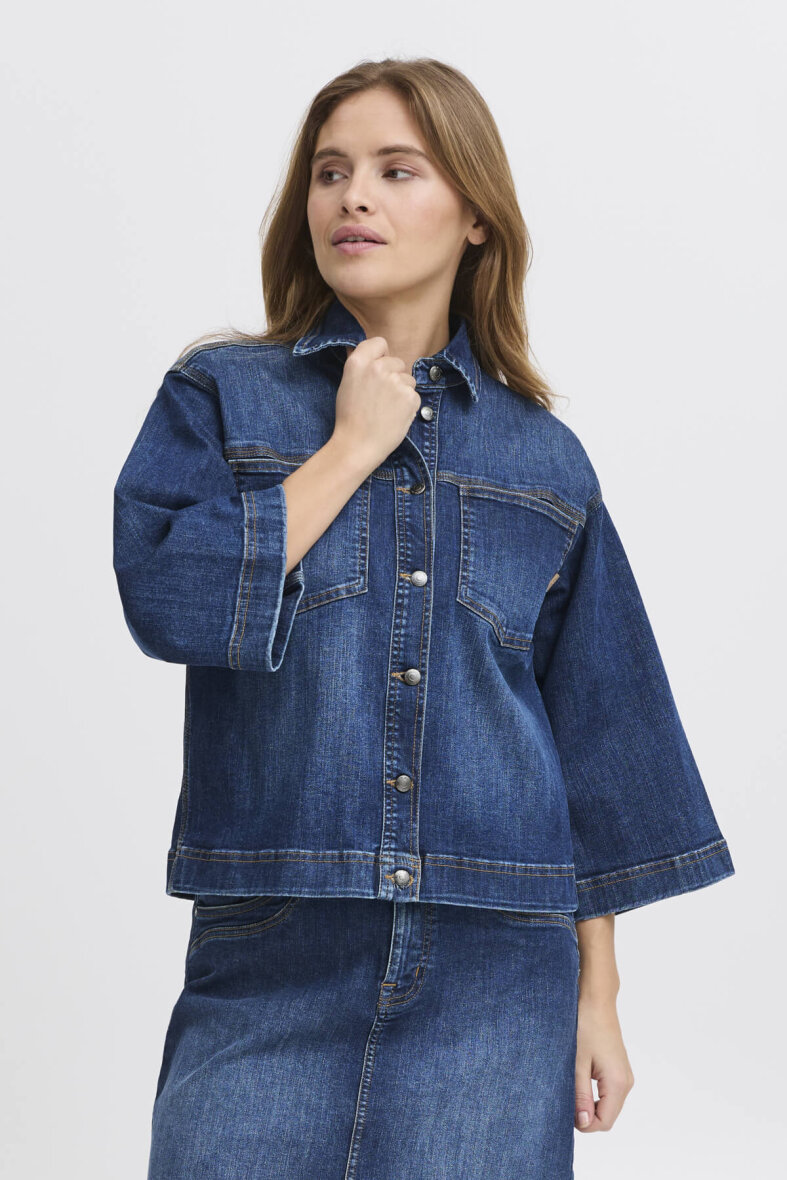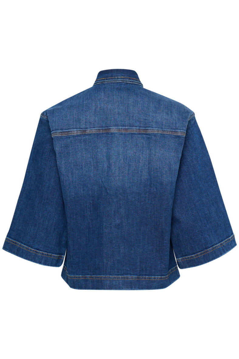 Denim jakken er med krave og gennemgående knapper langs fronten samt to smarte brystlommer. Kort afslappet pasform i en lækker bomuld kvalitet med stretch.