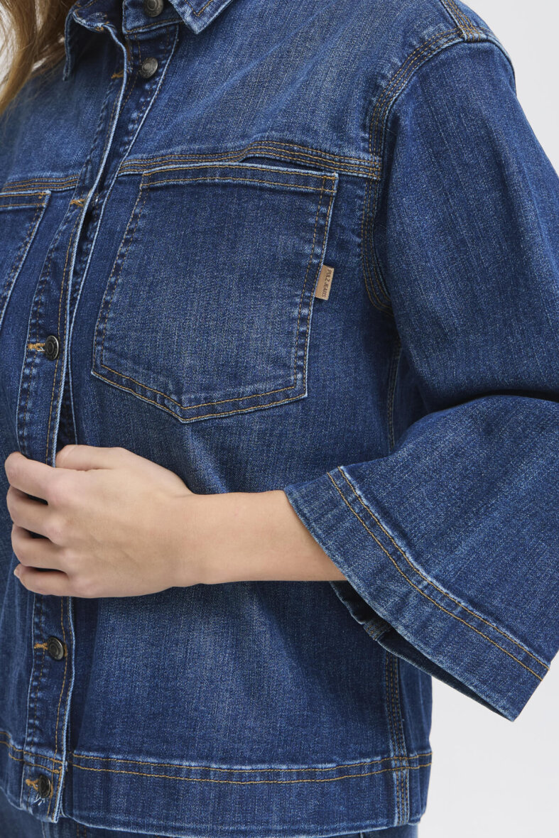 Smart mørkeblå denim jakke fra Pulz Jeans i modellen Katja. Jakken er lavet i et moderne design med brede 3/4 ærmer, som giver et smart udtryk.