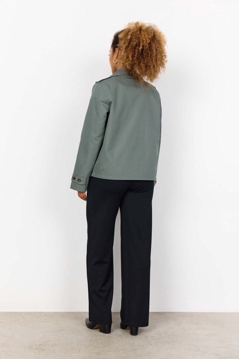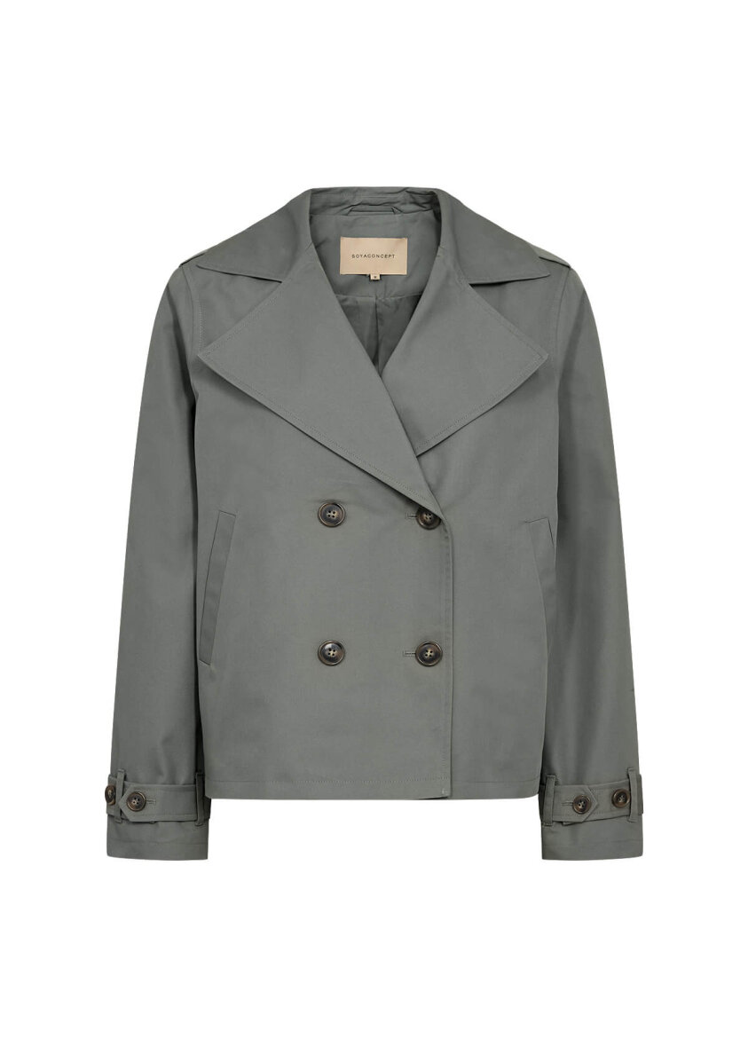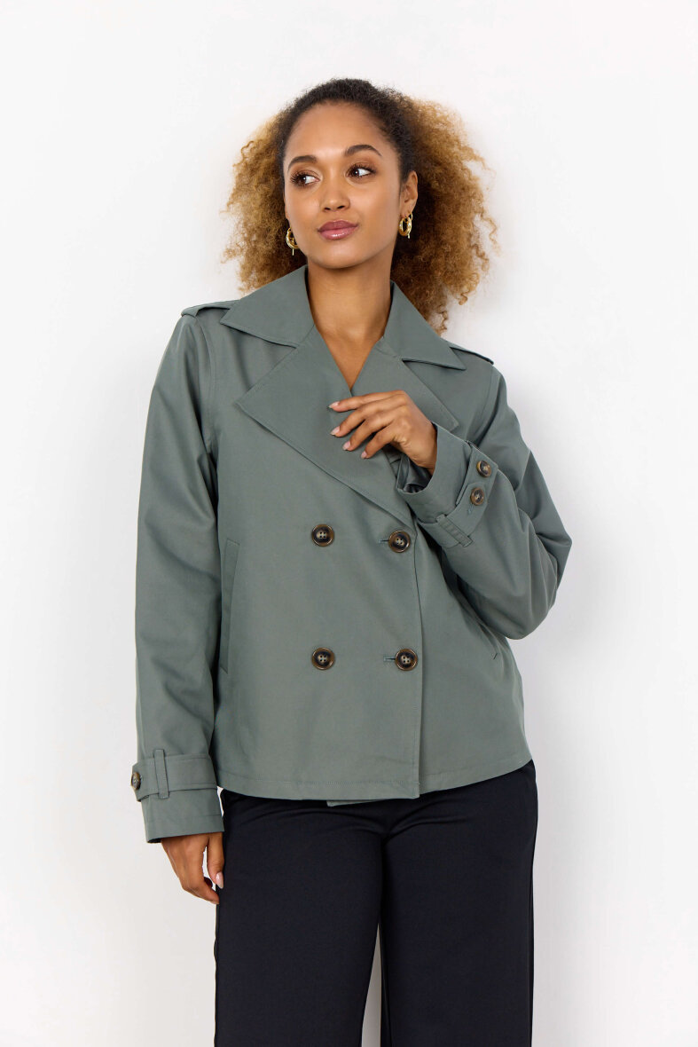 Smart kort trenchcoat fra Soyaconcept i et moderne grønt look. En stilfuld og let jakke, perfekt som sommer- eller overgangsjakke.