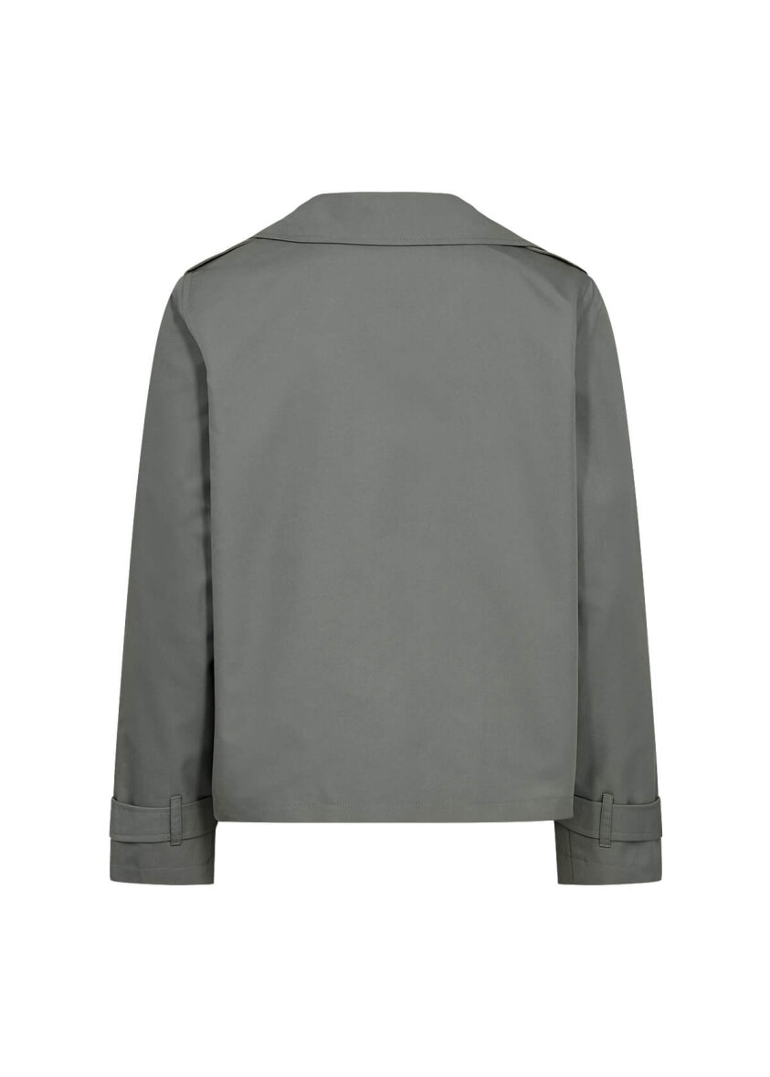 Den armygrønne jakke er lavet med revers samt fire store knapper, som giver den et klassisk og stilfuldt touch. Jakken er lavet i et klassisk trenchcoat design i en kort pasform. Jakken er lavet et enkelt design med to åbne stiklommer samt smarte knap og bånd detaljer ved håndledet.