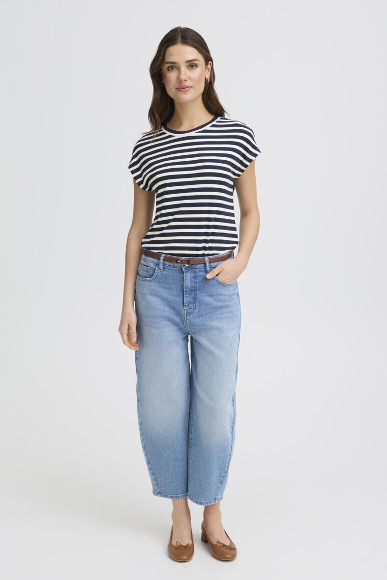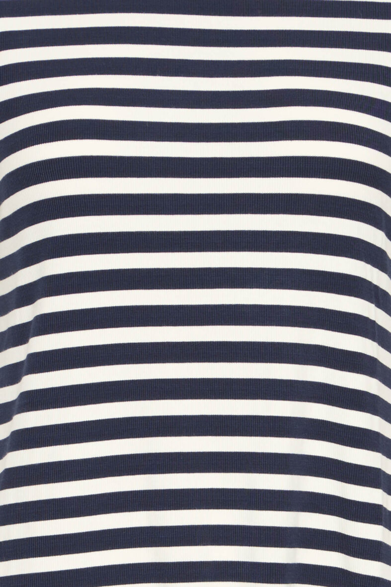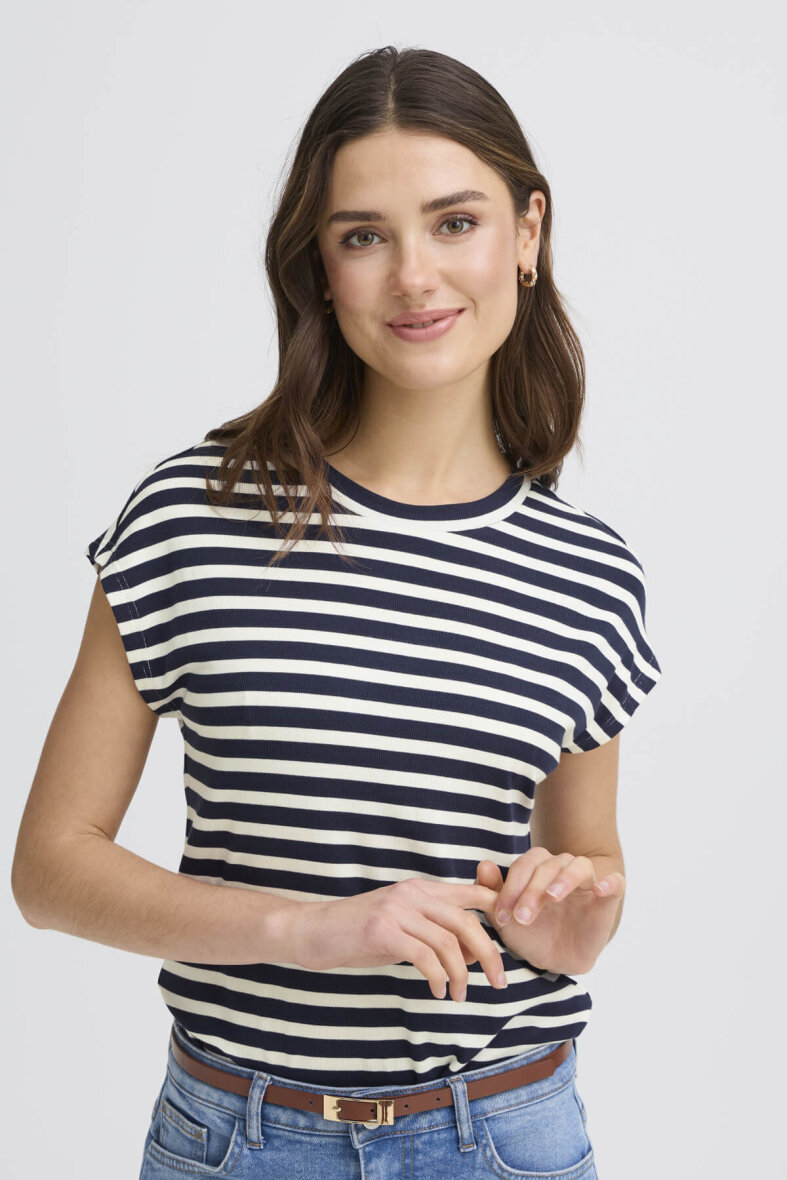 Fransa t-shirt i et moderne stribet design. Blusens enkle design i navy og off white striber er et must-have til basis garderoben, da t-shirten er har et hav af stylingsmuligheder.