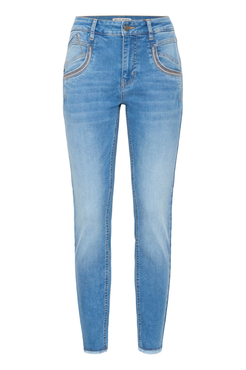 Disse jeans er lavet i et lyst denim design med fine detaljer ved lommerne såsom glitter tråd langs lommeåbningen foran samt synings detalje på baglommerne. Denne Carmen model er lavet i en flot lys blå farve, som er en alsidig jeans, som er let at kombinere med de fleste outfits. Denim bukserne er lavet i en god kvalitet med stretch, så de sidder flot og behageligt.