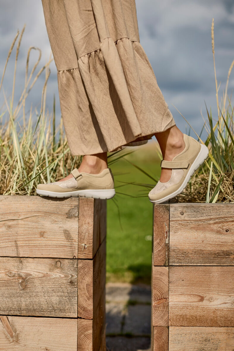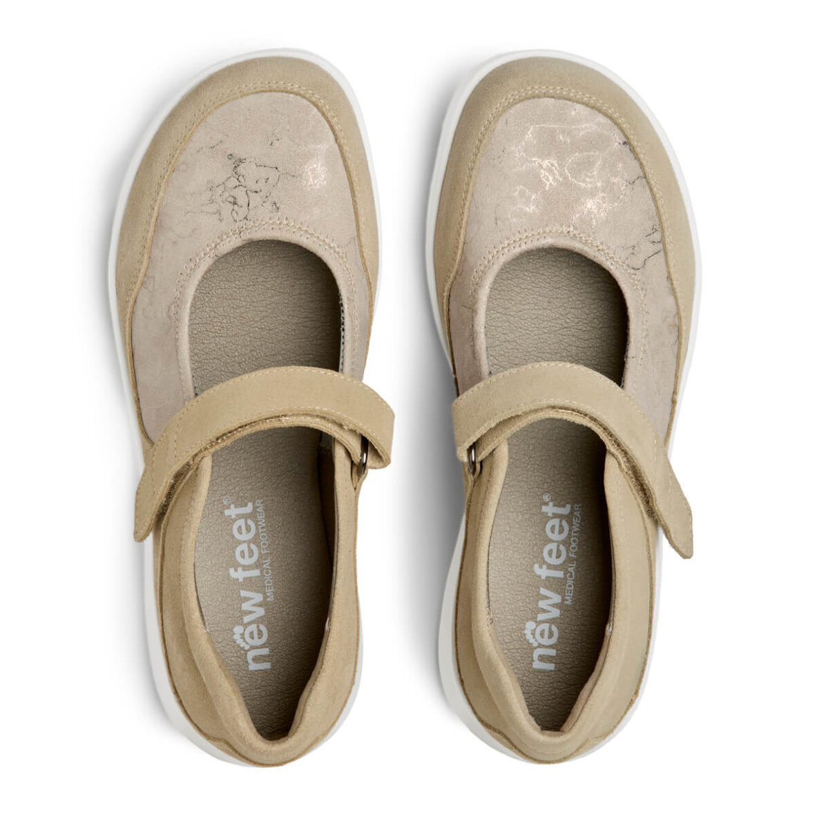 Flot og komfortabel sandfarvet ballerina fra New Feet. Skoen er lavet i glat læder med tekstil stretch på overdelen.
