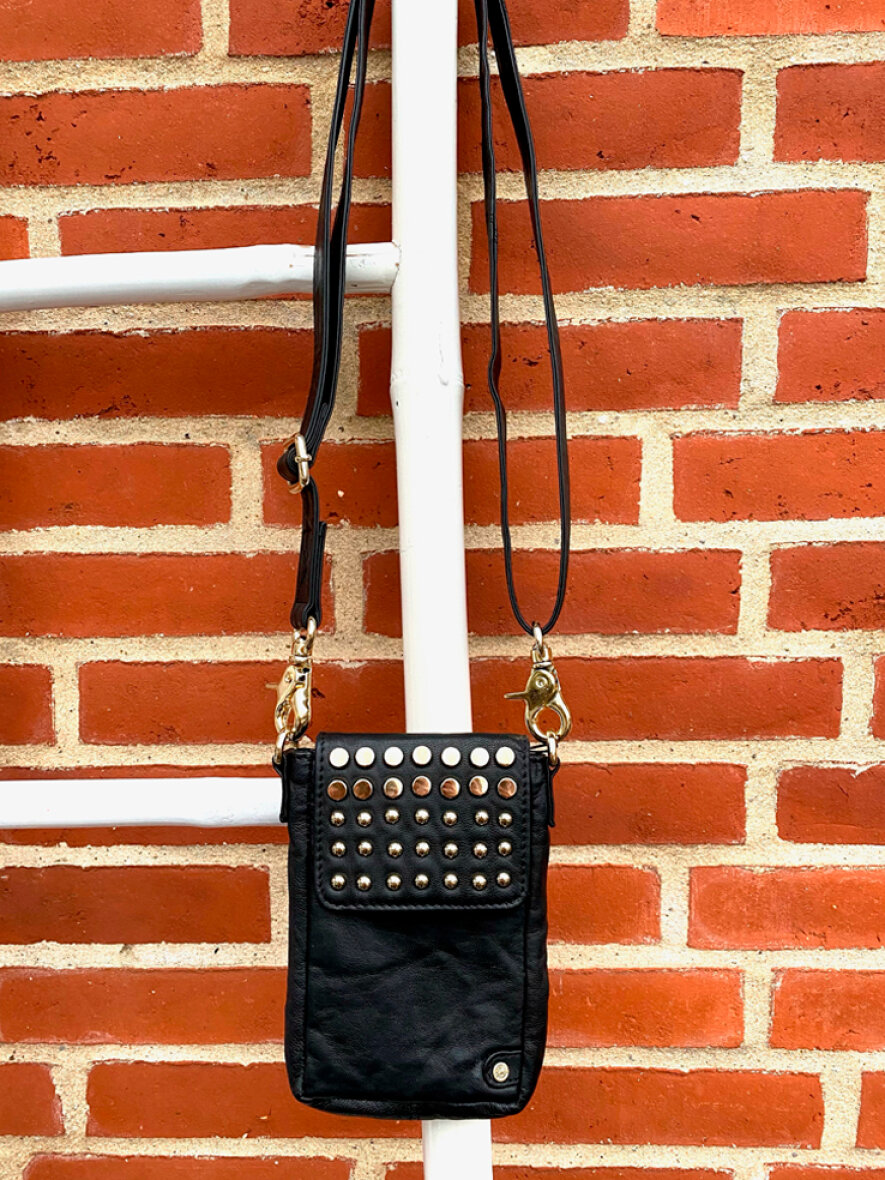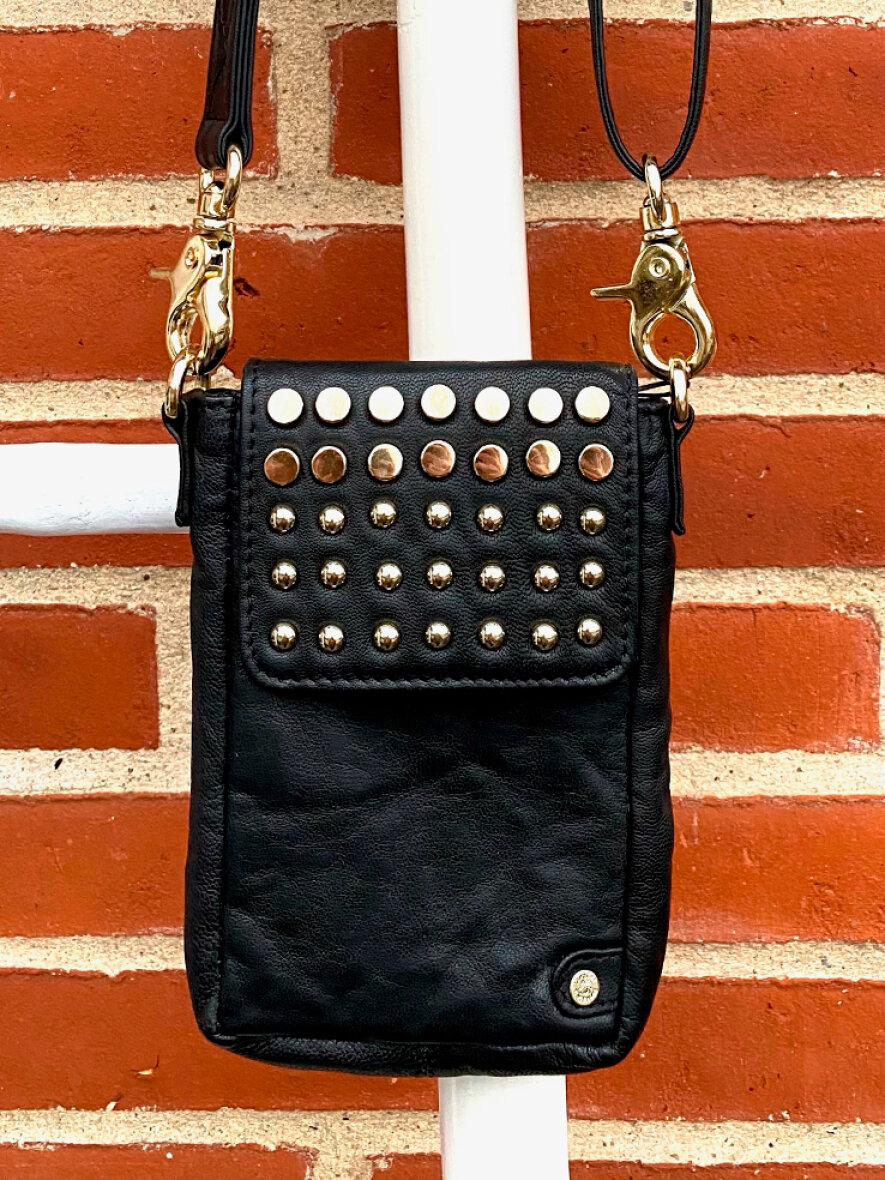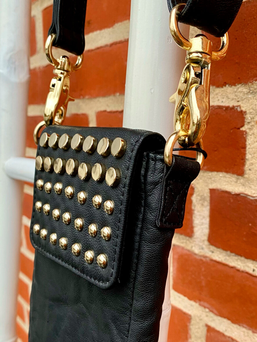 Mobiltasken har et primært rum der lukkes med magnetisk knap. Indvendigt har den tre smarte rum til kort. Tasken har en justérbar rem og er med fine "guld" nitter på forsiden. Tasken passer til alle mobilmodeller.
