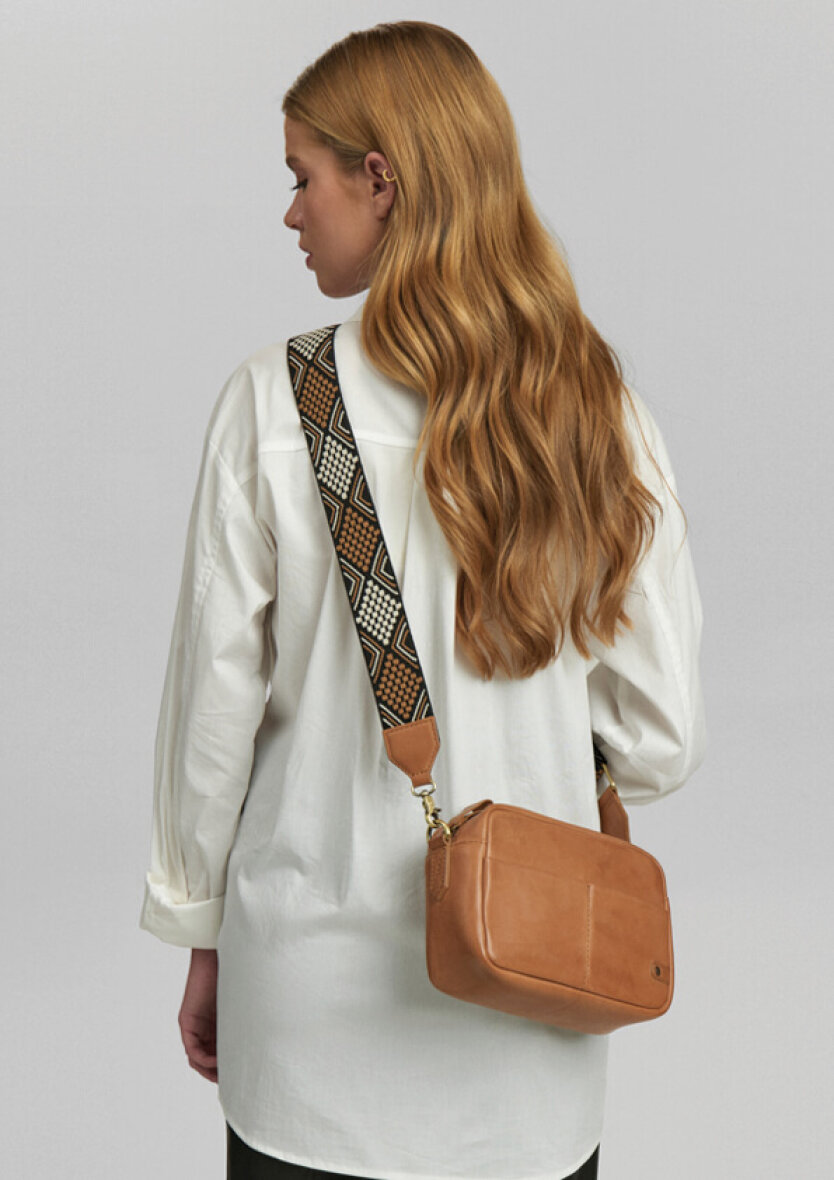 Brun crossovertaske fra Depeche i et flot lysebrunt design med en unik dekorativ lærredsrem i et smart mønster som komplementerer tasken.