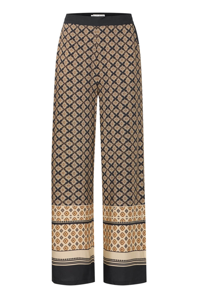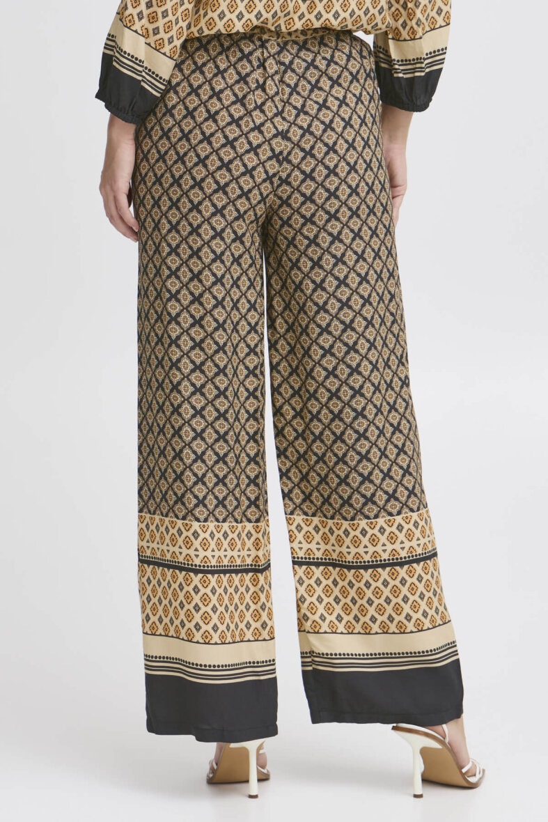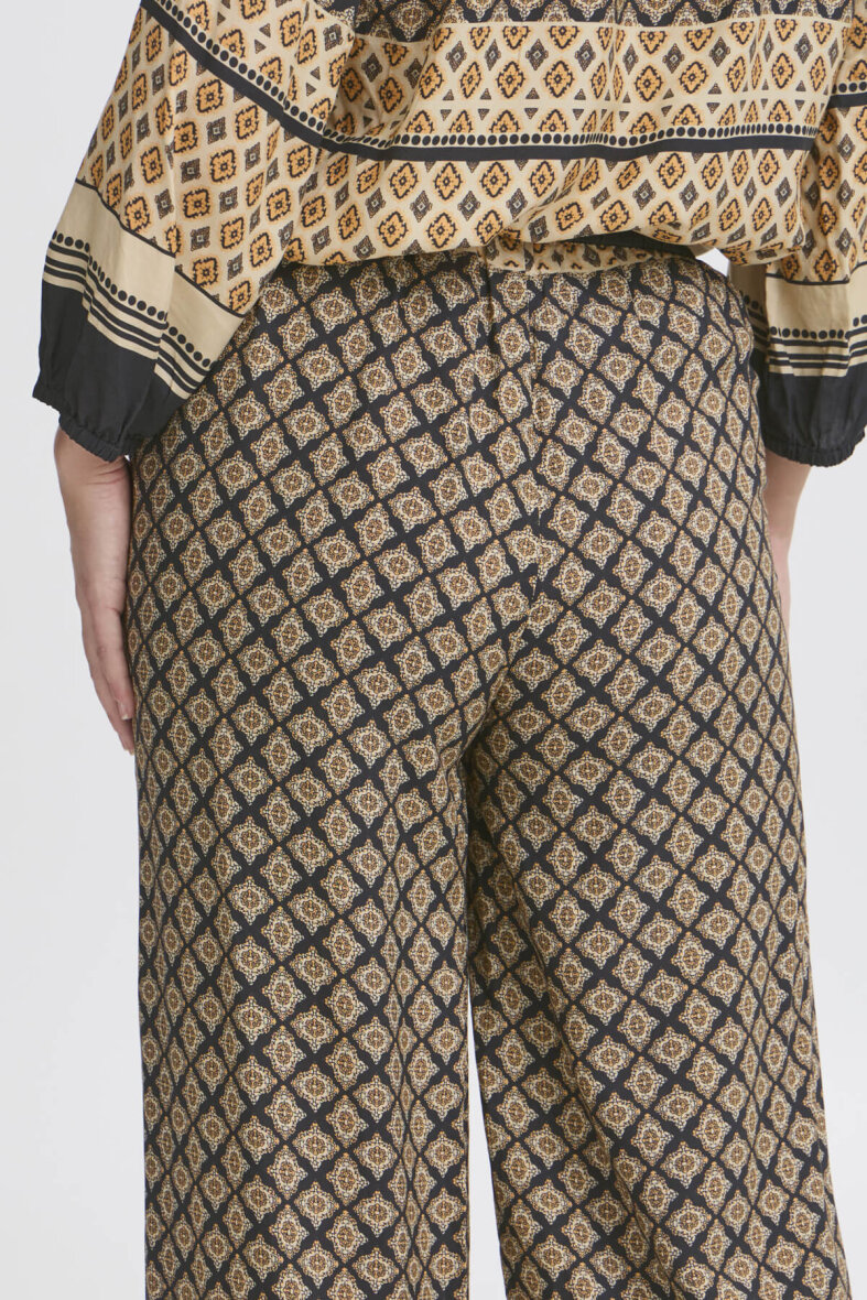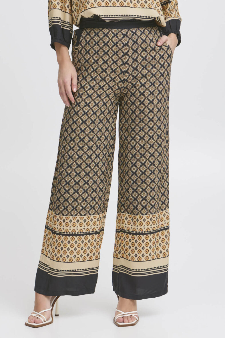 Smarte bukser i det smukke boho border print fra Pulz. Bukserne er lavet i et wide fit med brede bukseben.